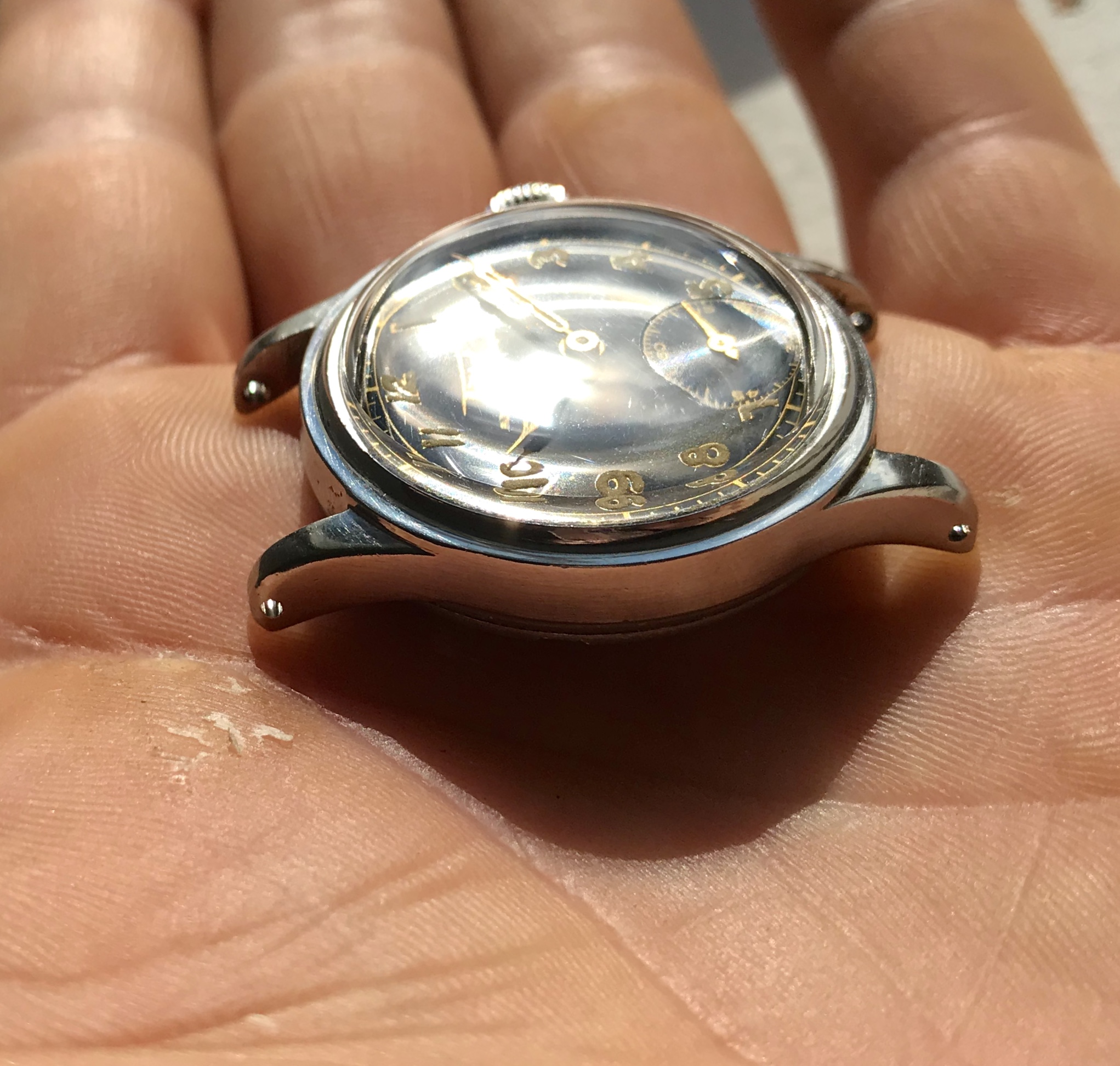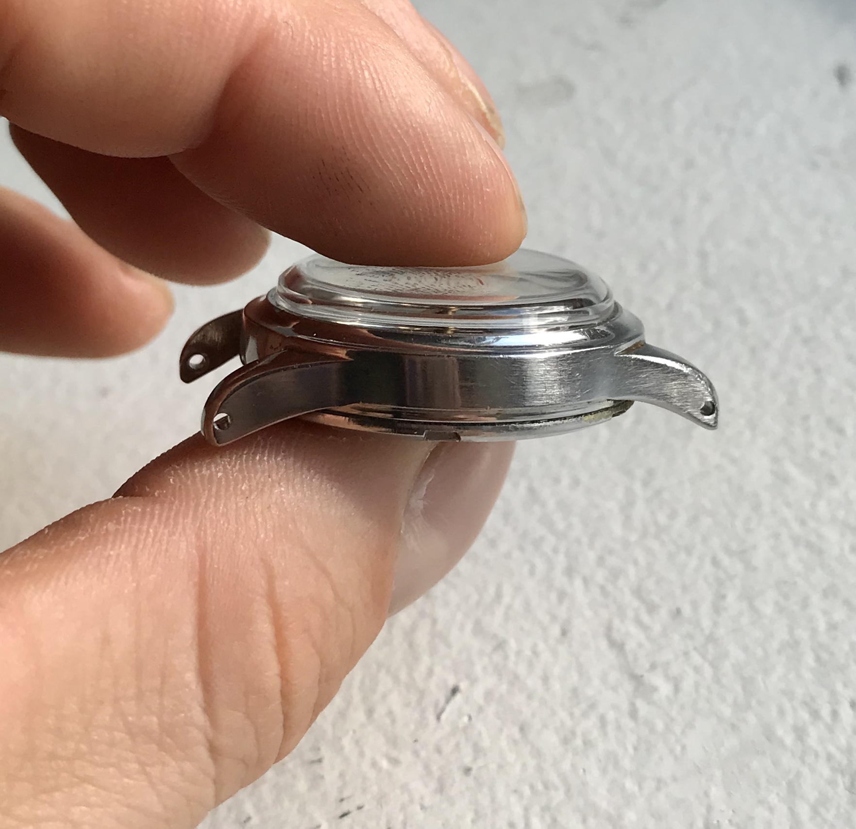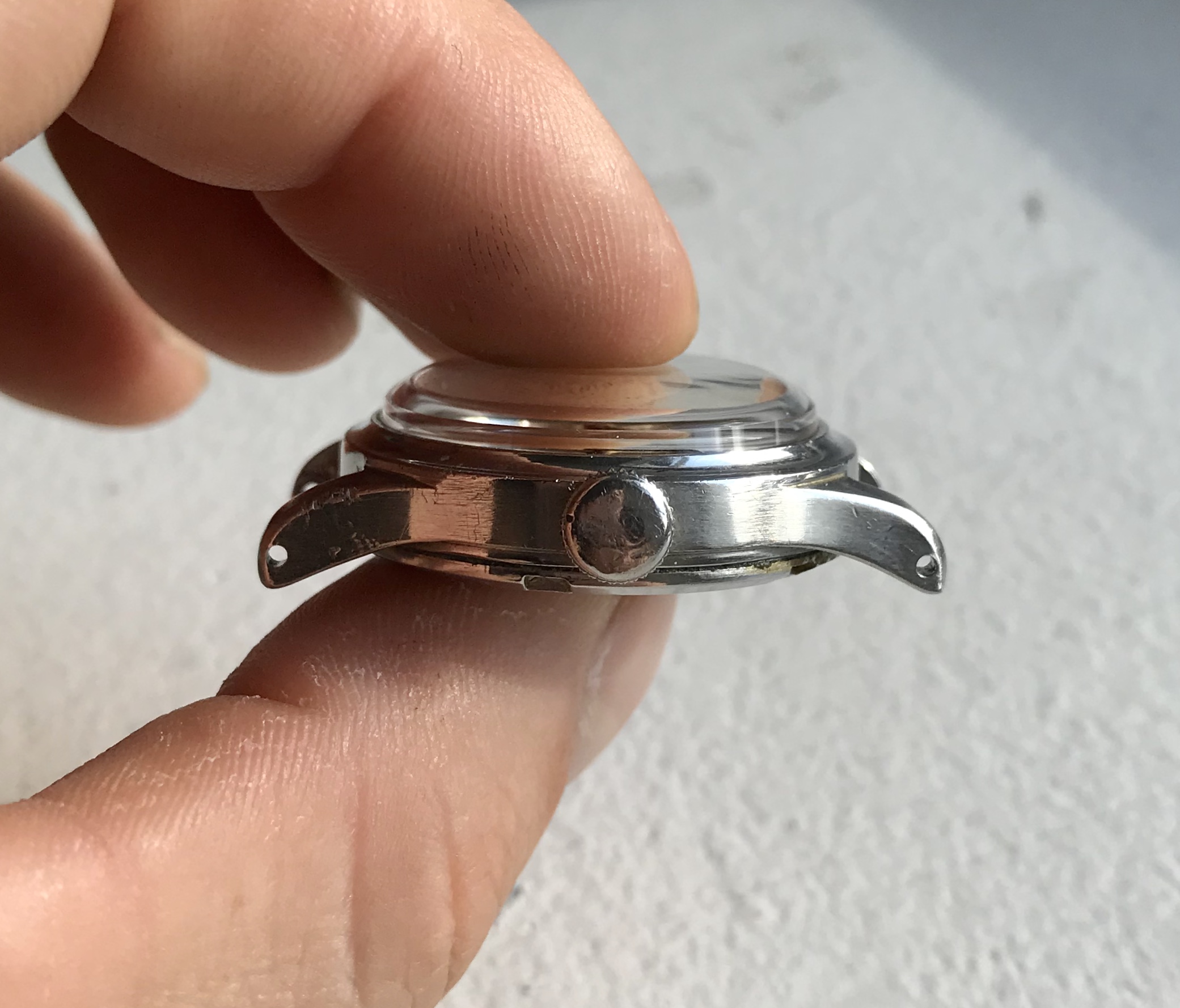 Case measuring around 31mm excluding the the original crown (what I belive, they wear not signed at this time). And is what some may call an "stepped case", but to my eye the steppes are not completely 90 degree angled so I wont make that statement.