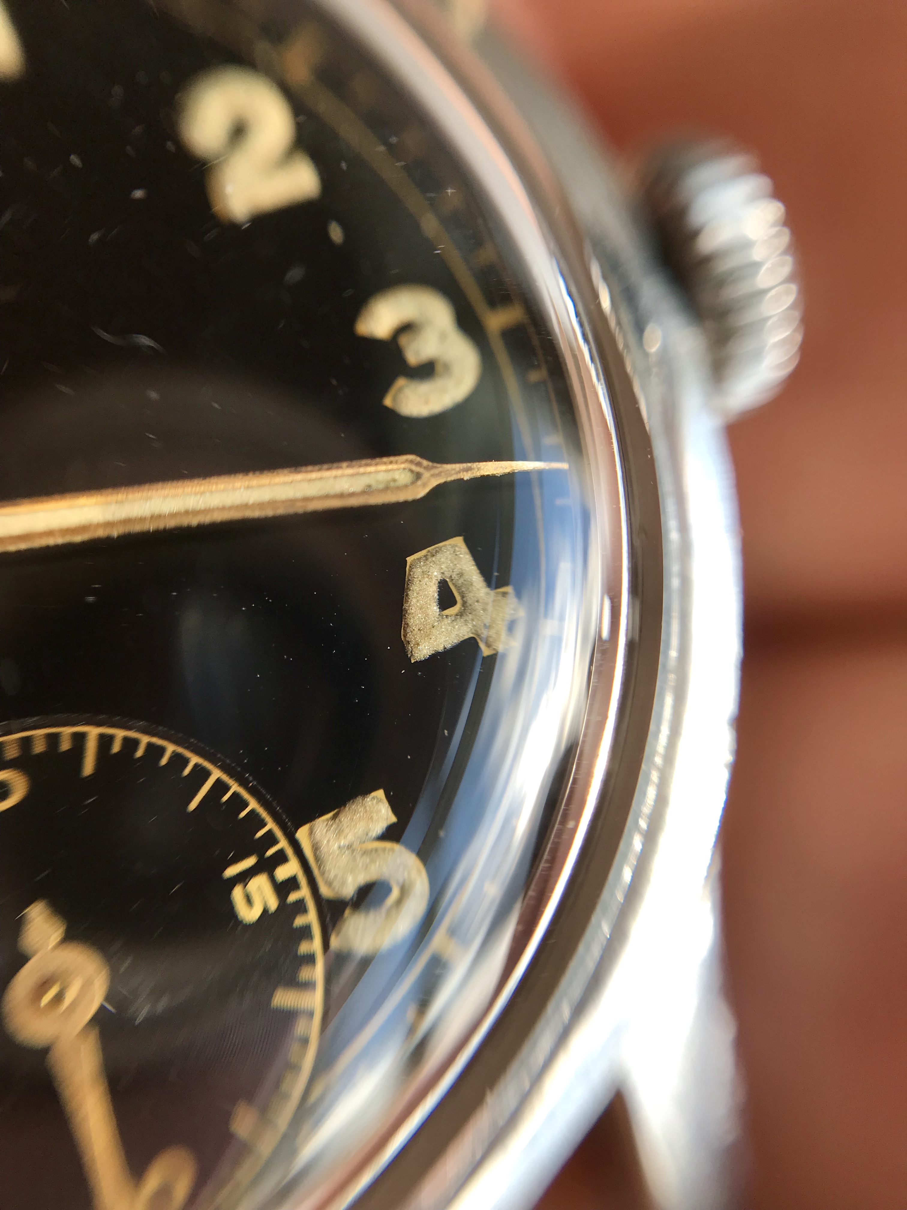 Dial is perfectly glossy black and all the radium is all puffy and intact including then hands. Dial and hands are all original and untouched. Hard to catch how good this dial actually is on camera.