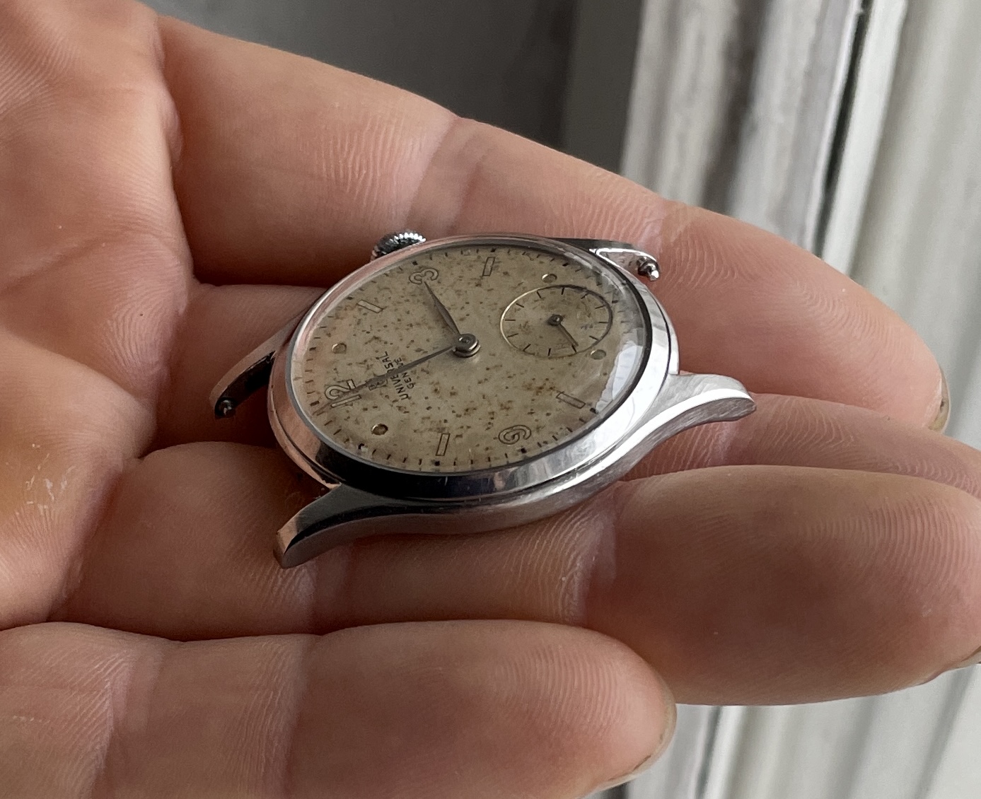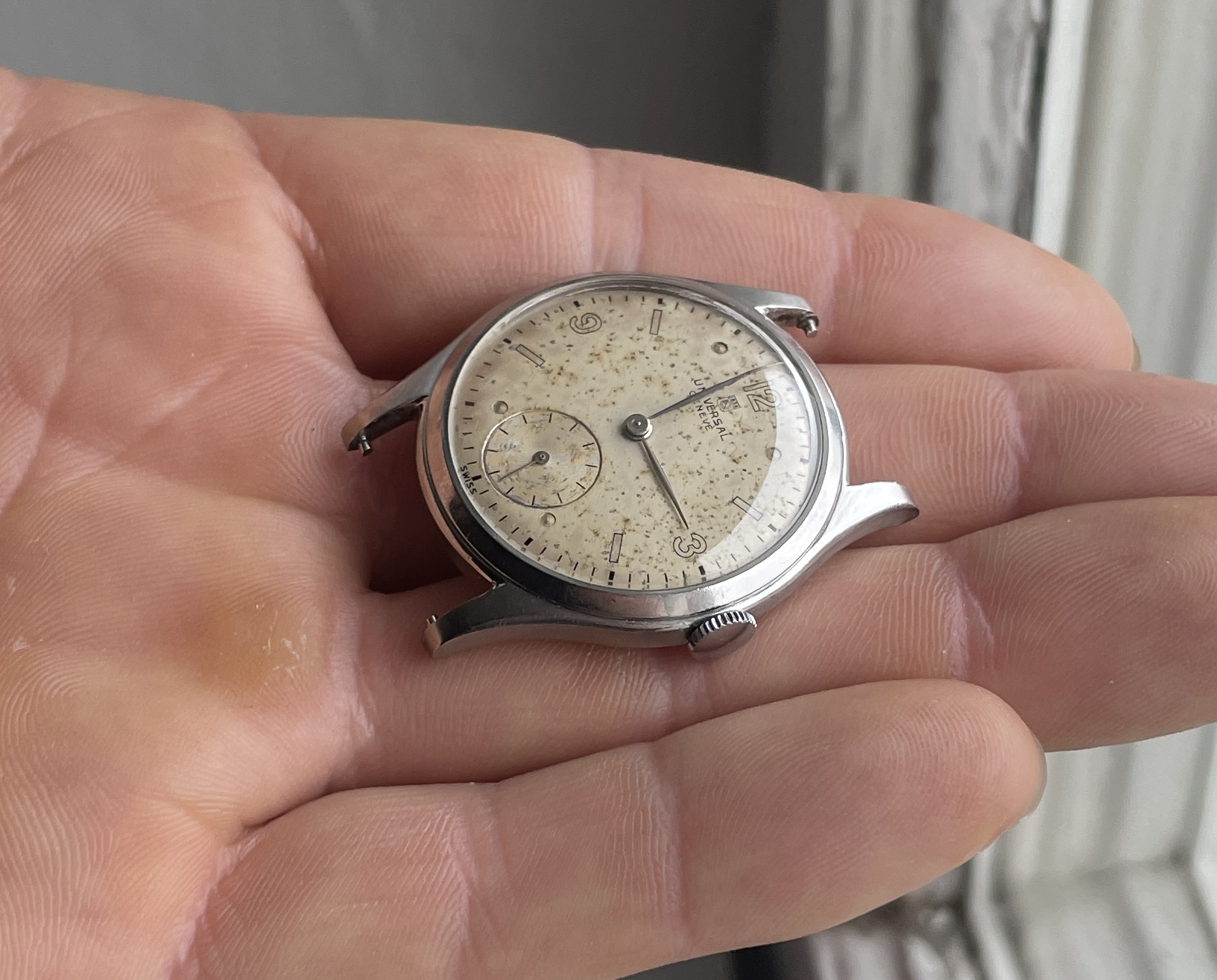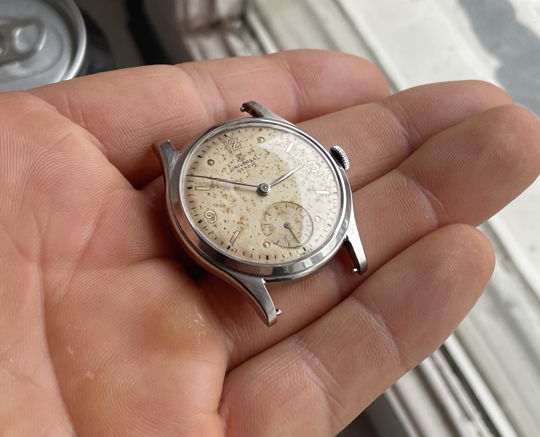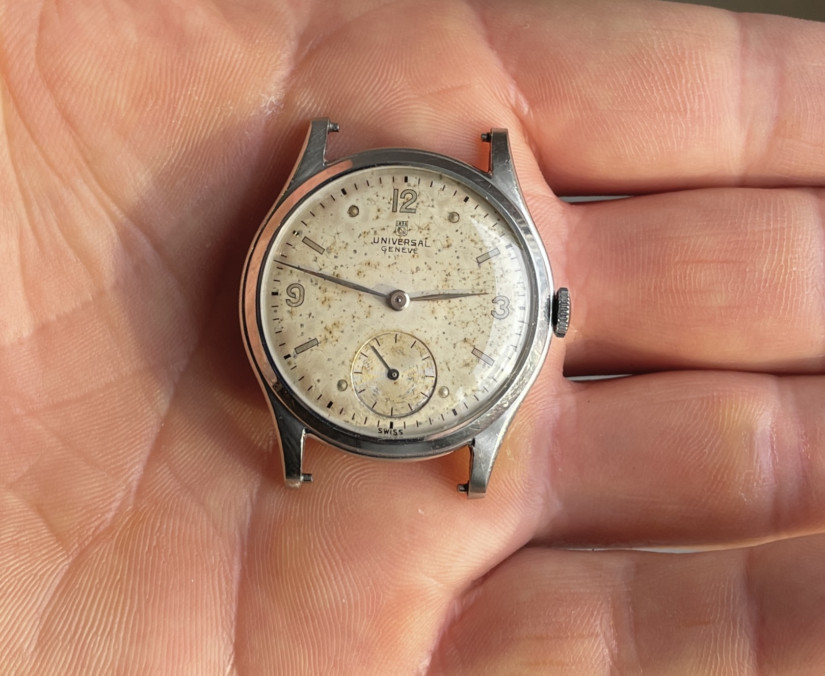 Dial has lots of patina though, nice mirrored numbers and indices with matching no lume steel hands.