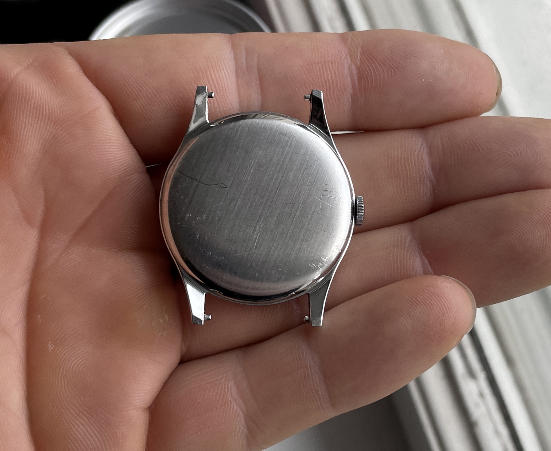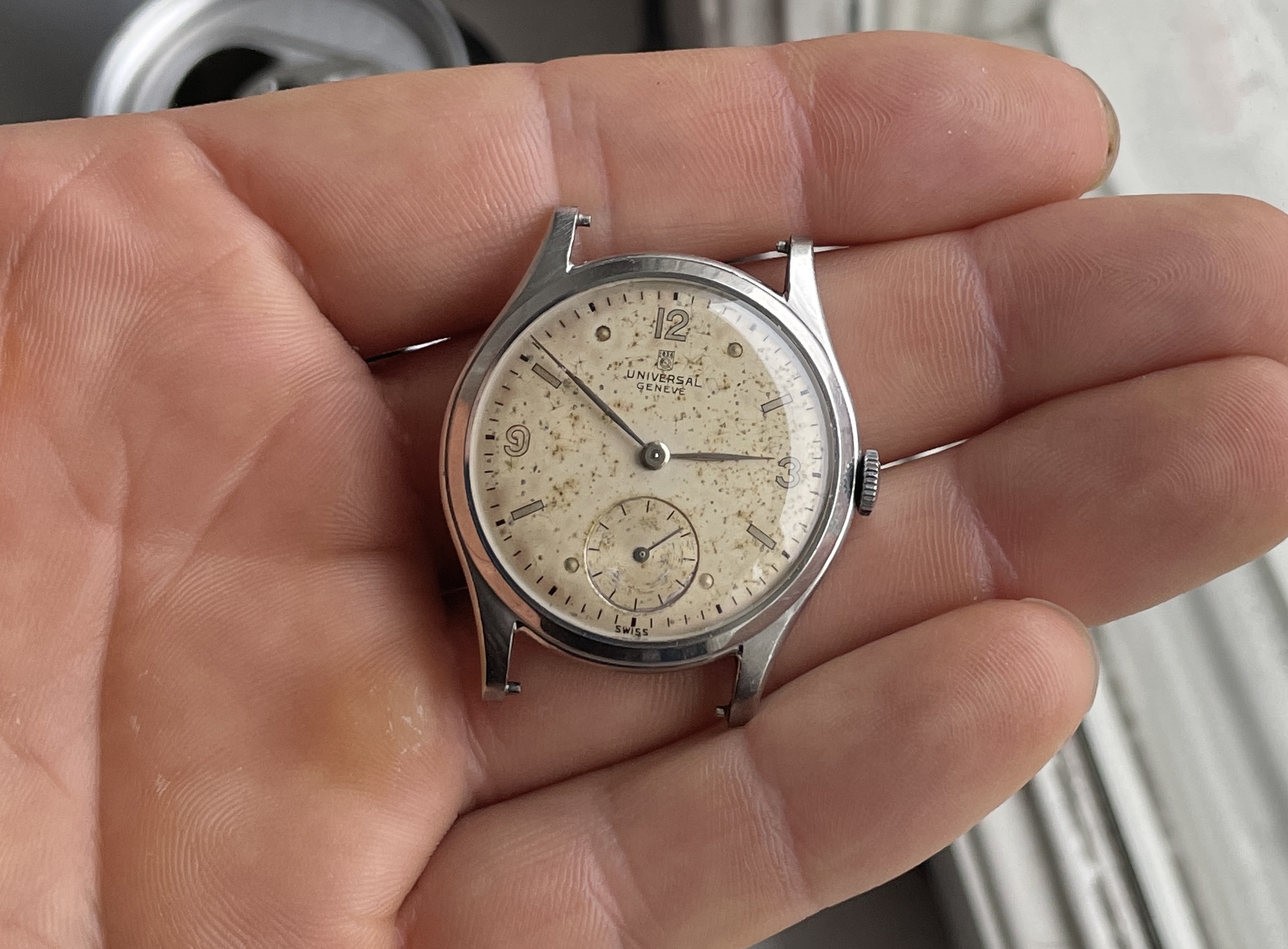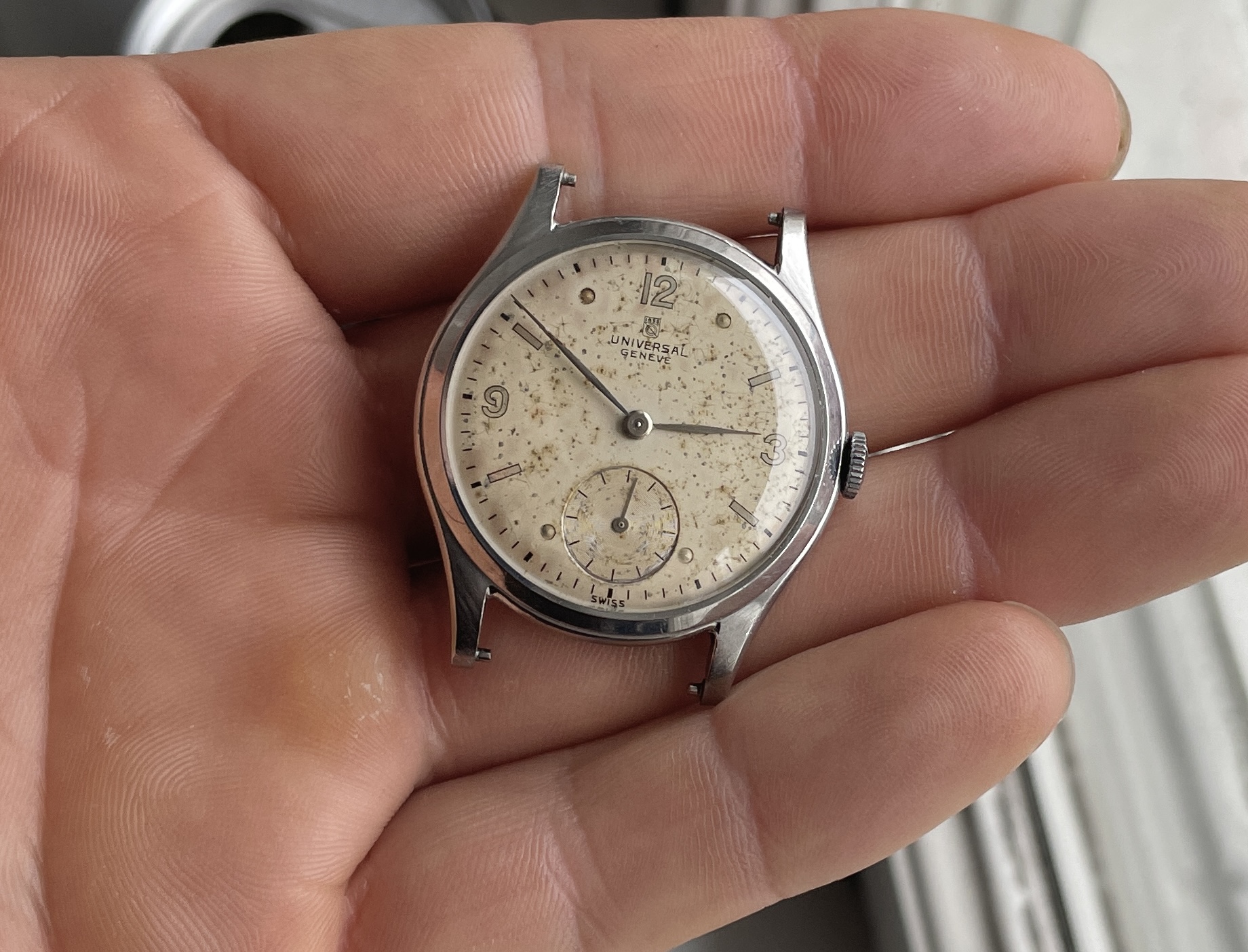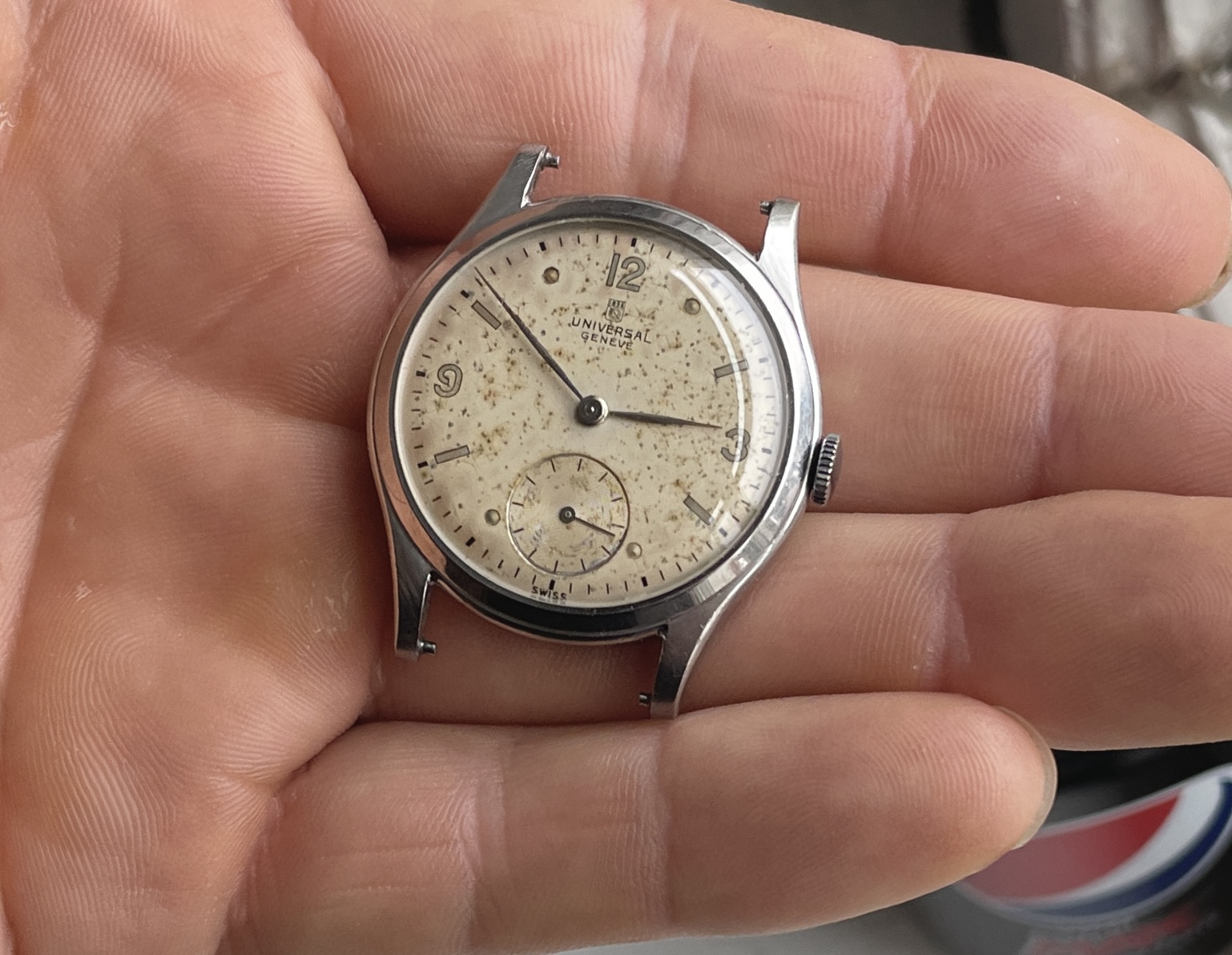 Dial has lots of patina though, nice mirrored numbers and indices with matching no lume steel hands.