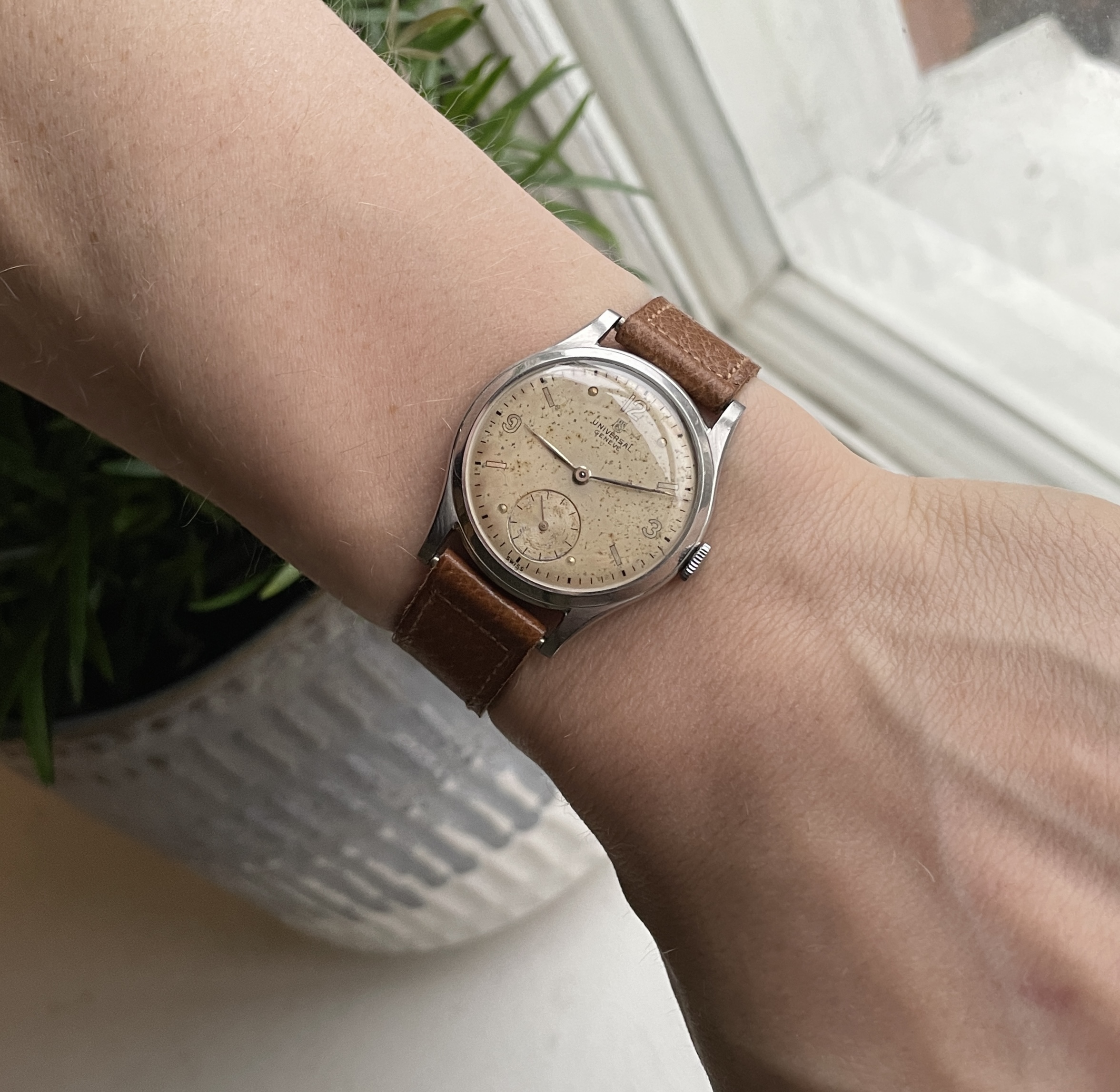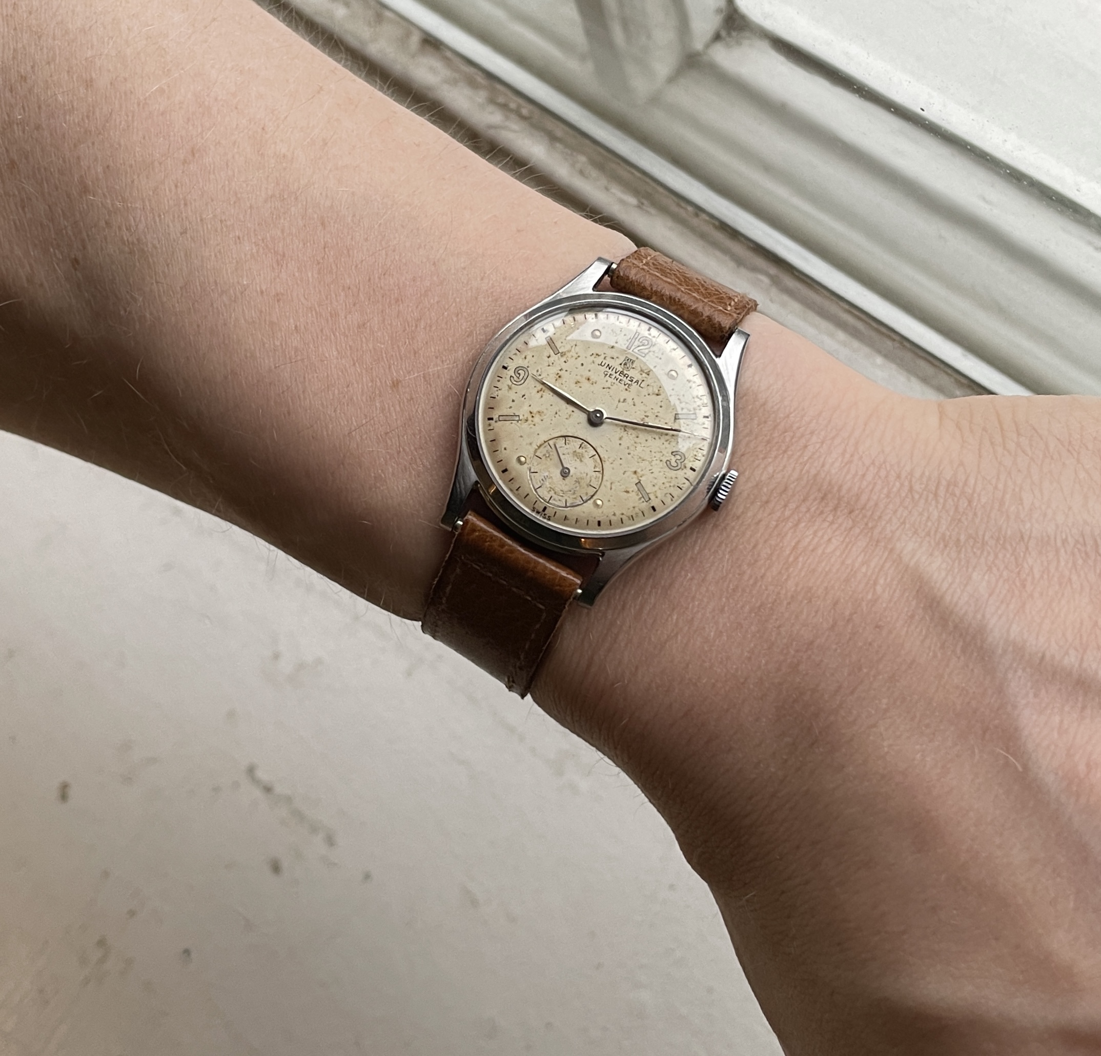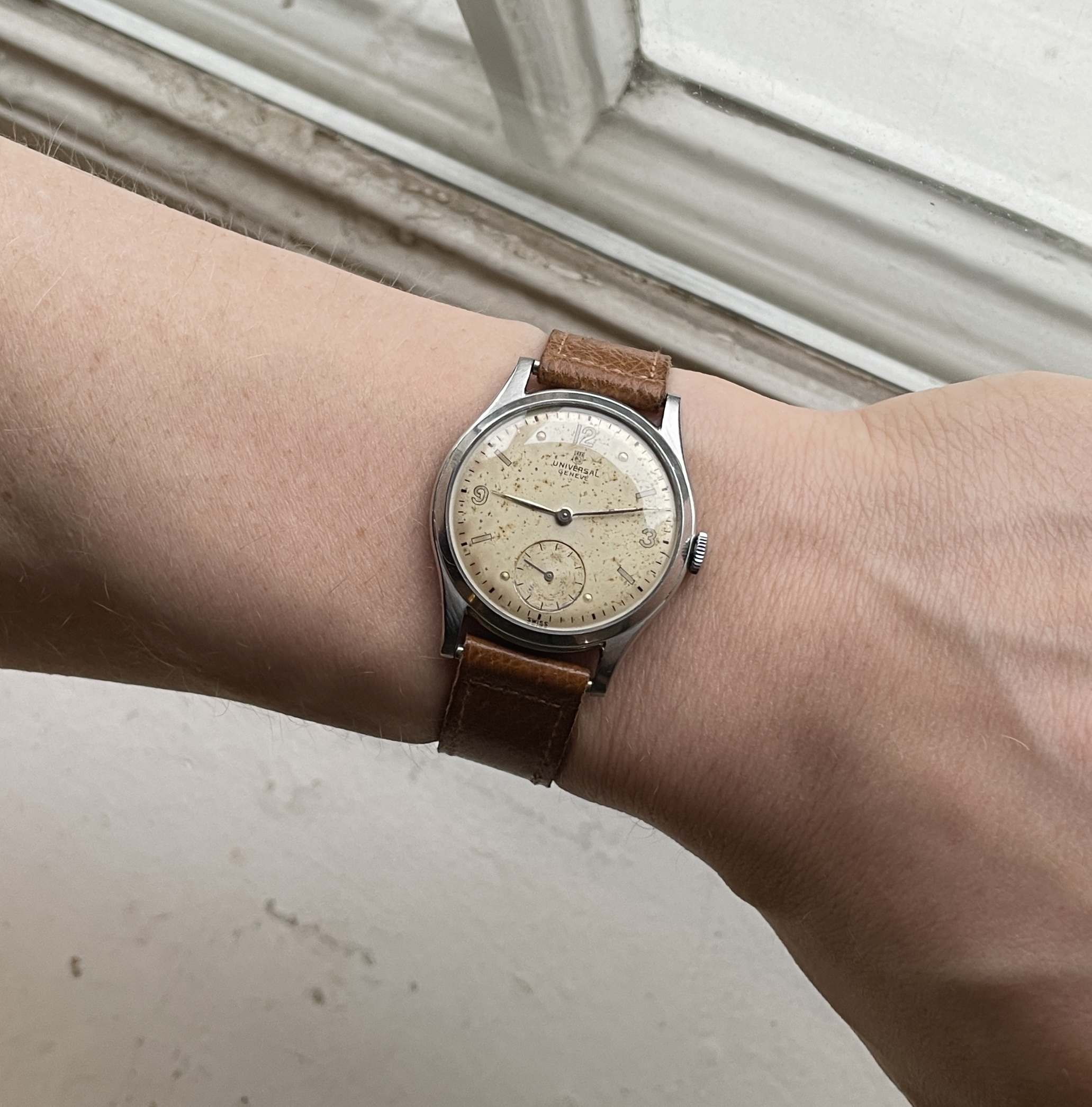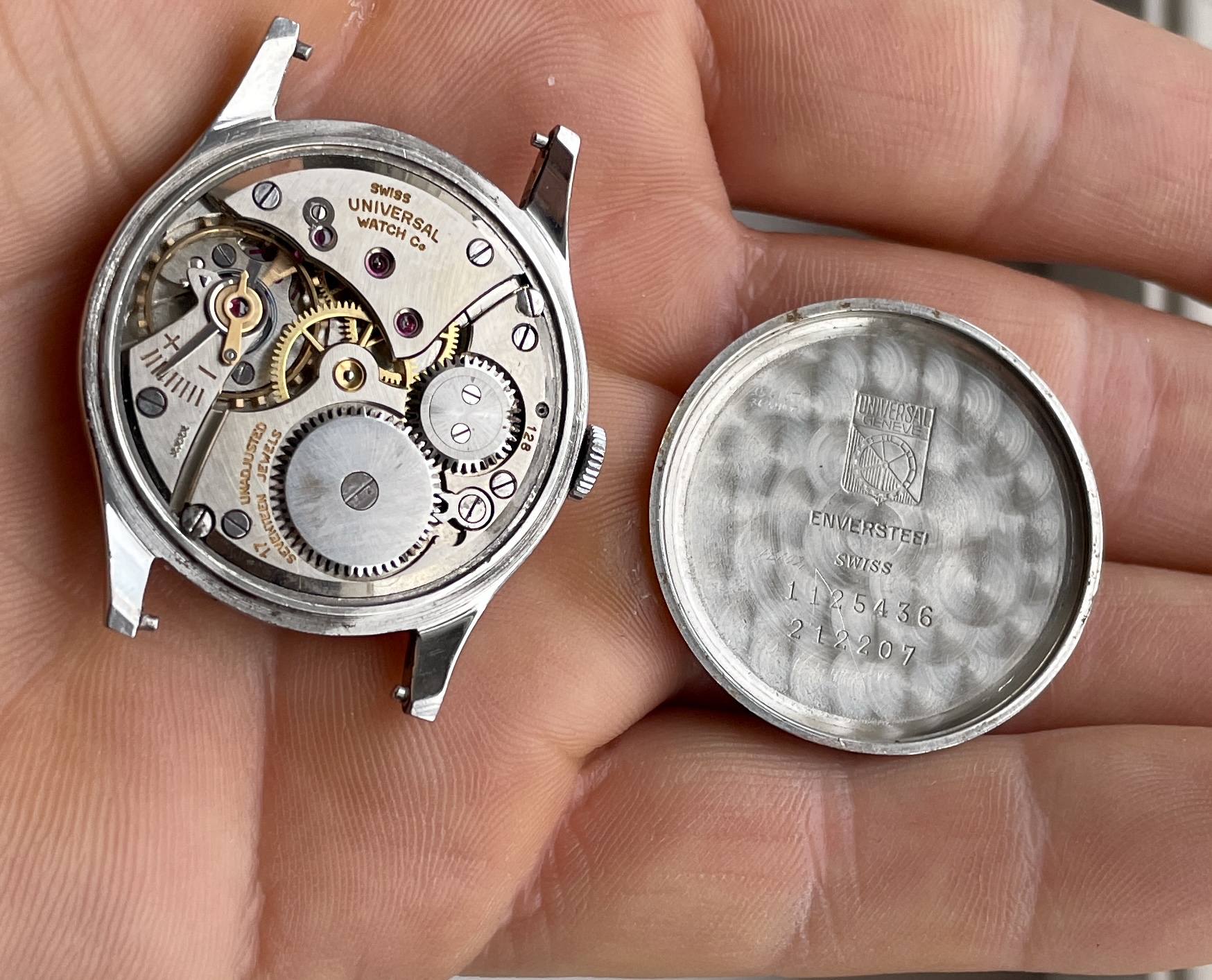 For sale is a sleek stainless steel Universal Geneve ref 212207 produced in 1945 if I have read the serial number correctly.