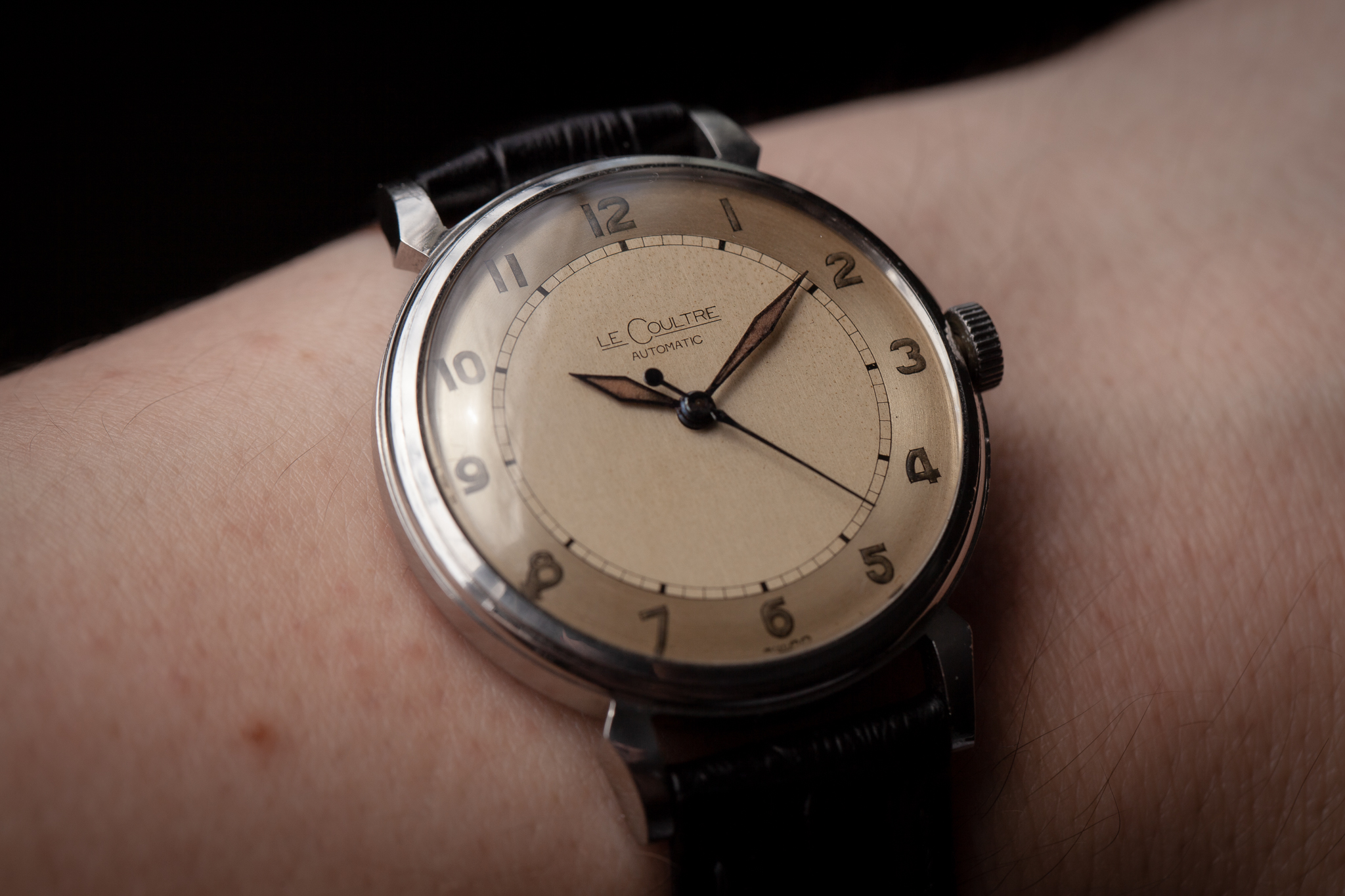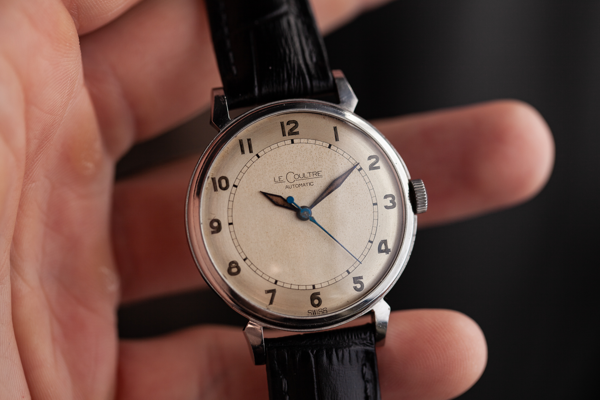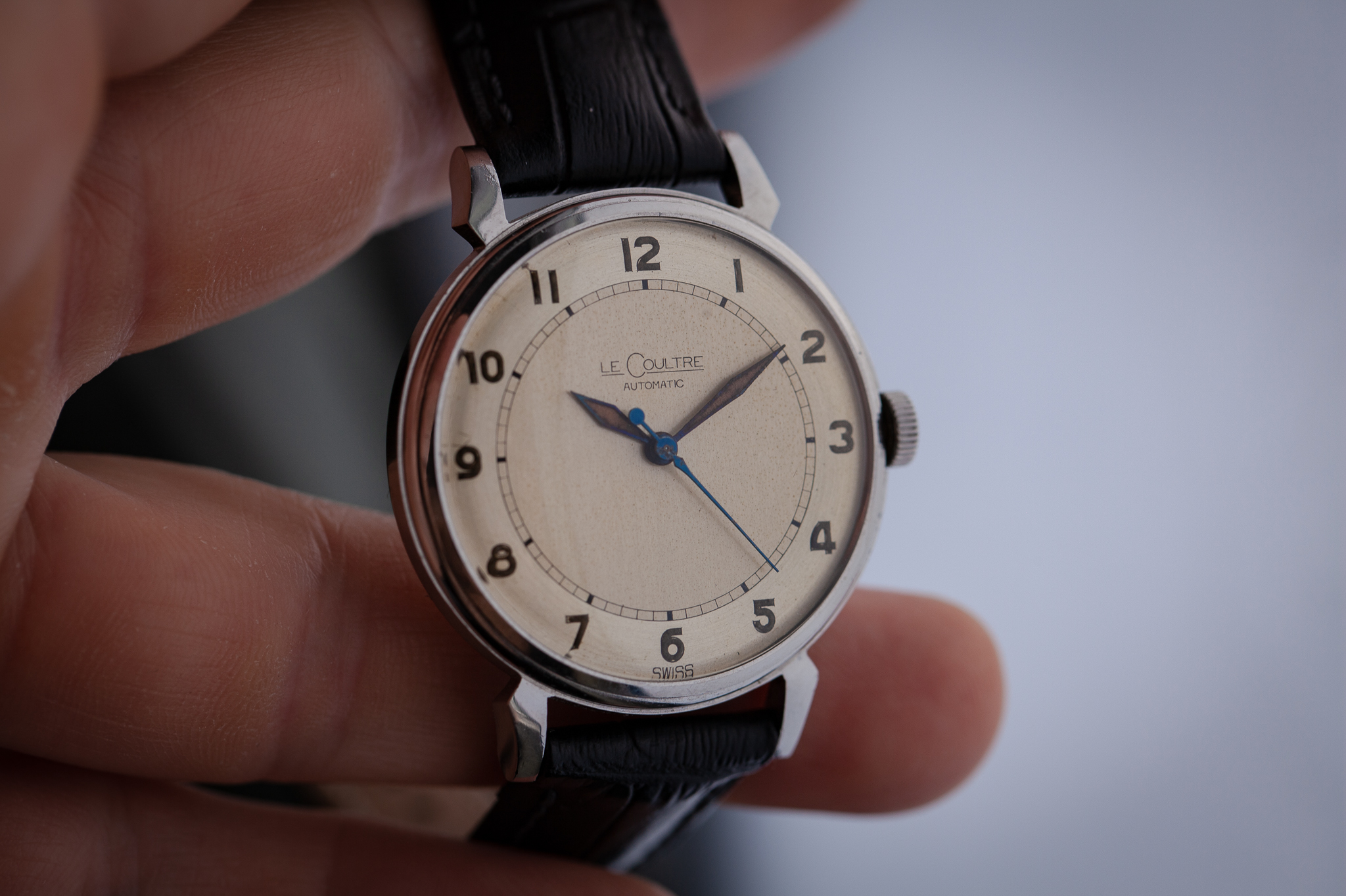 Dial: I think you’ll agree it’s beautiful. Two toned vintage dial. There’s microscopic patination best seen on macro shots, even across the dial. Arabic hour markers are all in great condition. The “LeCoultre” logo is without wear. There are some small scratches around 9' o'clock, only visible at certain angles.