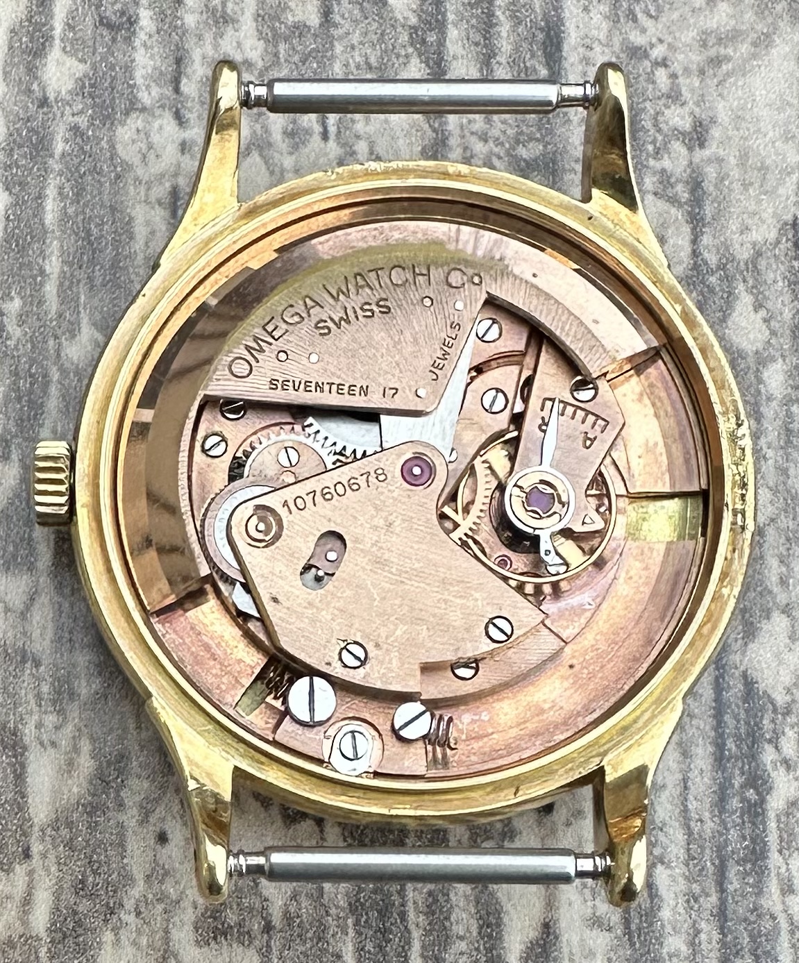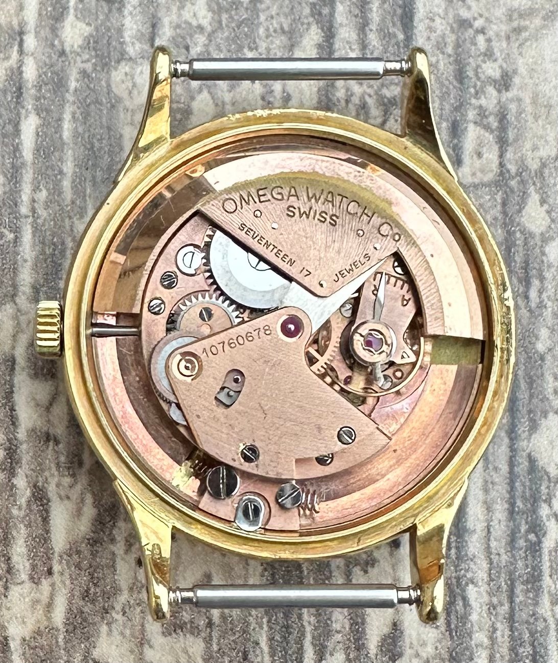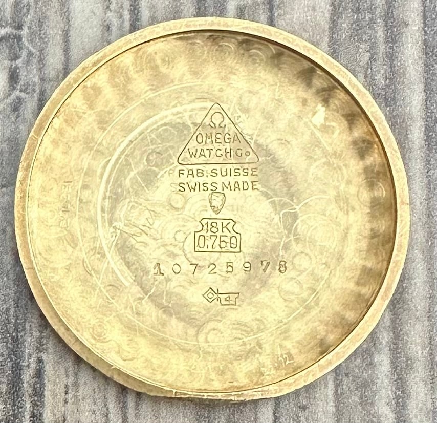 Offered for your consideration is my 1948 Omega Centenary with the original box it came in. This watch was worn and loved as intended and not abused. The 18k dial shows a spot at 3 o’clock and a few between the indices at 1 and 2, otherwise it is retains a beautiful gold look and even patina. Hands are original and flawless. 18k gold case is in beautiful condition with a very tight caseback fit. The movement being the cal. 30,10 RA PC JUB, is keeping great time as it should while setting and winding smooth, bumper auto winder working as it should as well. There are clear signs that the auto rotor bearing failed in the past but was replaced sometime in its life. There are several service marks on the inner caseback so we do know it has seen serviced in the past but has not been serviced since I have owned so I would recommend new owner have it serviced for their own piece of mind however zero issues since in my hands.