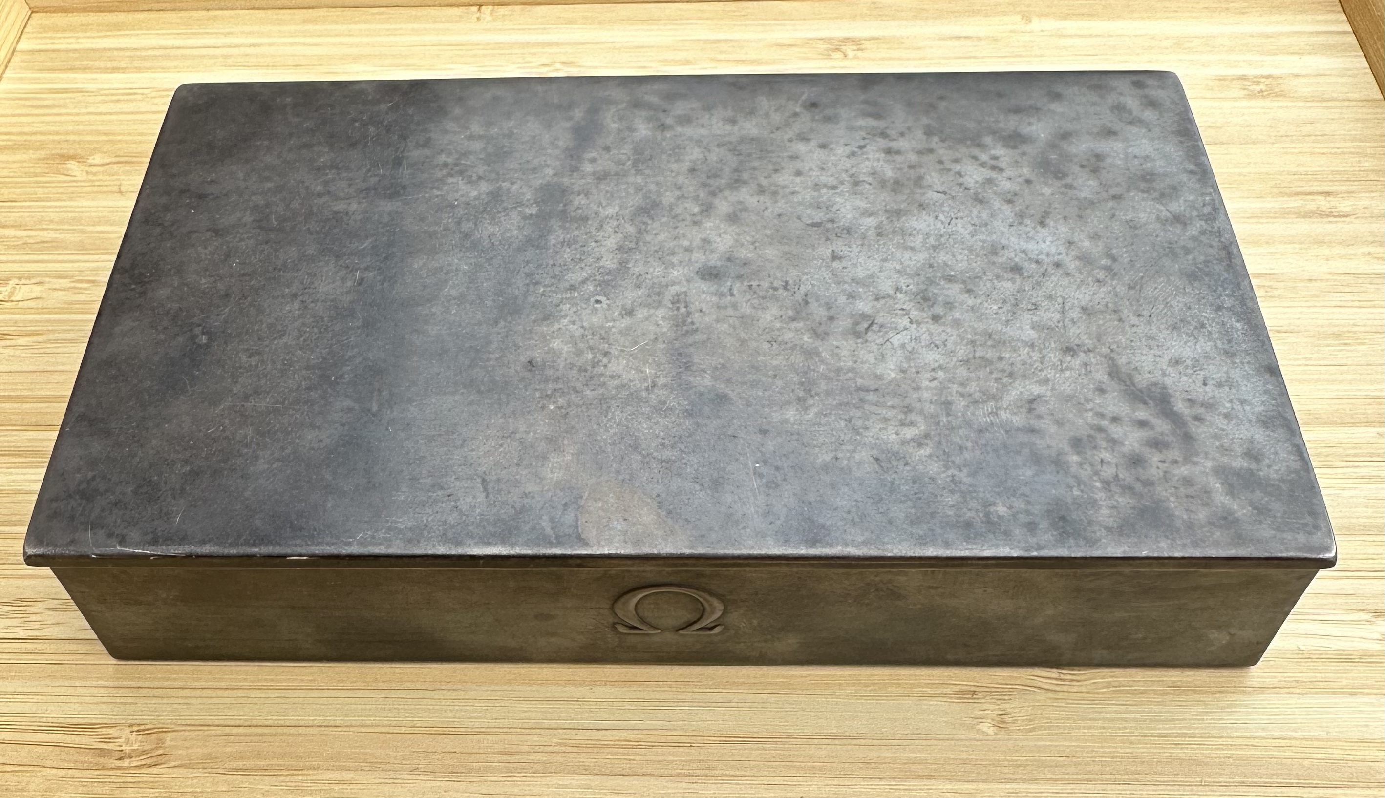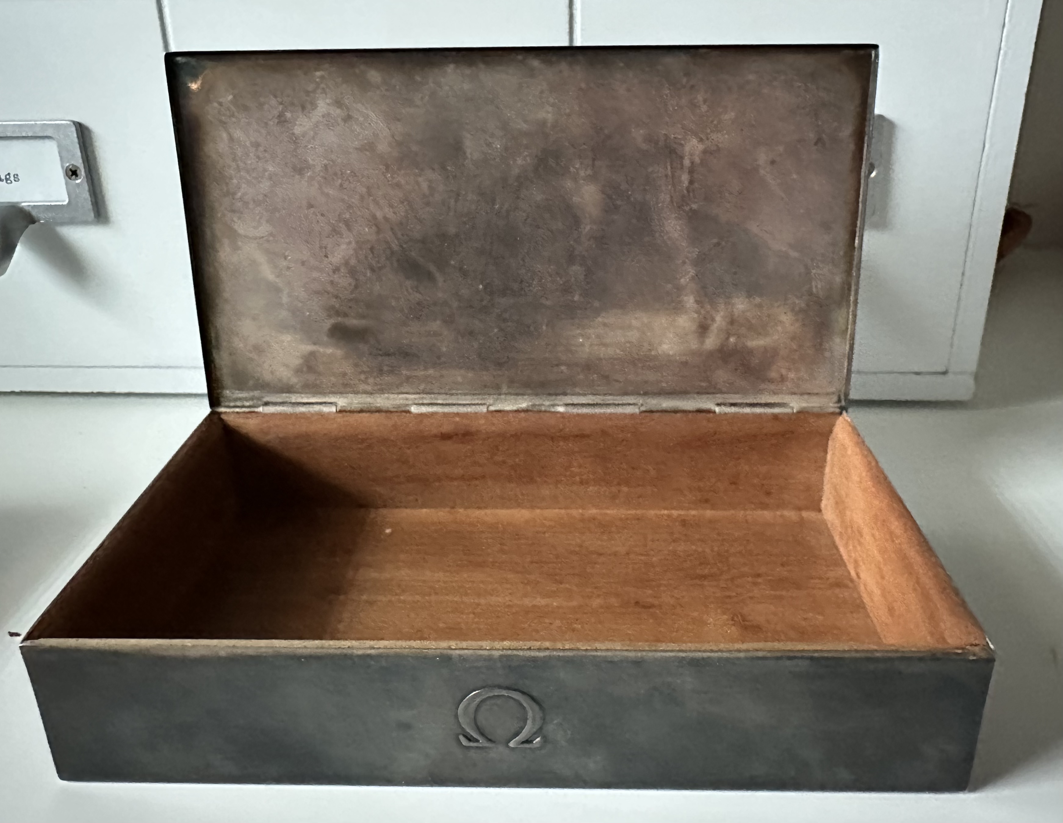 The Omega box this watch was delivered in is the first variant .800 Silver Omega Jezler smooth top box. Like nearly all watch boxes we see, the inner tray and lid are missing. The original owner used the box to store his old silver change from pre 1964. I have chosen not to polish the box and it has a rich patina. If the new owner chooses to polish the box, one can expect a beautiful silver sheen after the patina is removed. I like the aged look, others might not.
