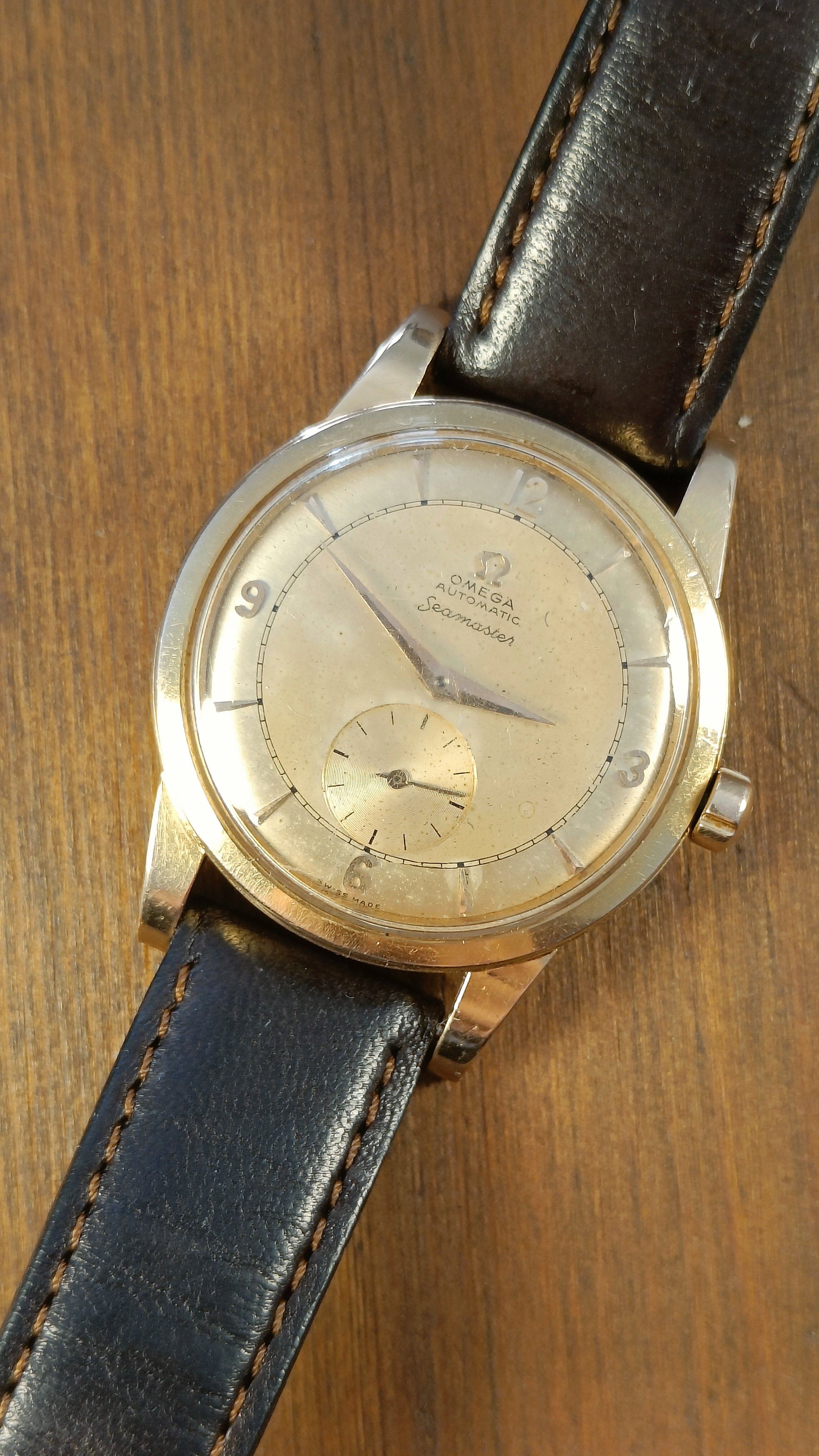 The serial number places the watch as being made in 1948, if I'm not mistaken. It has a solid 18kt gold case, "beefy" lugs, a 36mm width, and the 342 calibre movement is running and keeping time nicely (only -12 seconds per day). Although a service and a new gasket are recommended.