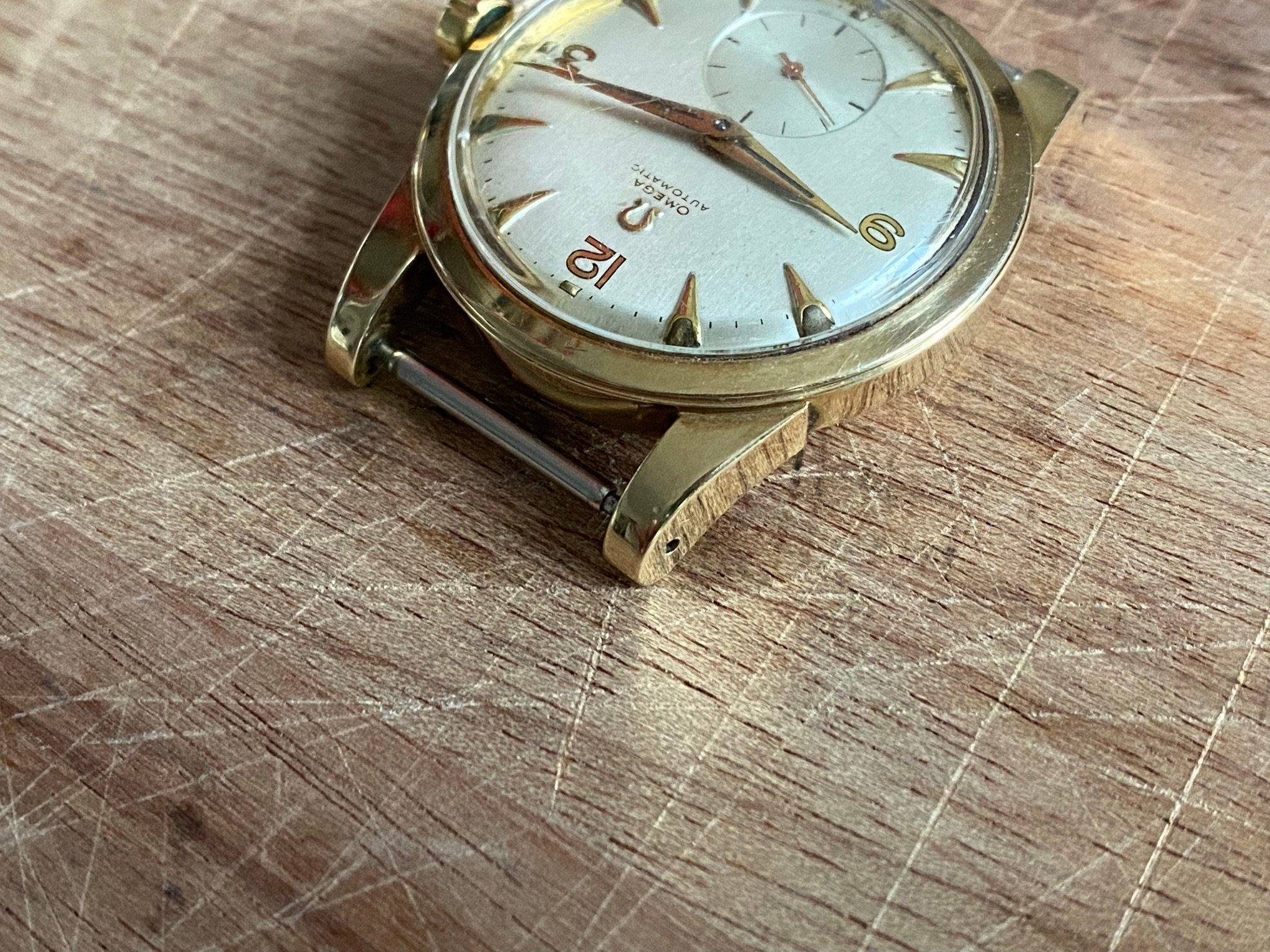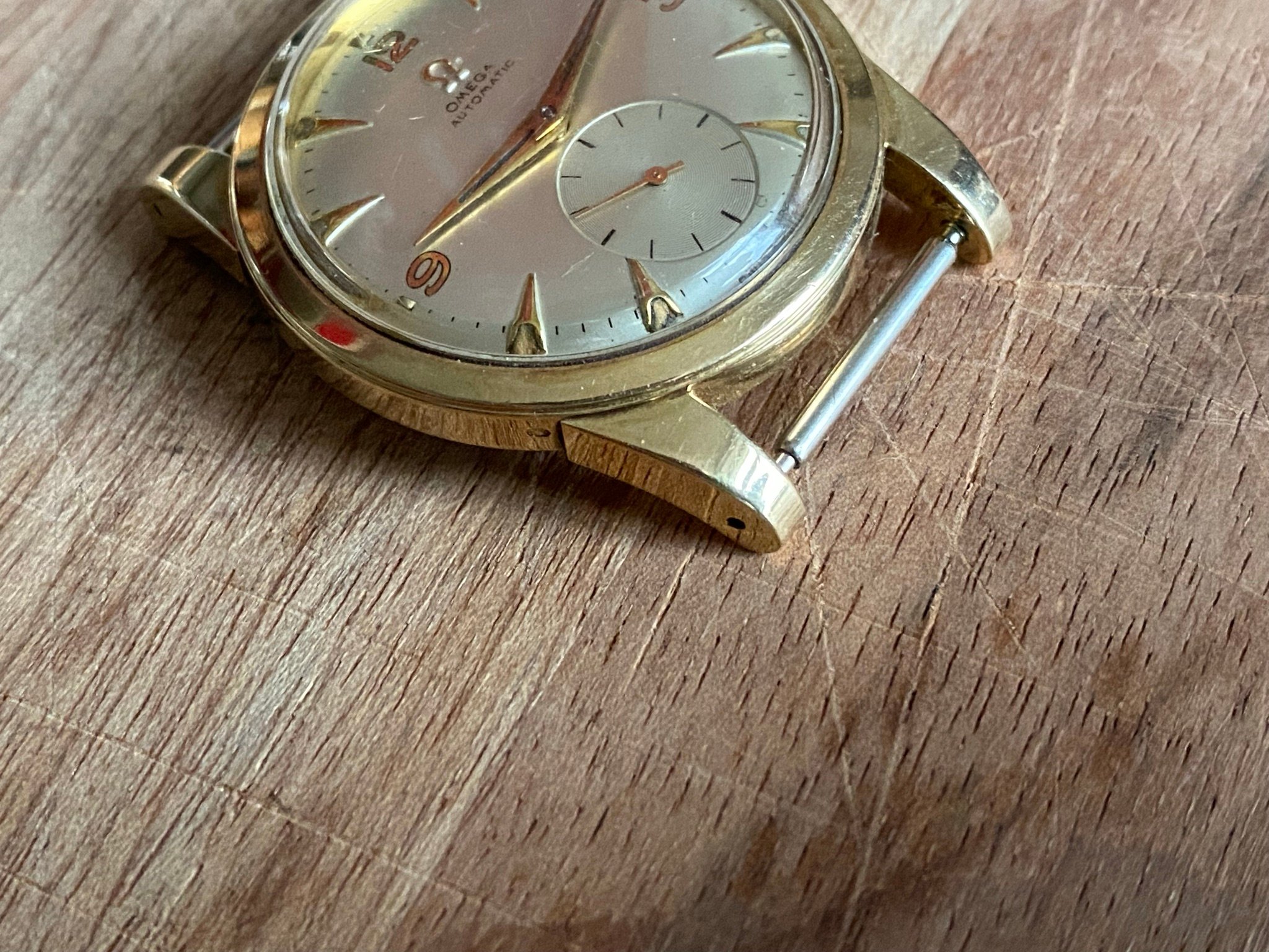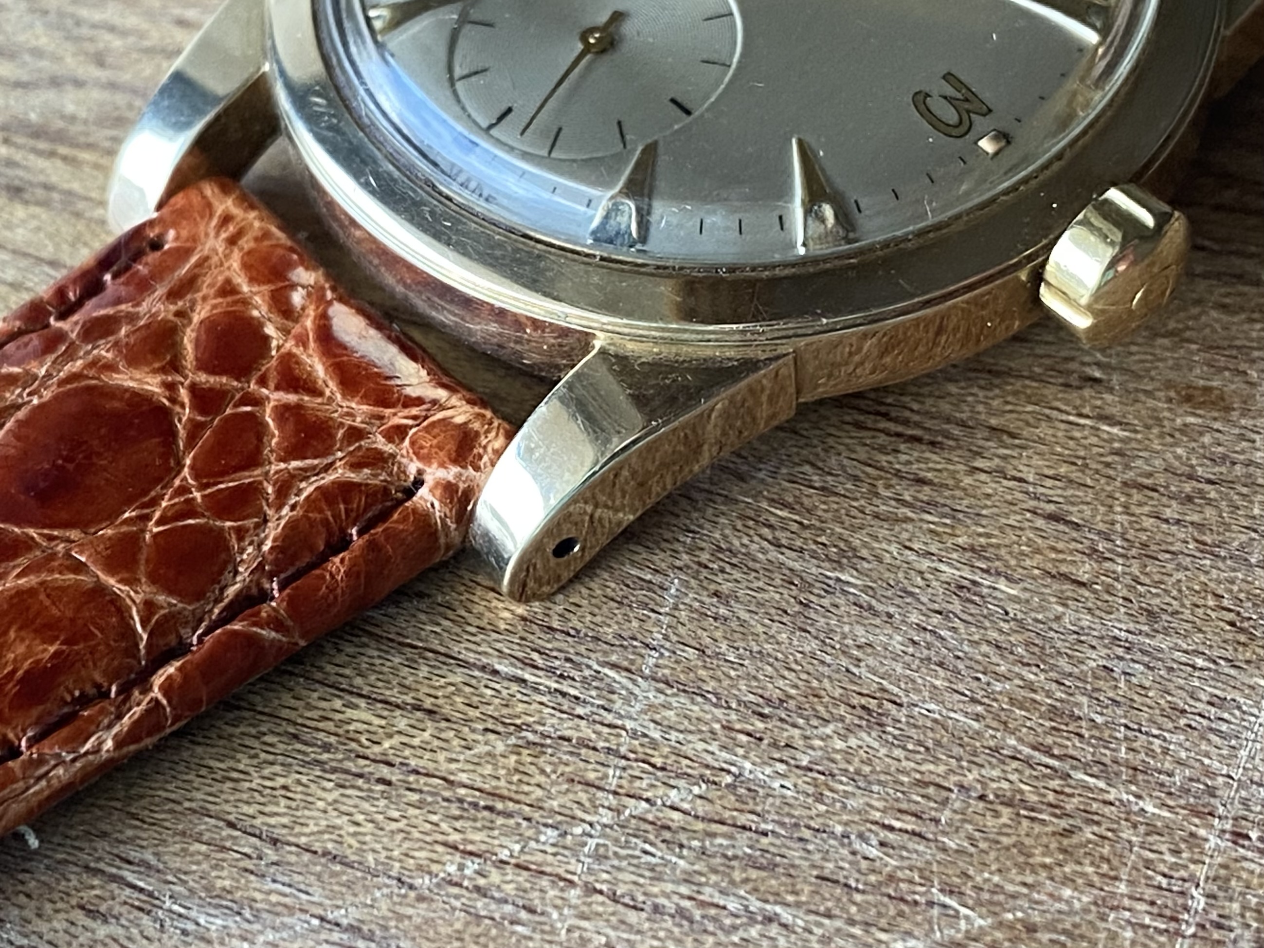 Case: Original 34,5mm 14k solid gold case in good condition. Very minimal scratches all around, a few deeper ones on the case back from failed opening attempts, one on the back of a lug and one on the bezel at 1. I have left them as they are, as the party piece of this case is the uncommon sharpness. The bevel on the bezel is fully there, the edges on the lugs perfectly sharp, it’s incredible after over 70 years. Hallmarks present at the side of the case, the back of a lug and inside the case back.