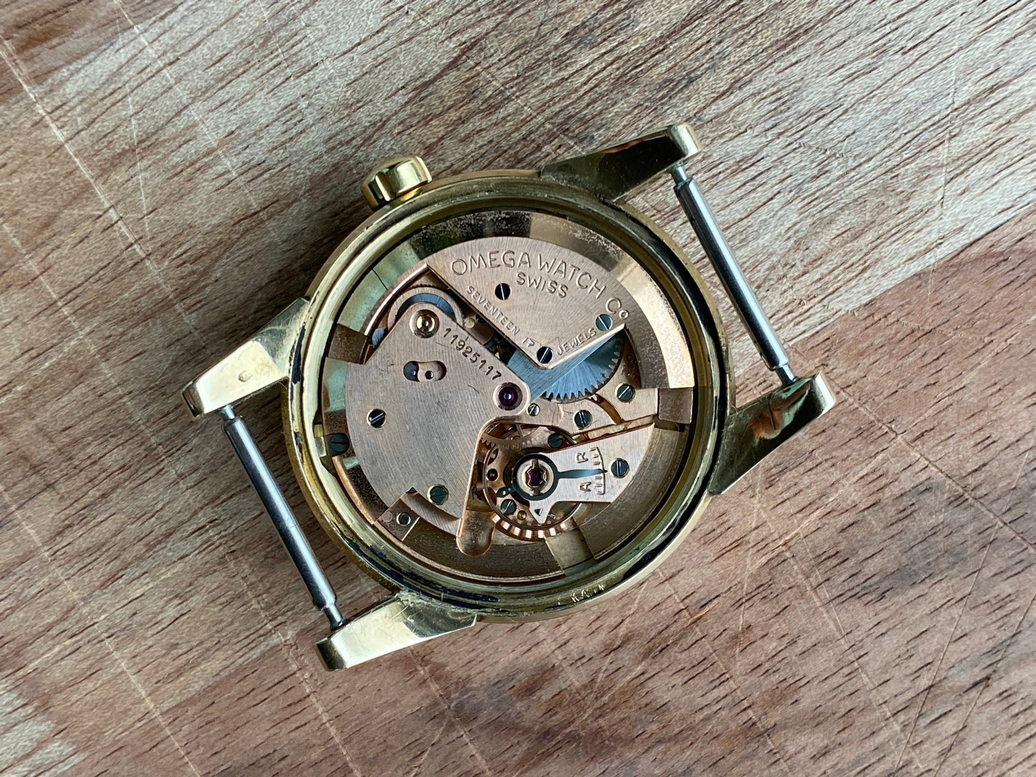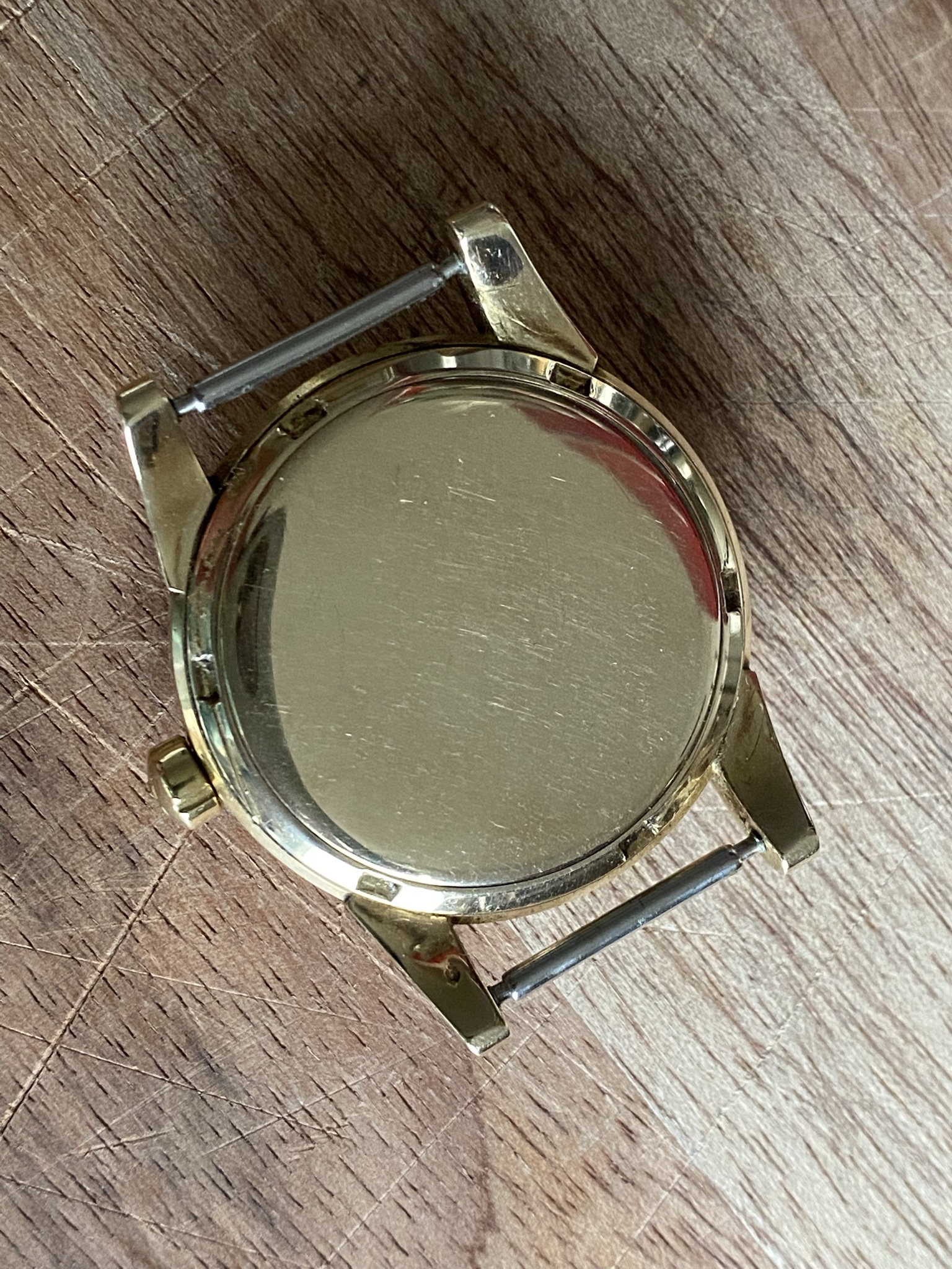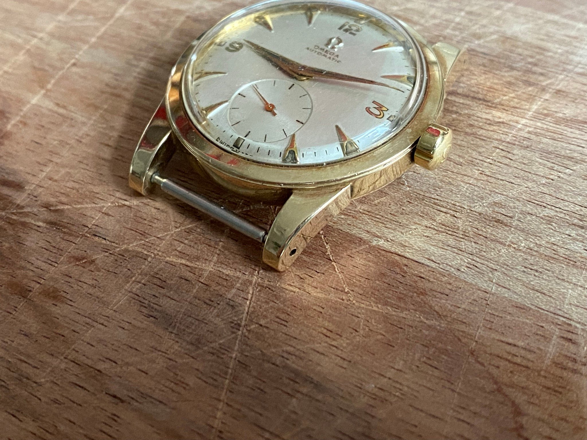 Case: Original 34,5mm 14k solid gold case in good condition. Very minimal scratches all around, a few deeper ones on the case back from failed opening attempts, one on the back of a lug and one on the bezel at 1. I have left them as they are, as the party piece of this case is the uncommon sharpness. The bevel on the bezel is fully there, the edges on the lugs perfectly sharp, it’s incredible after over 70 years. Hallmarks present at the side of the case, the back of a lug and inside the case back.