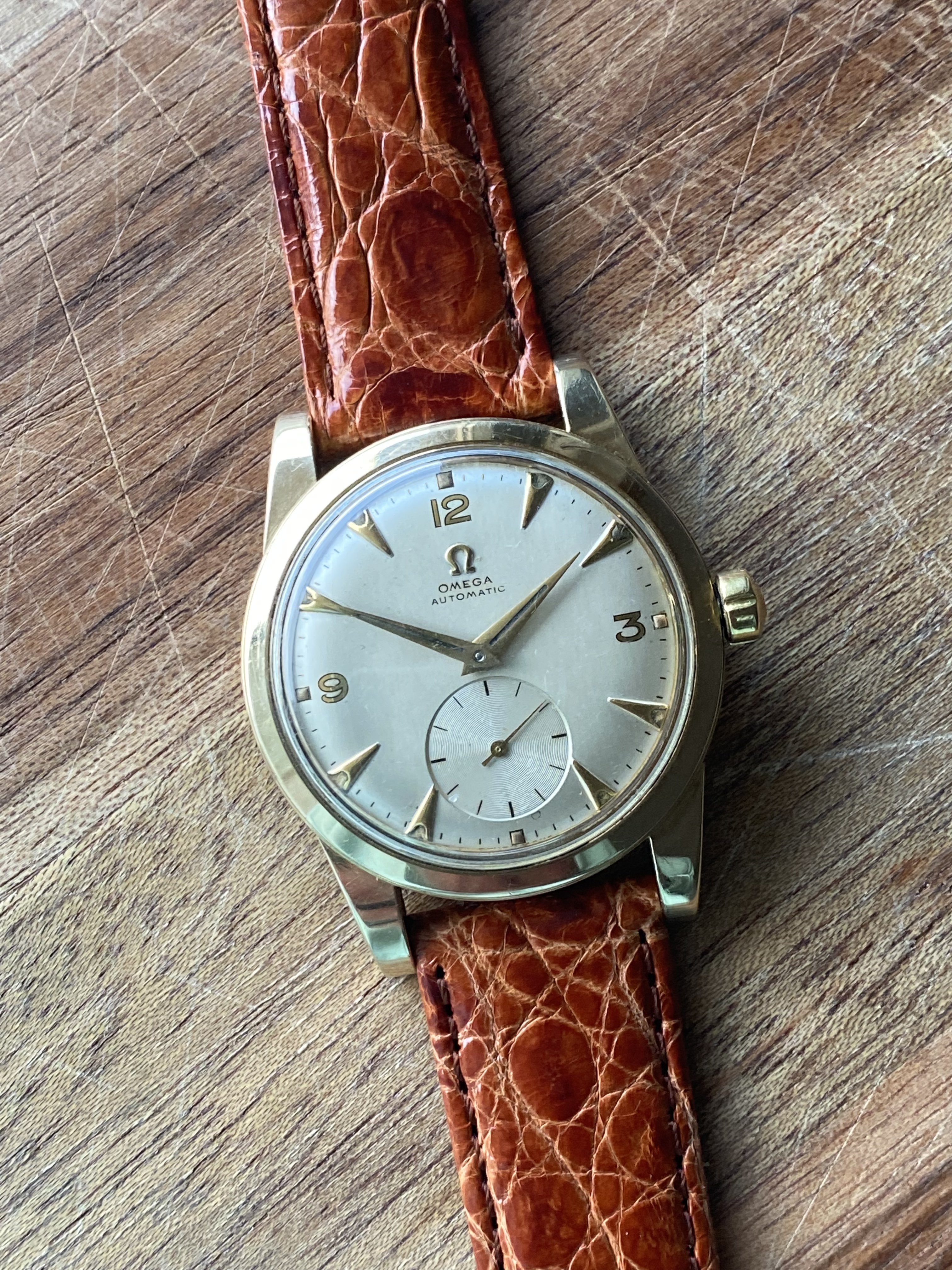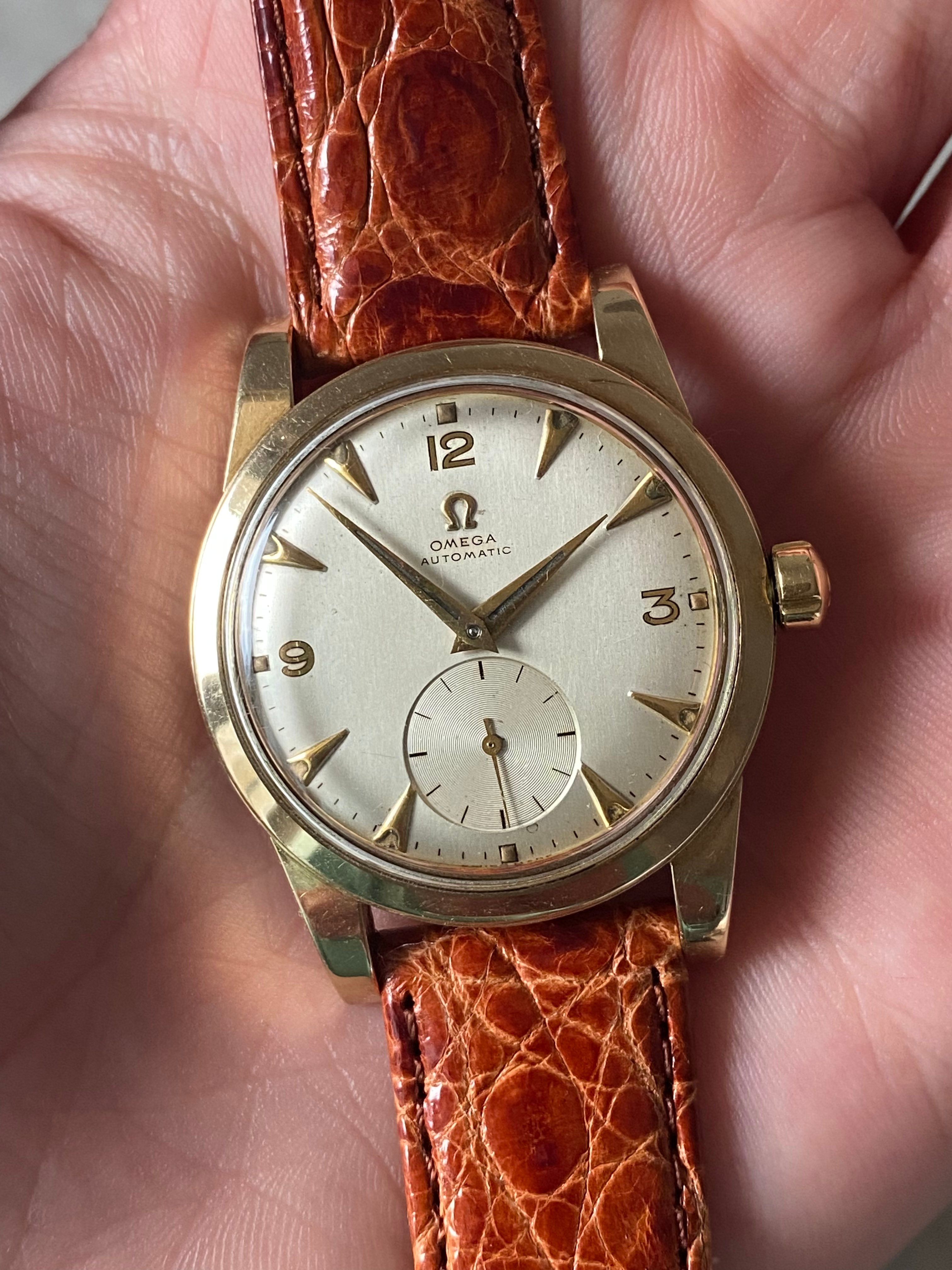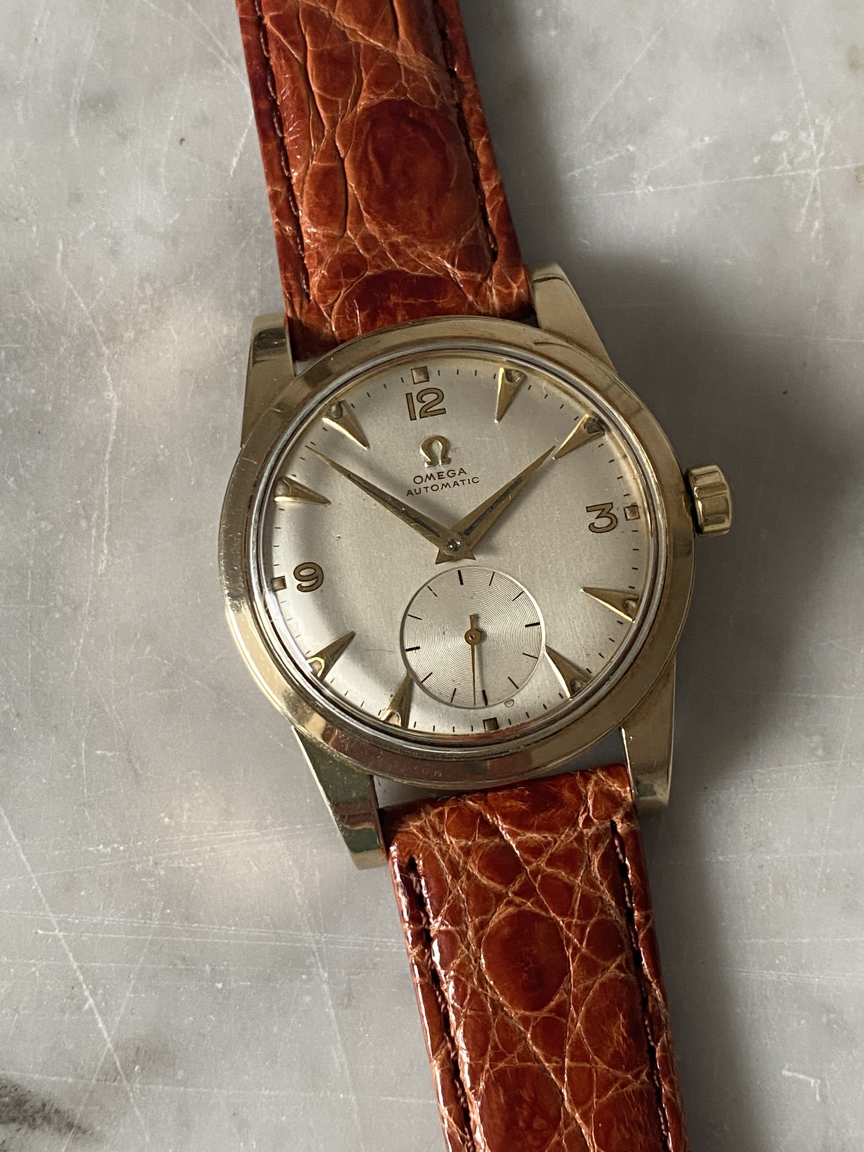Dial: original silver-white-champagne dial, sub second, gilt 12-3-9 numerals, applied Omega logo