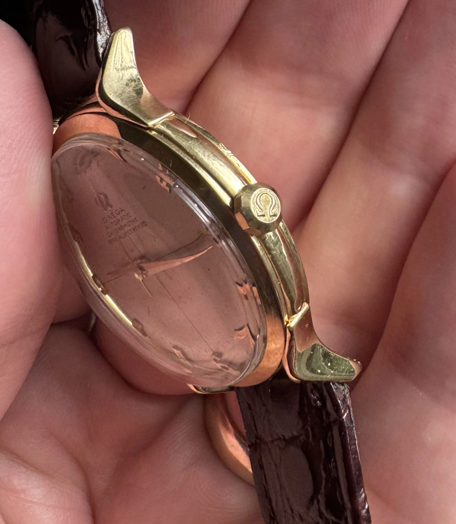 The solid 18k gold case features unique lugs that appear quite sharp for a 70+ year old watch. Measures just over 35mm not including the crown.