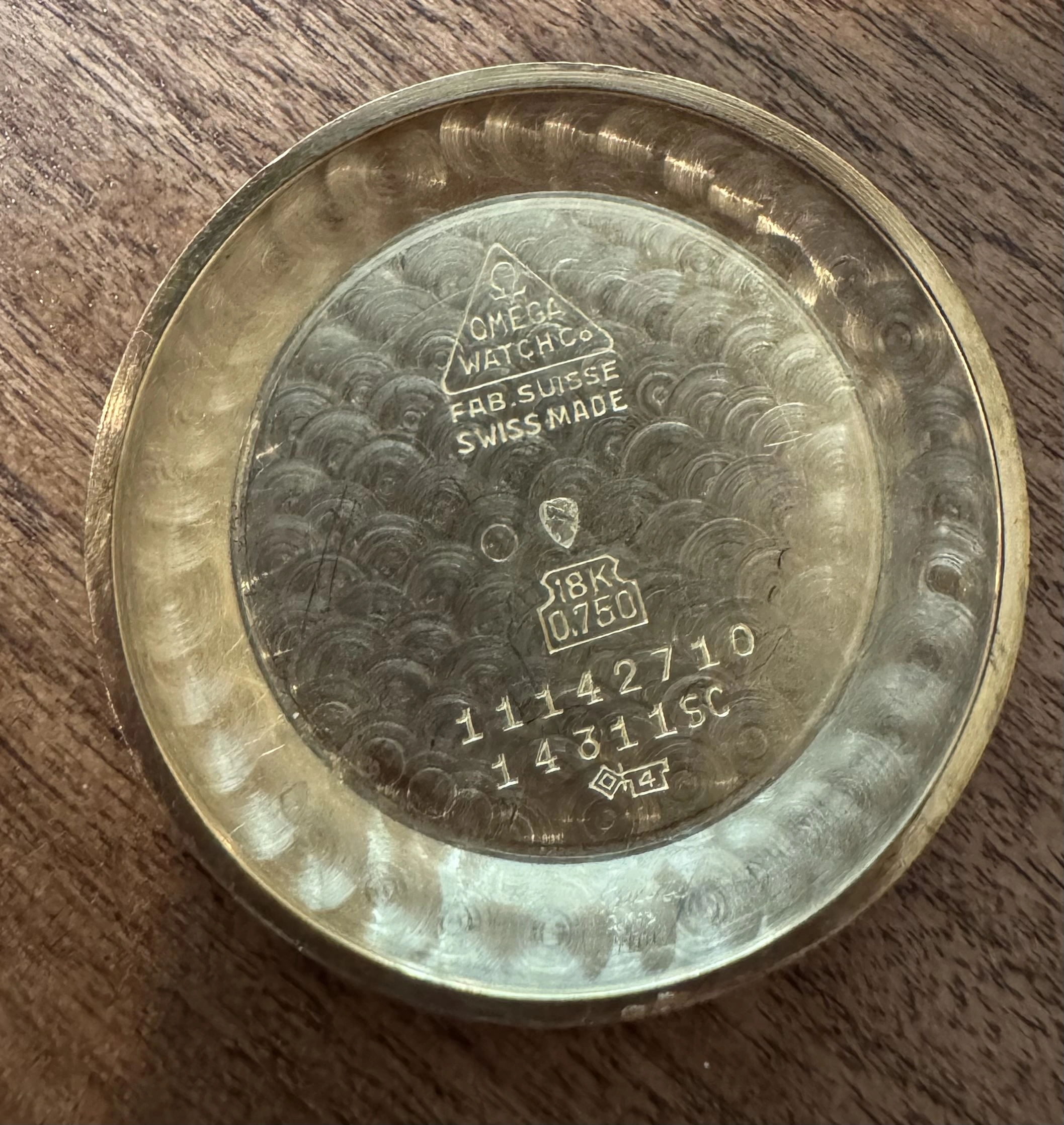 Omega signed crown, though I’m not sure if it’s original to the watch as the examples shown in the links above have different crowns. An original decagonal Omega crown nonetheless.