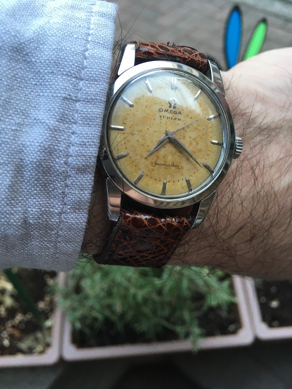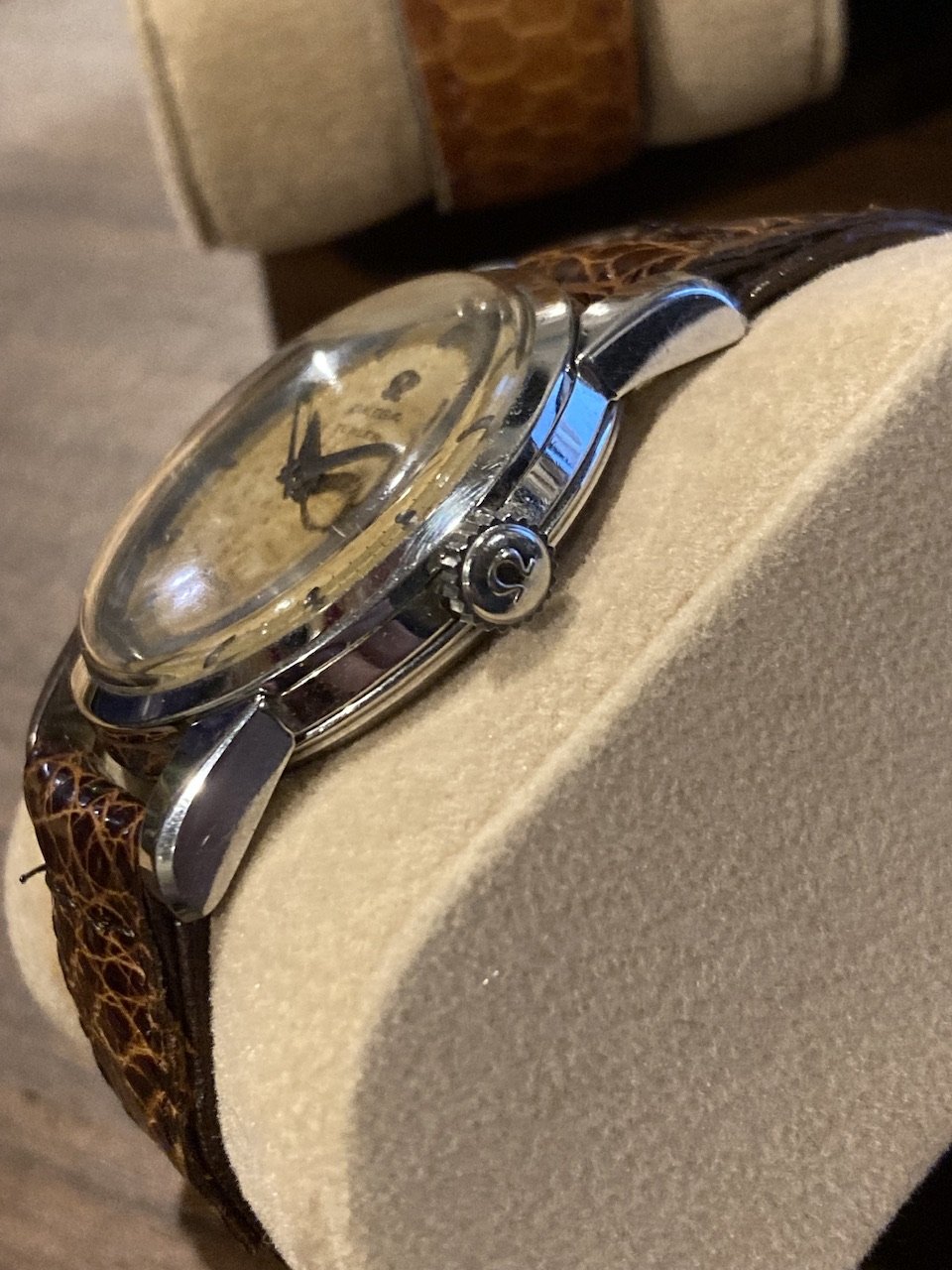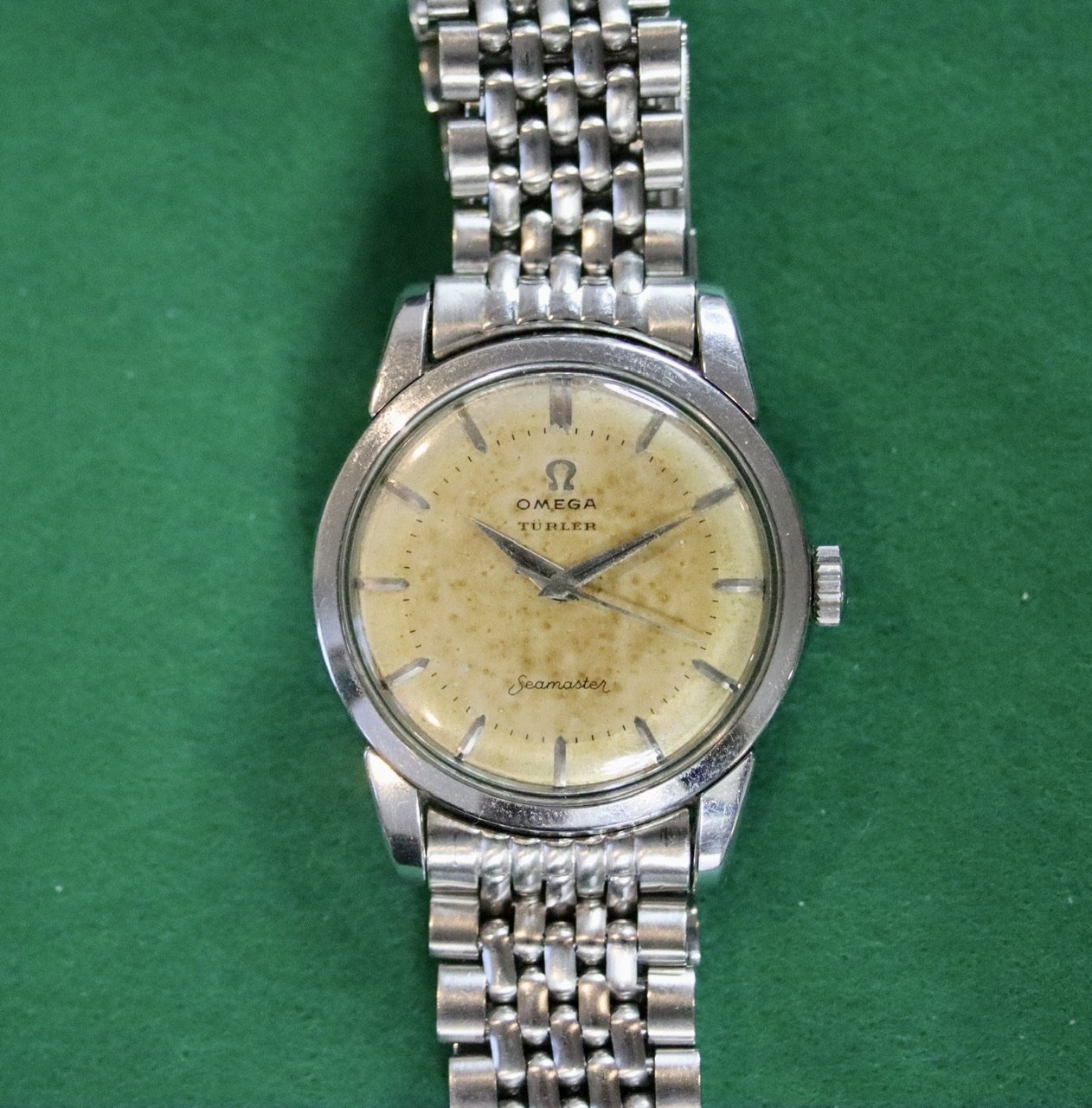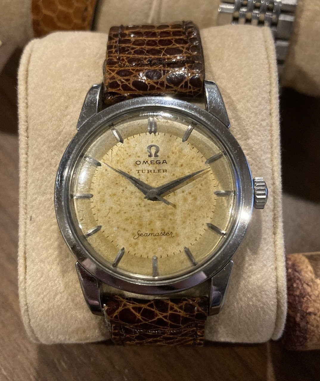 I purchased this in July 2019 from the well-known Nagoya-based online seller Closer0610. I haven’t had it serviced; timekeeping seems fine but a service is definitely in order. I believe the dial is original; the logo, with its Türler branding, is slightly off-center, which is a thing I’ve seen on other examples of this model. The dial has patinated in a way I, at least, like, and the hands show some corrosion. The crown is likely a replacement. The case has seen a polish in its lifetime but the facets are still visible and the whole thing looks solid on the wrist.