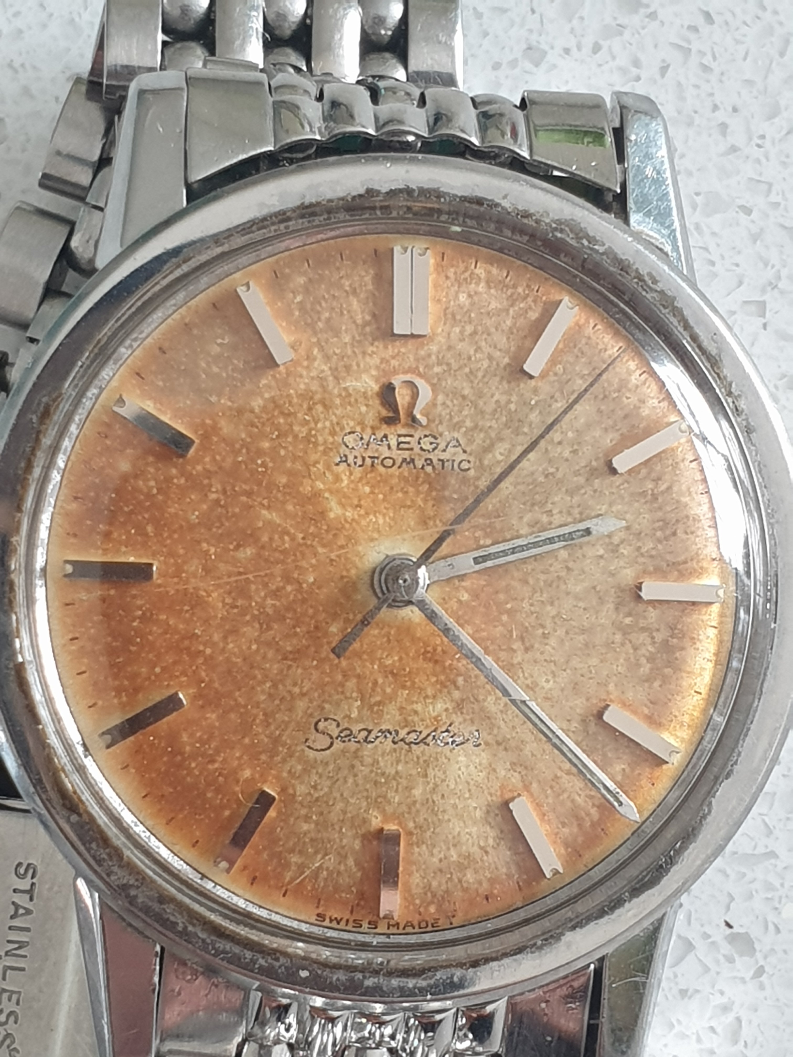 As you can see by the back, it has no markings other than the Seamaster. I haven't had it opened up yet, however the automatic function kicked in as soon as I started handling it and it hadn't been moved for about 8 years apparently. Its working fine and keeping the time so I'm hoping the damage is limited.