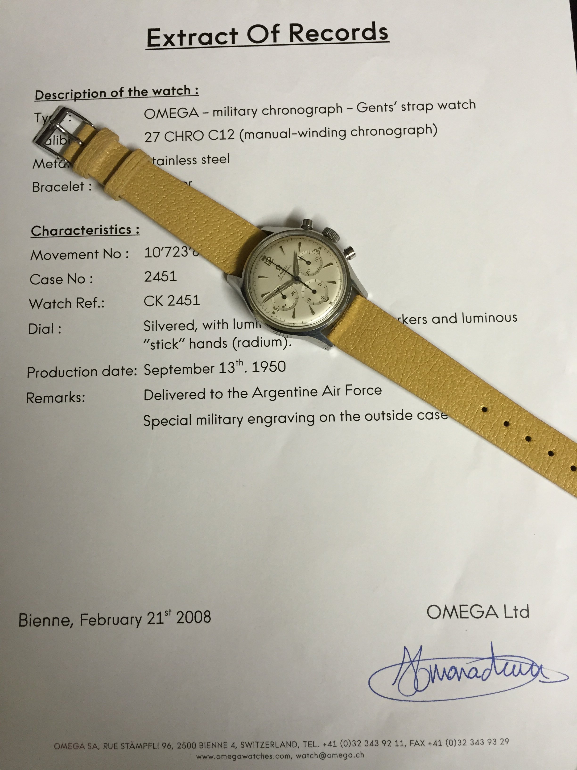 Omega chronographs for the F.A.A. Where introduced from 1951 . Which is serial range 12,000,000 chro 27 and above.