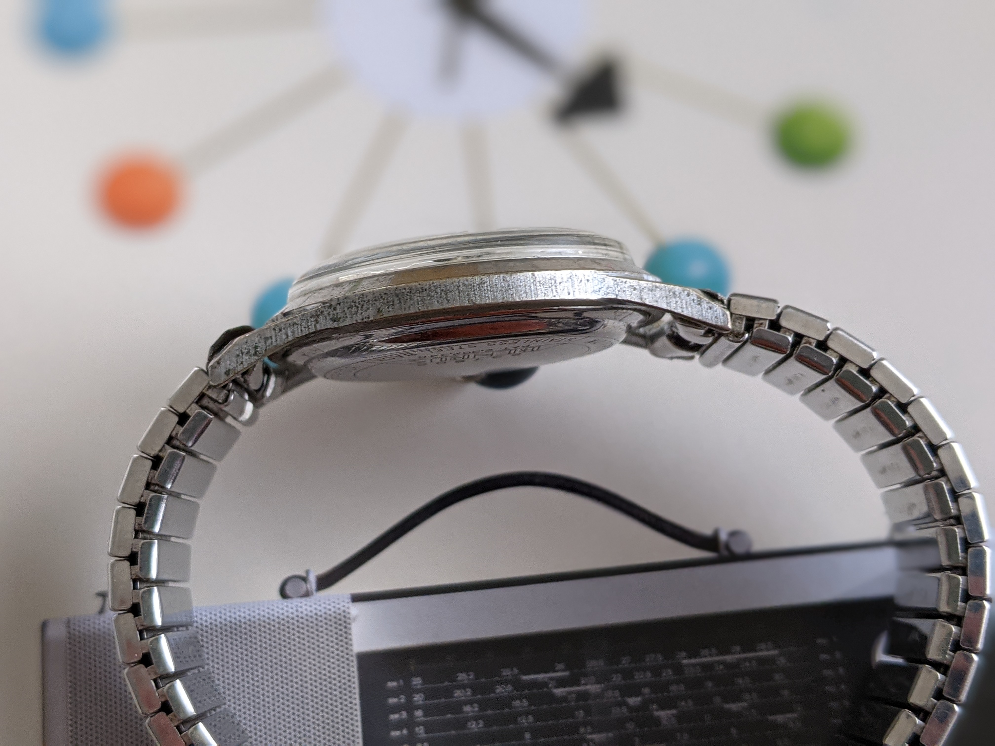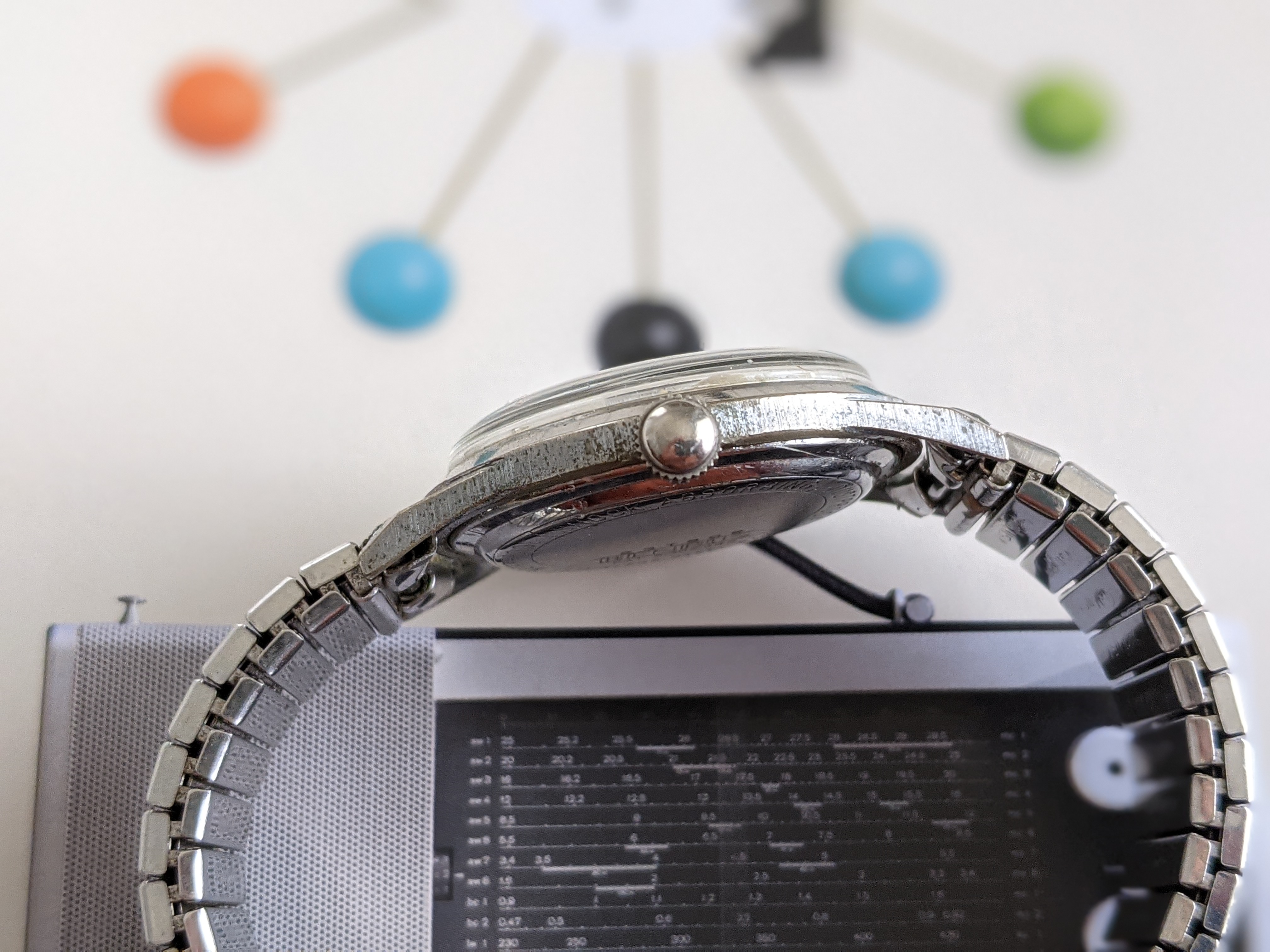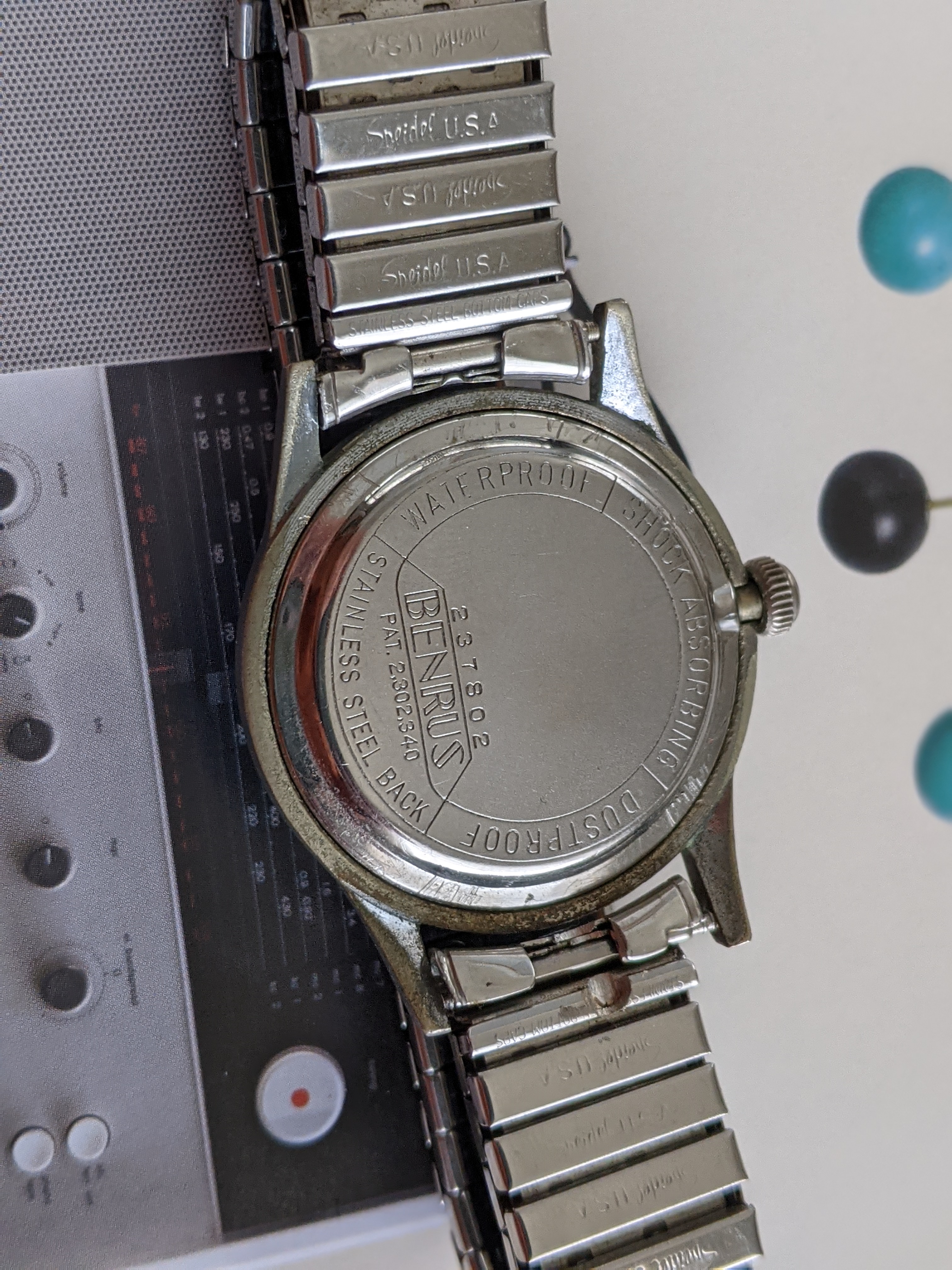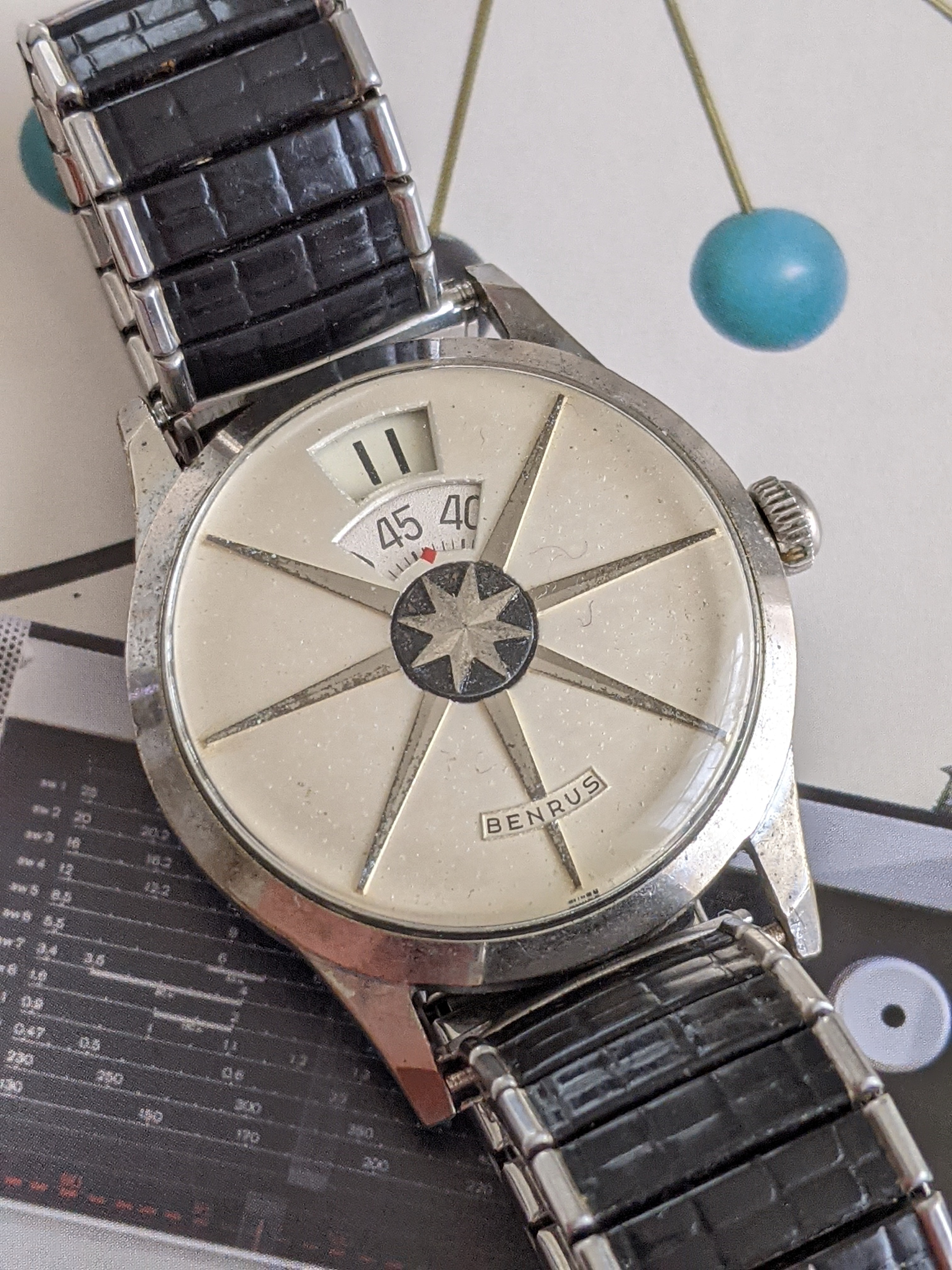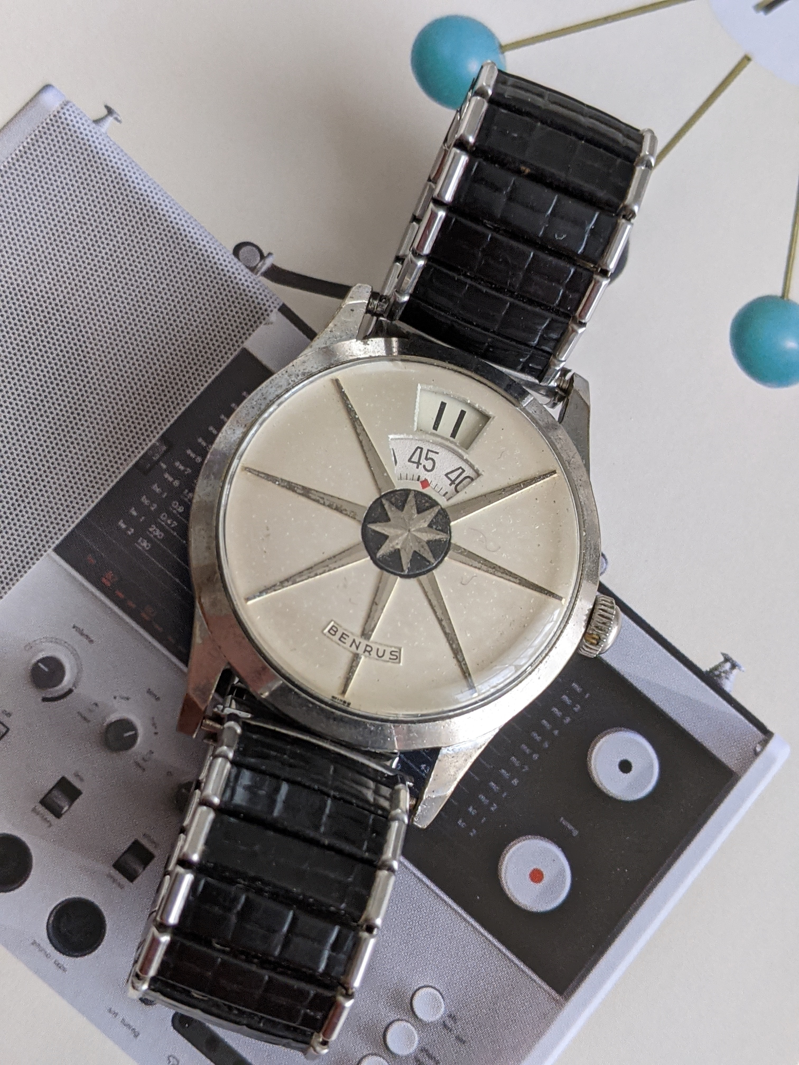 ·Here we have a late 1950's Benrus Dial-O-Rama. This is a great piece for the mid century modern collector. The chrome plated case measures 34mm in width, with an 18mm lug width. The movement keeps great time, and was serviced about a year ago. The star in the center of the dial rotates, to indicate the seconds. Everything appears original on this one, minus the NOS stretchy bracelet. If you don't like that stretchy Speidel, I can put it on leather. I'm asking $425 or best offer. Please PM for inquires.