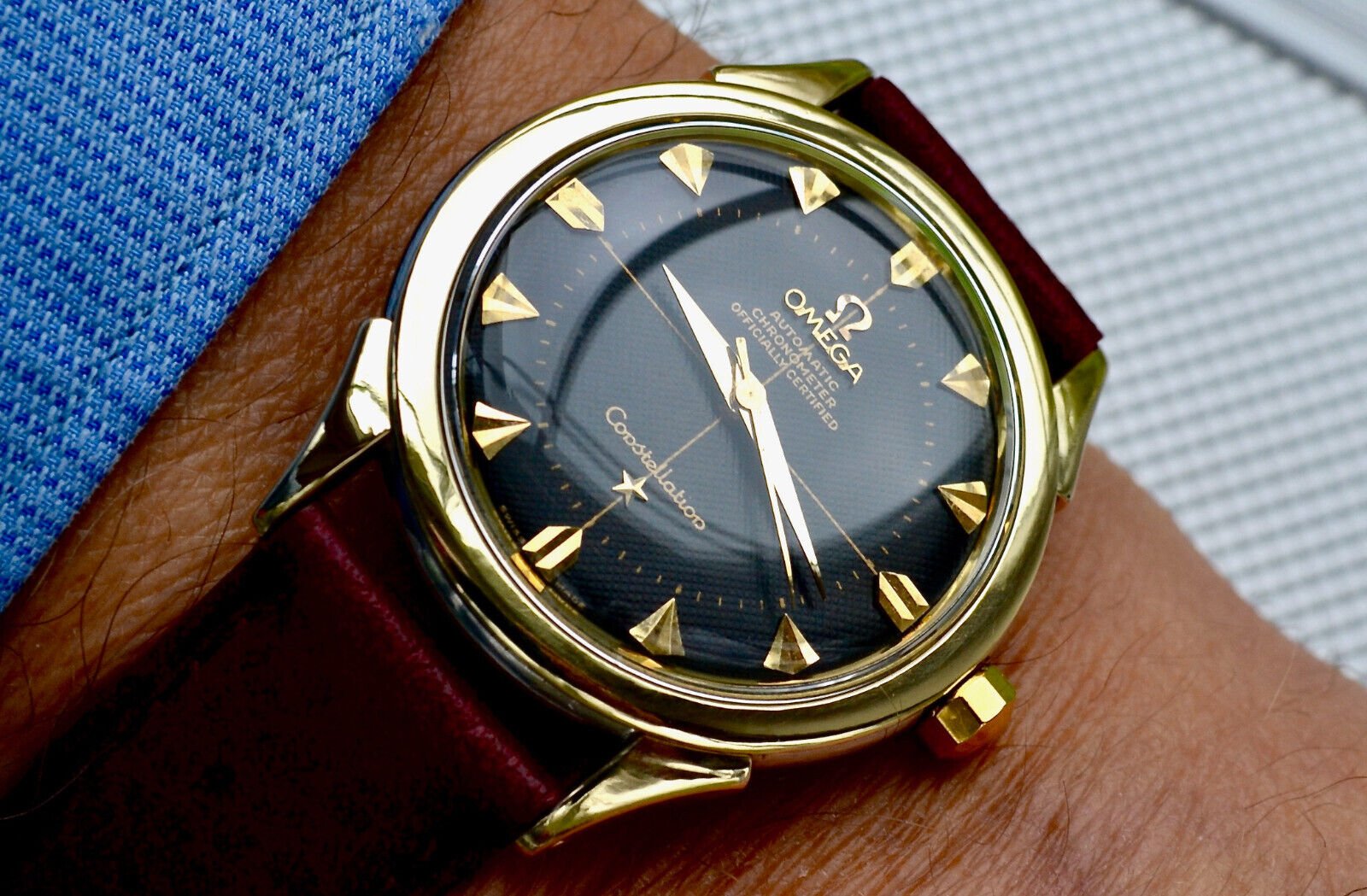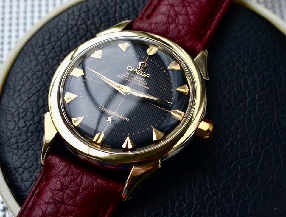 Dial: black hobnail dial - Bears the raised gold OMEGA logo + name - Automatic Chronometer Officially Certified beneath the '12' - Constellation with applied Gold Star above the 6 - Substantial raised & bevelled applied gold markers in first rate order - Gold seconds chapter to inner perimeter - Swiss Made to bottom