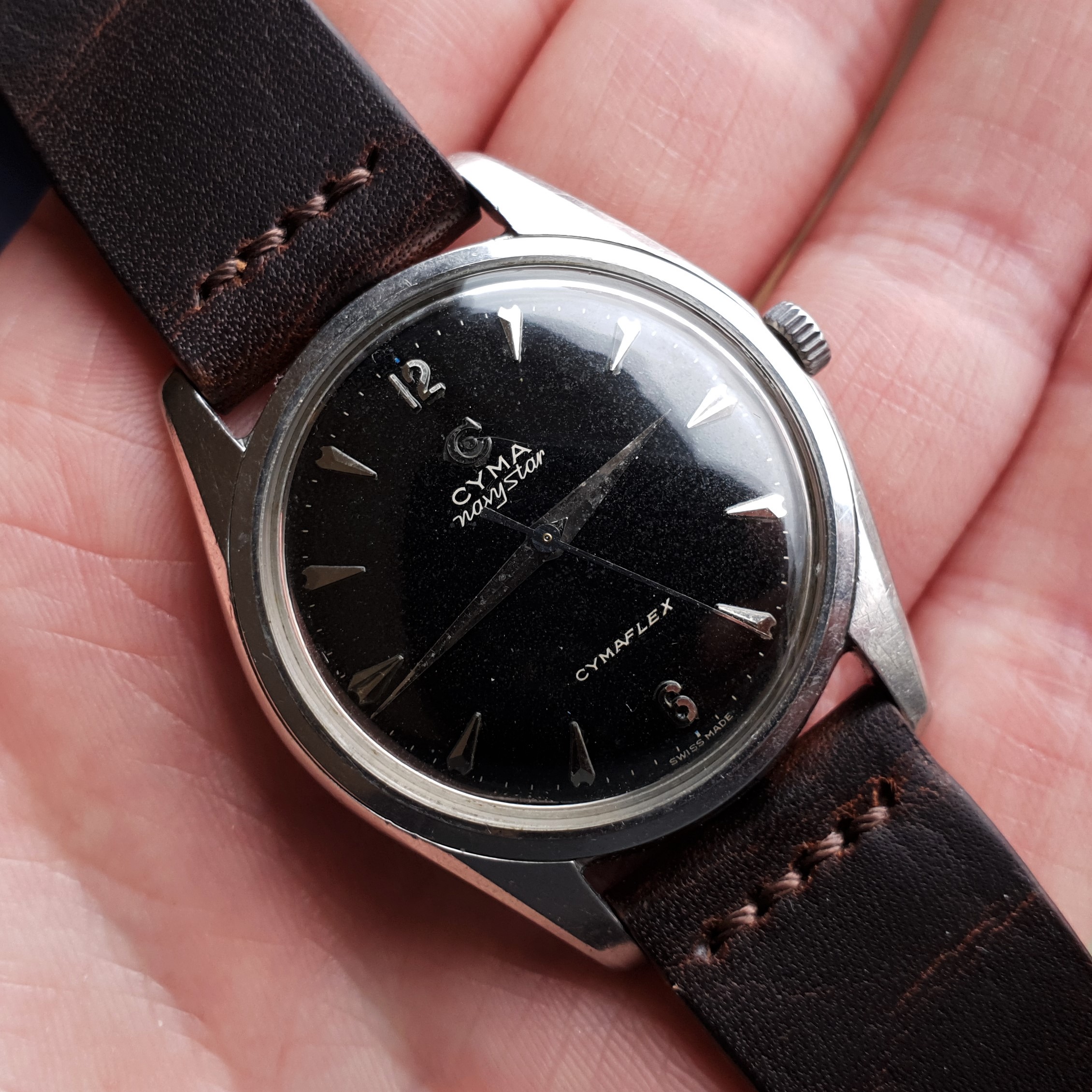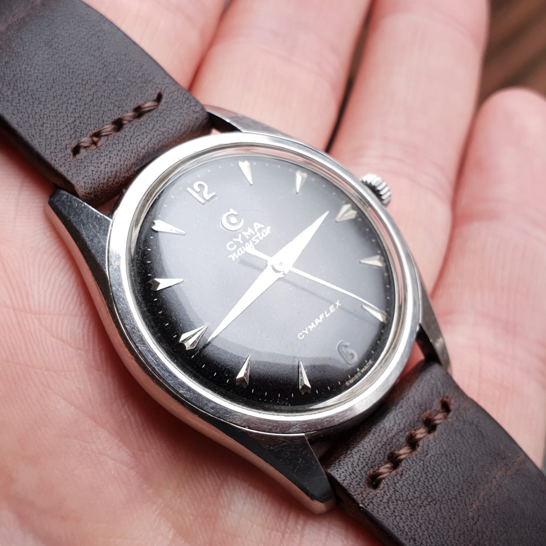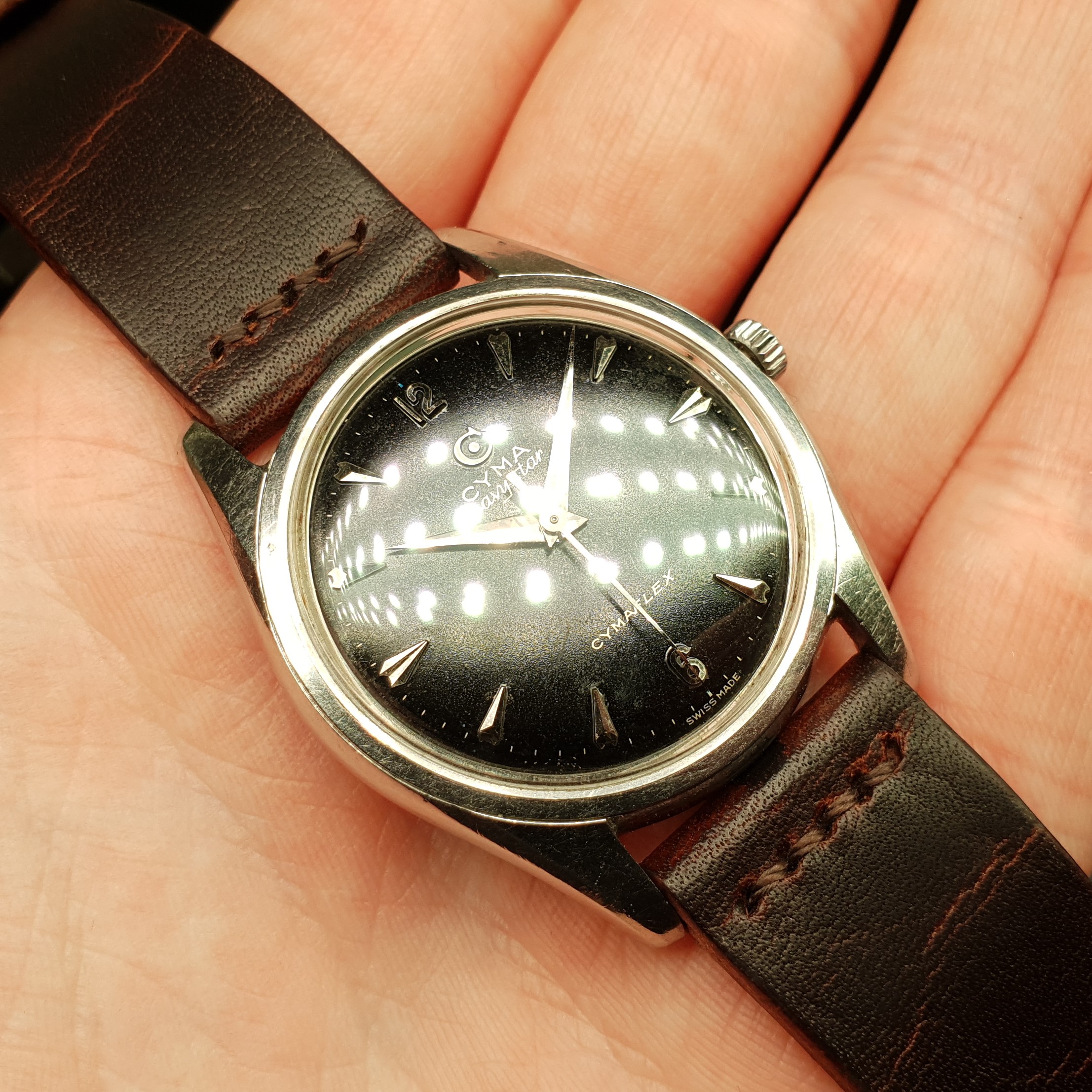 Highlights include the sharp case with a remarkably slim profile, thanks to the in-house manual cal. R459 (Ranfft: http://www.ranfft.de/cgi-bin/bidfun-db.cgi?10&ranfft&&2uswk&Cyma_459). The watch was serviced in 2020 and runs very accurately. The slightly curved lugs are nice and 'grippy' around your wrist and make for comfortable wearing. At 35mm in diameter (excl. crown) it doesn't quite categorize as jumbo, but it wears nicely substantial regardless. The watch is all original.