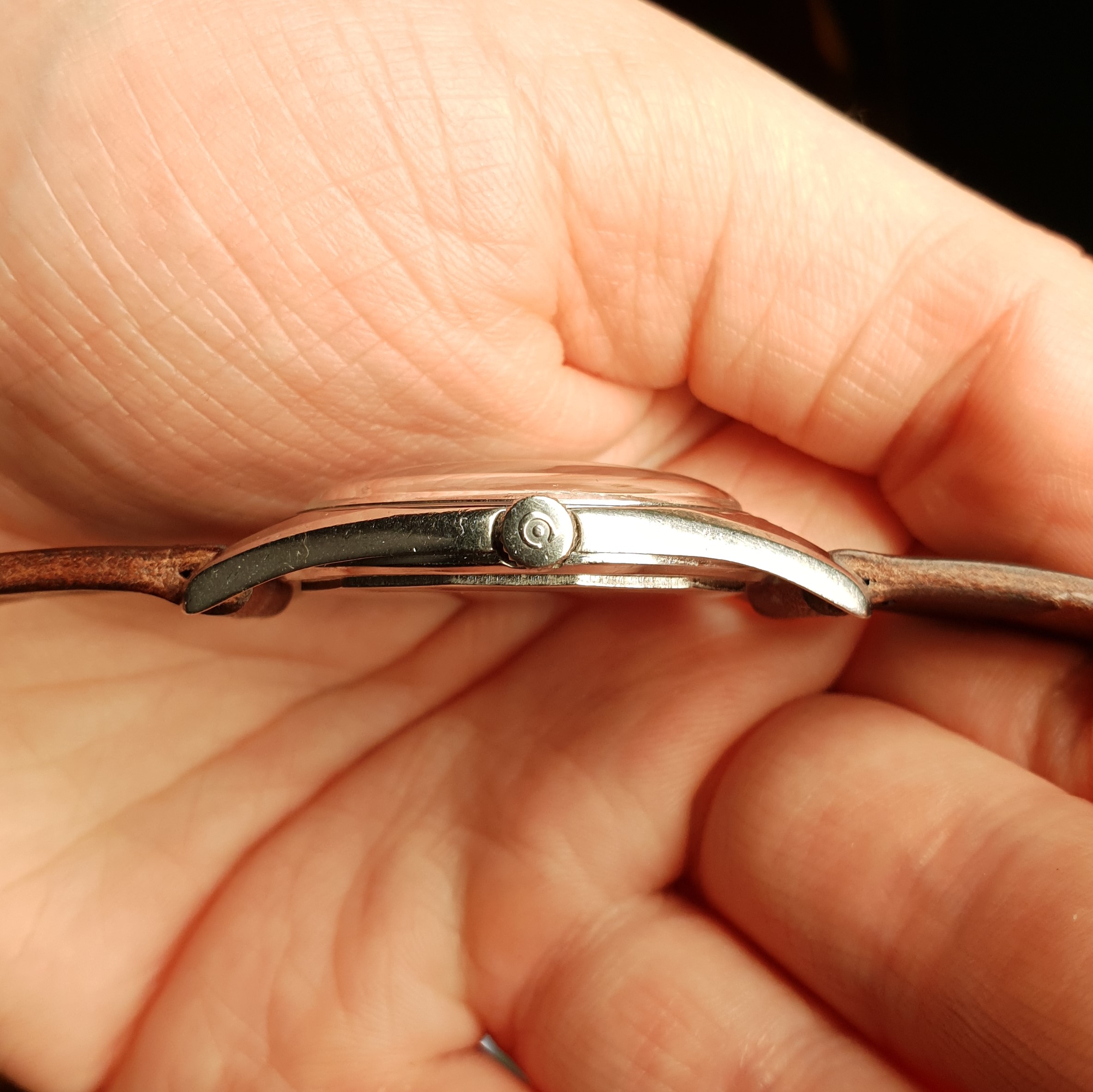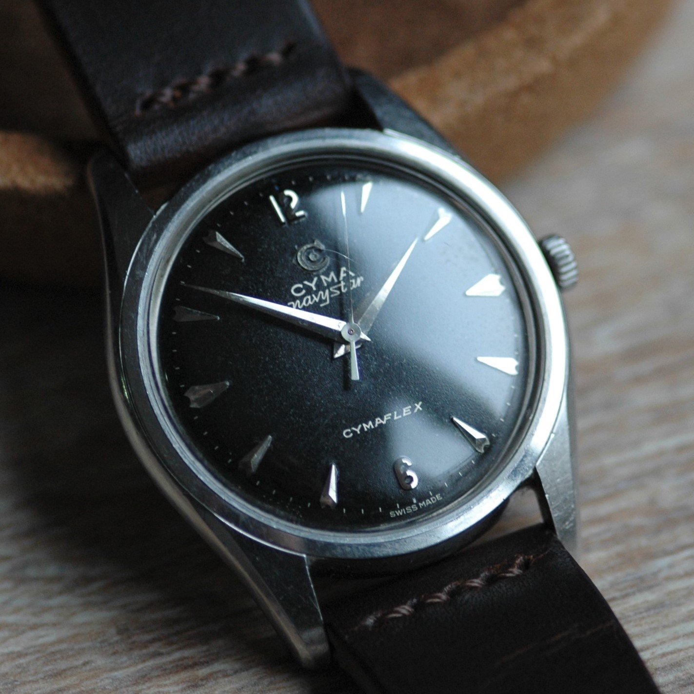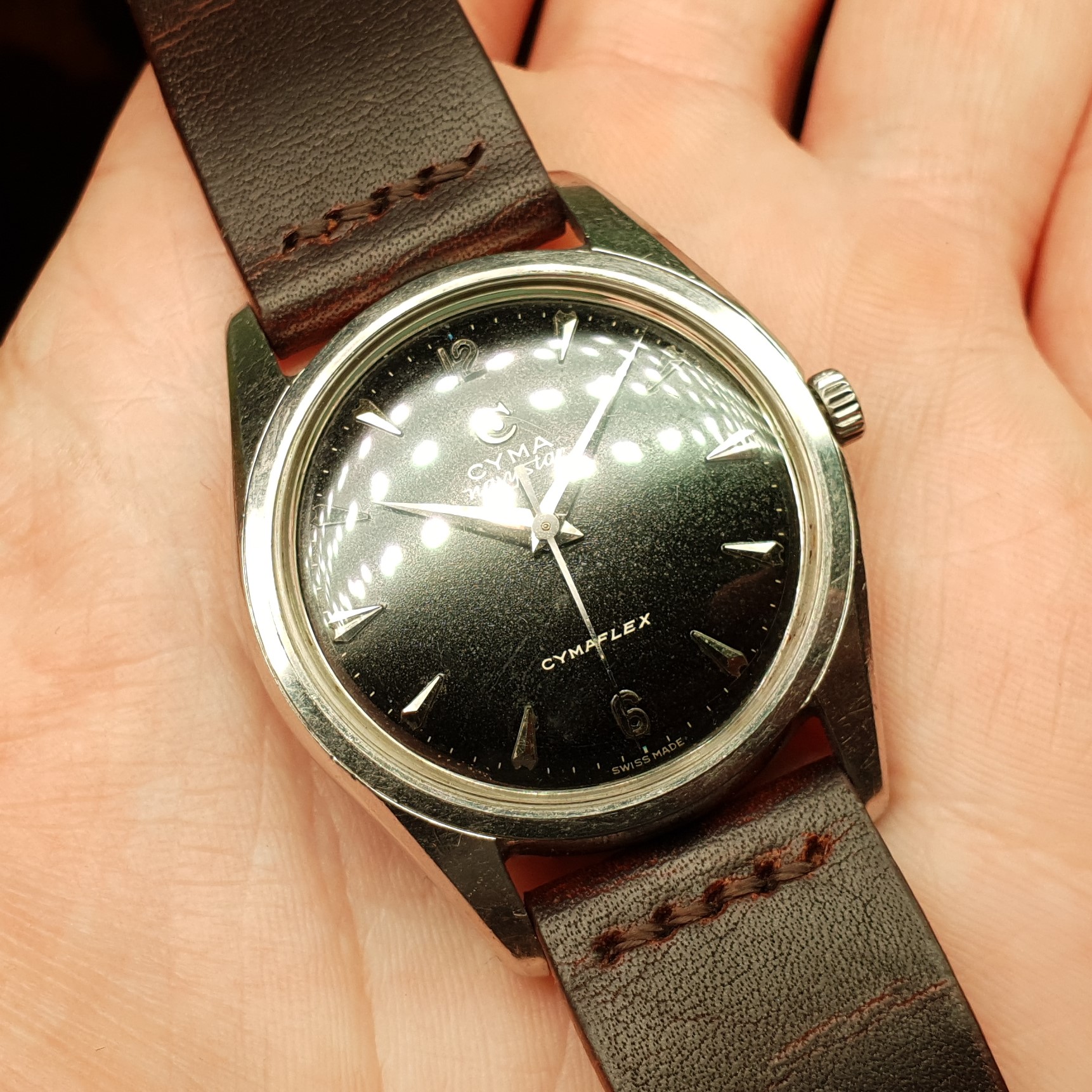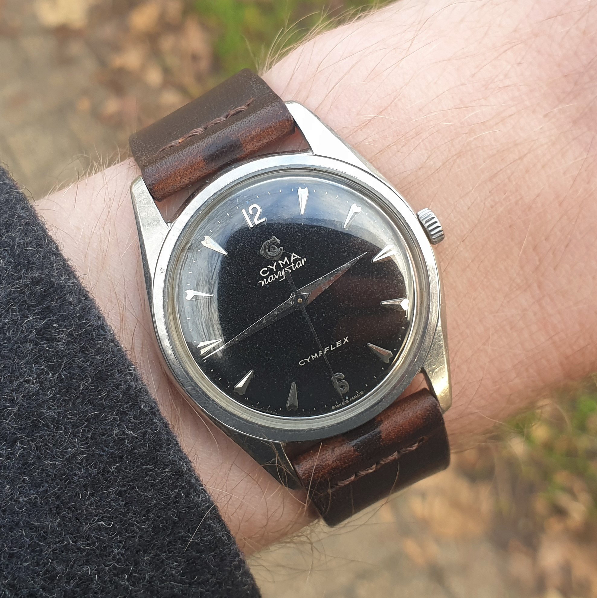 Highlights include the sharp case with a remarkably slim profile, thanks to the in-house manual cal. R459 (Ranfft: http://www.ranfft.de/cgi-bin/bidfun-db.cgi?10&ranfft&&2uswk&Cyma_459). The watch was serviced in 2020 and runs very accurately. The slightly curved lugs are nice and 'grippy' around your wrist and make for comfortable wearing. At 35mm in diameter (excl. crown) it doesn't quite categorize as jumbo, but it wears nicely substantial regardless. The watch is all original.