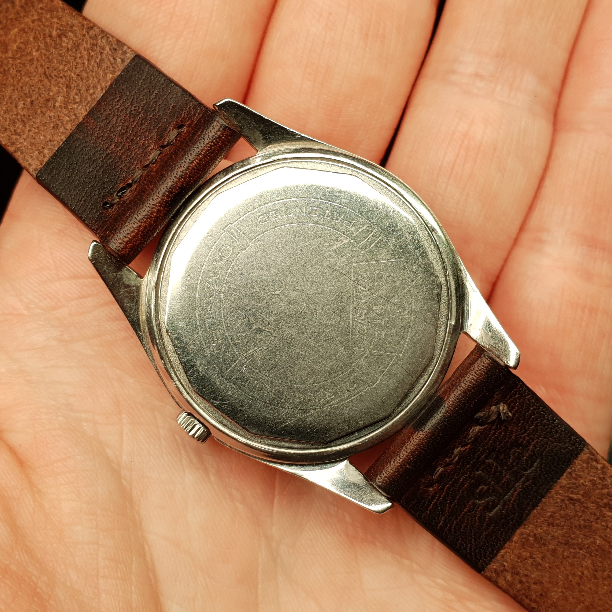 I can't tell if the caseback is slightly worn or polished, but the inscriptions are readable regardless.