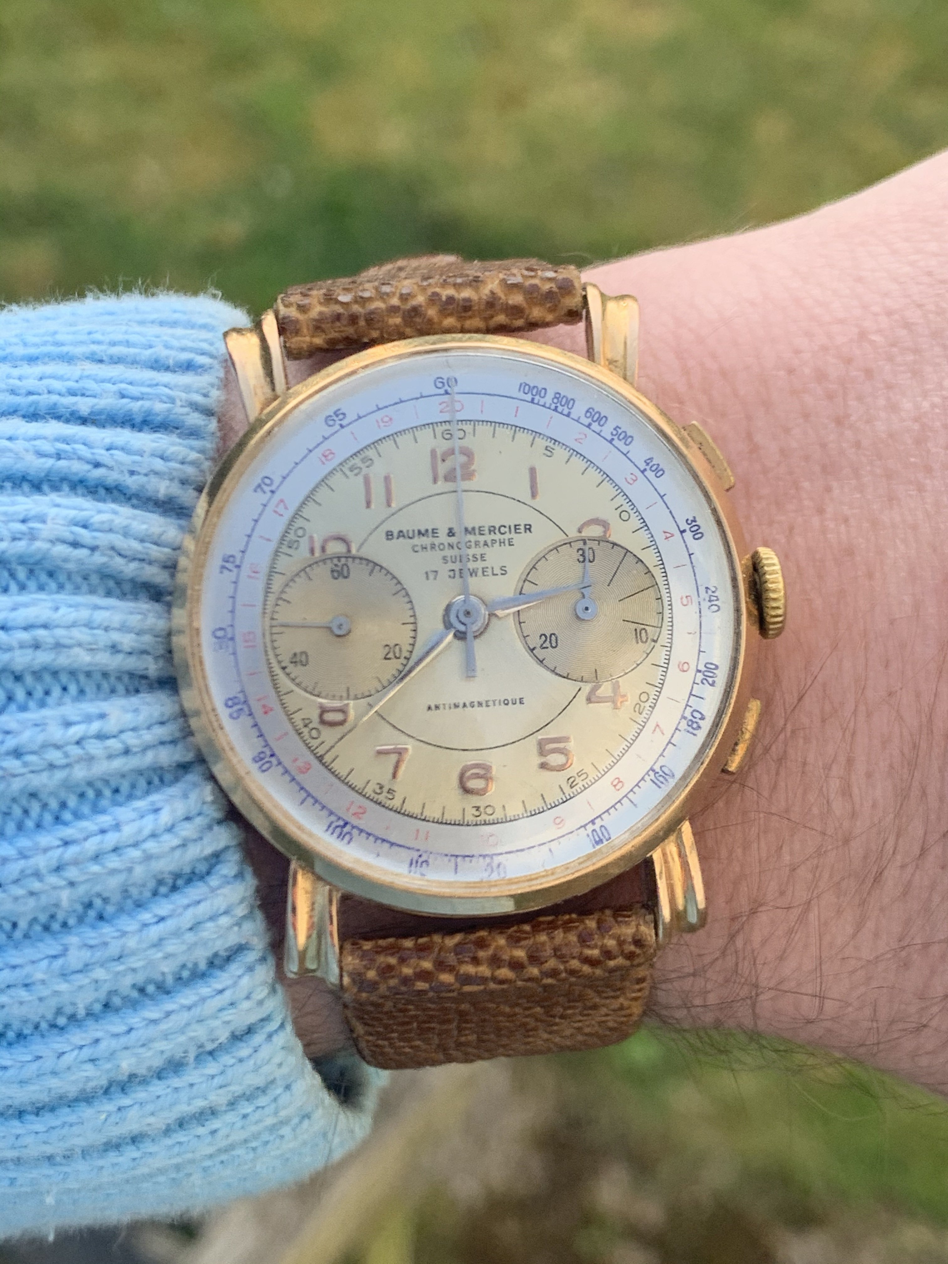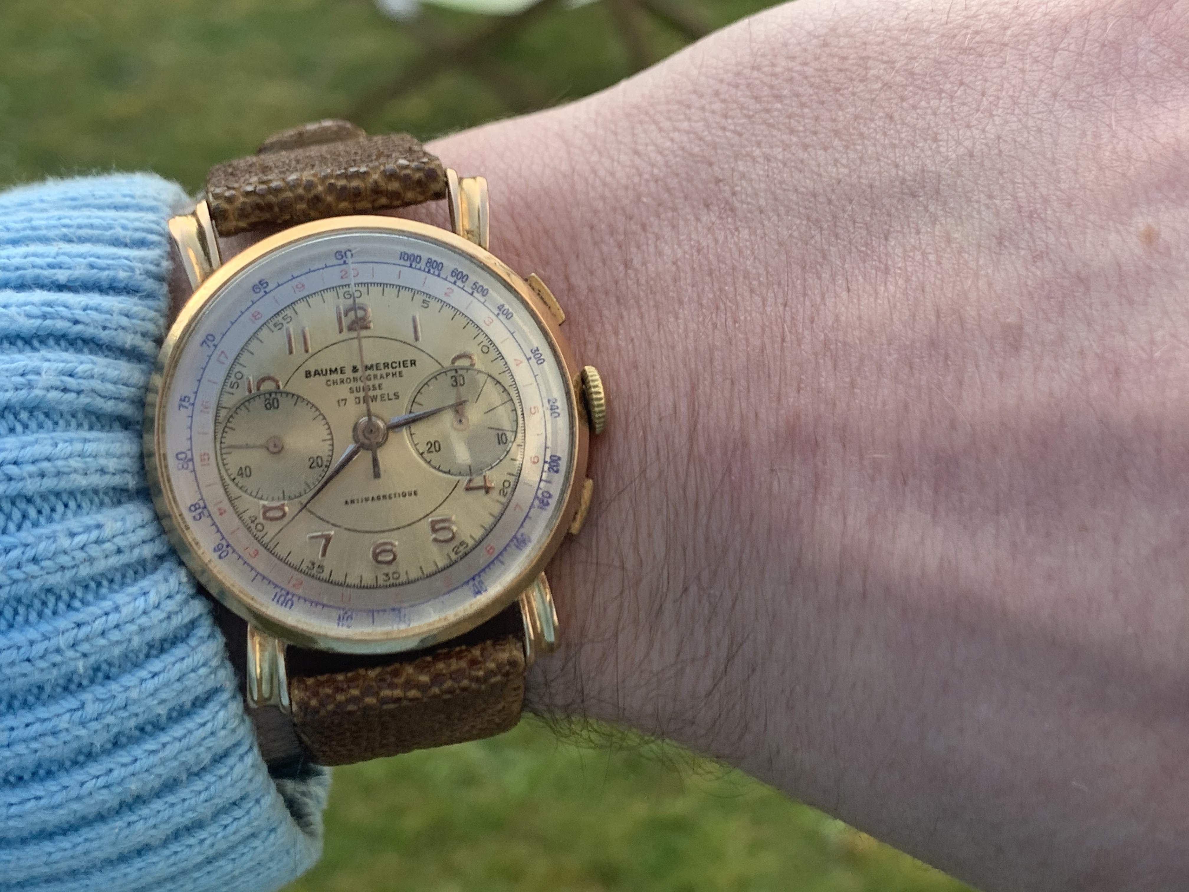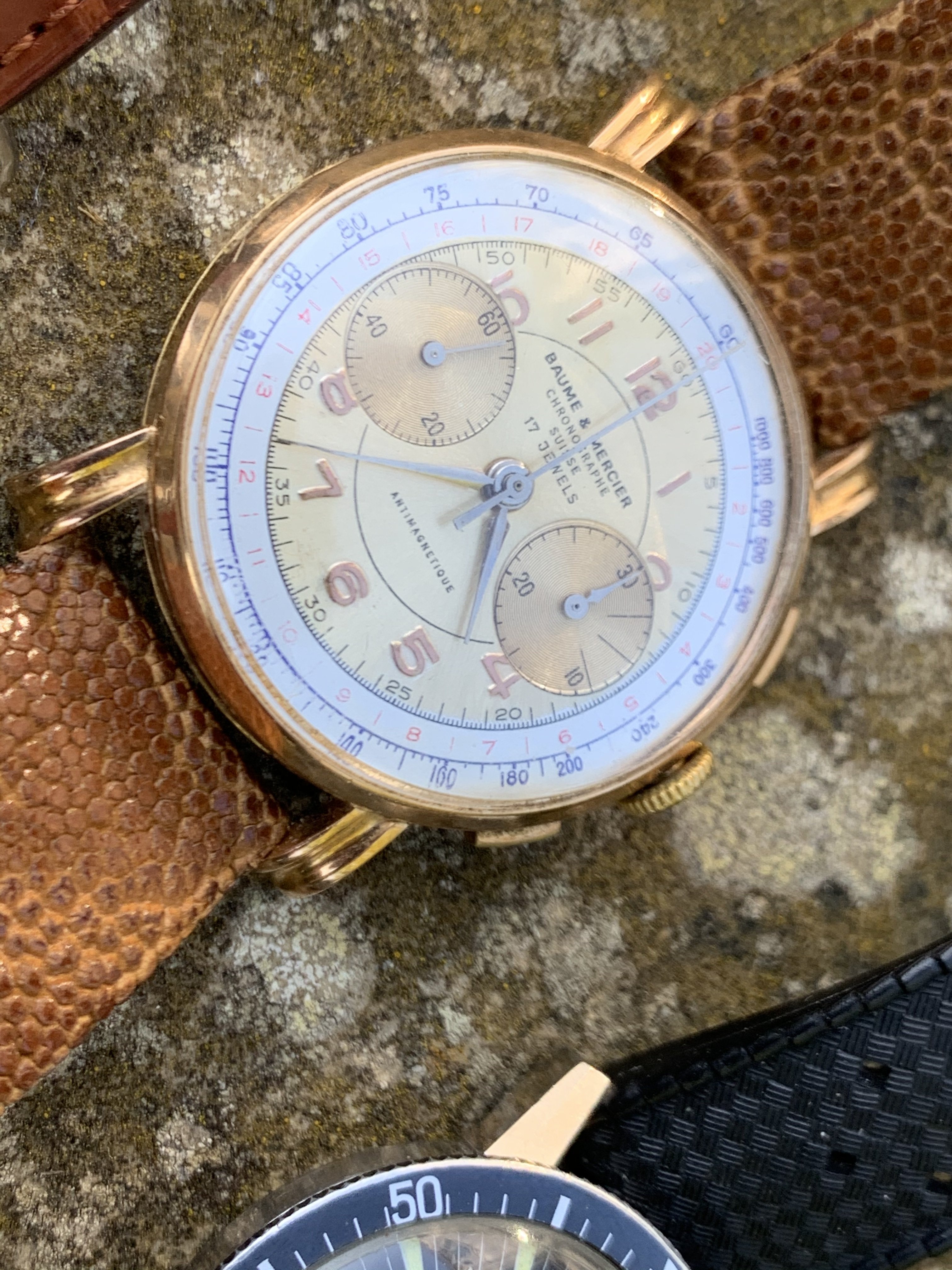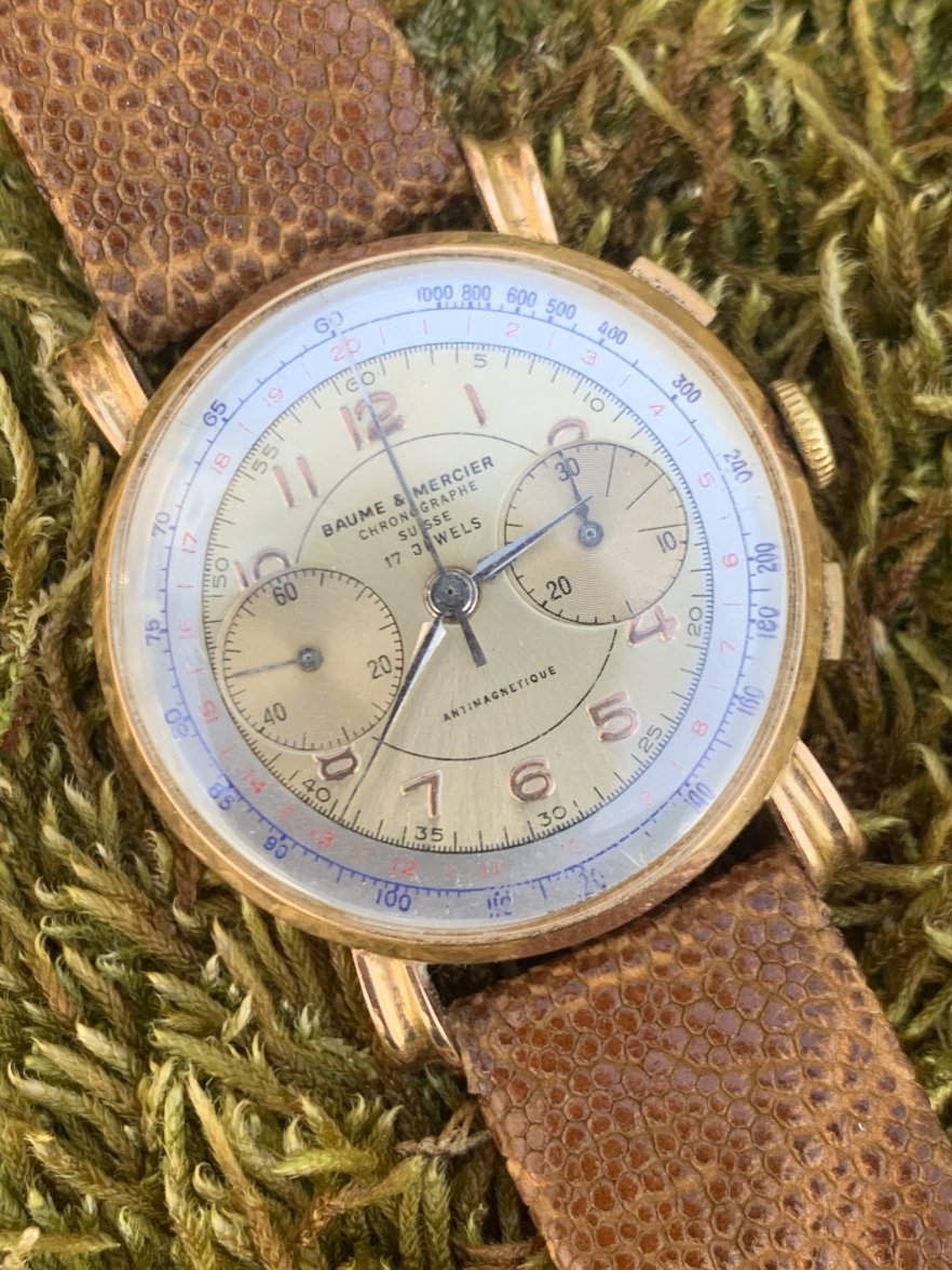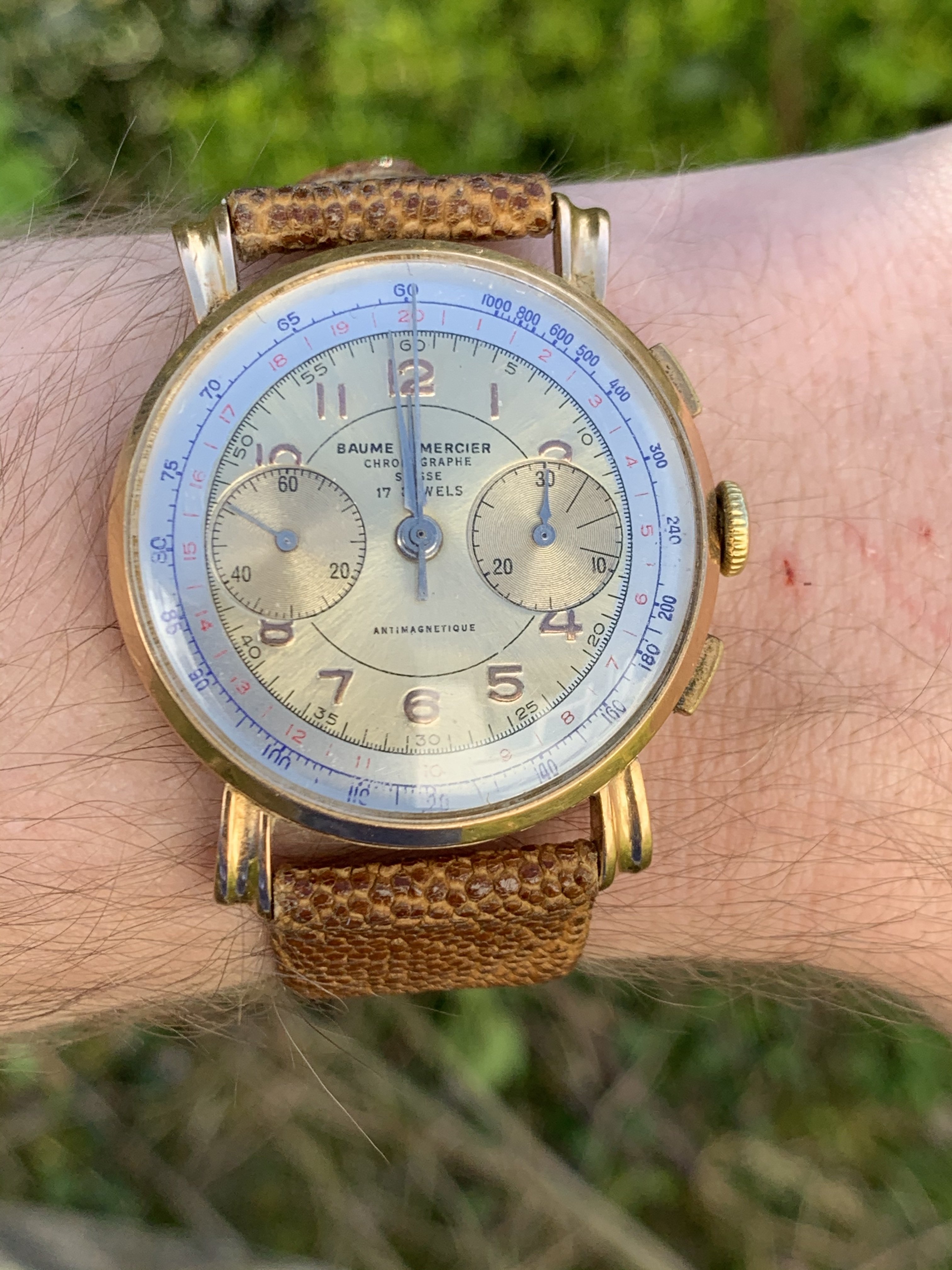 Up for sale is another one of my beauties, this time a hand wind 1950s Baume & Mercier Chronograph which is at a very respectable 37.5mm.