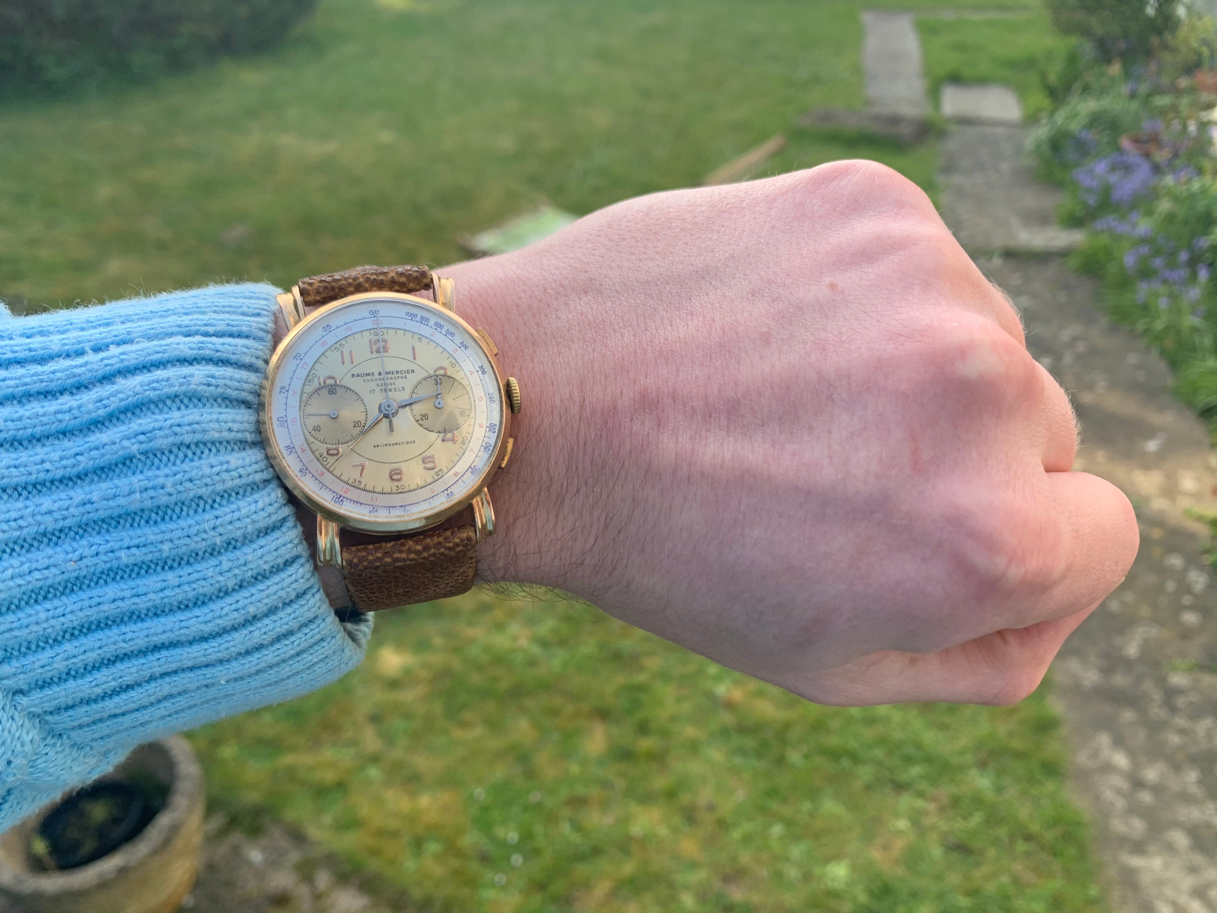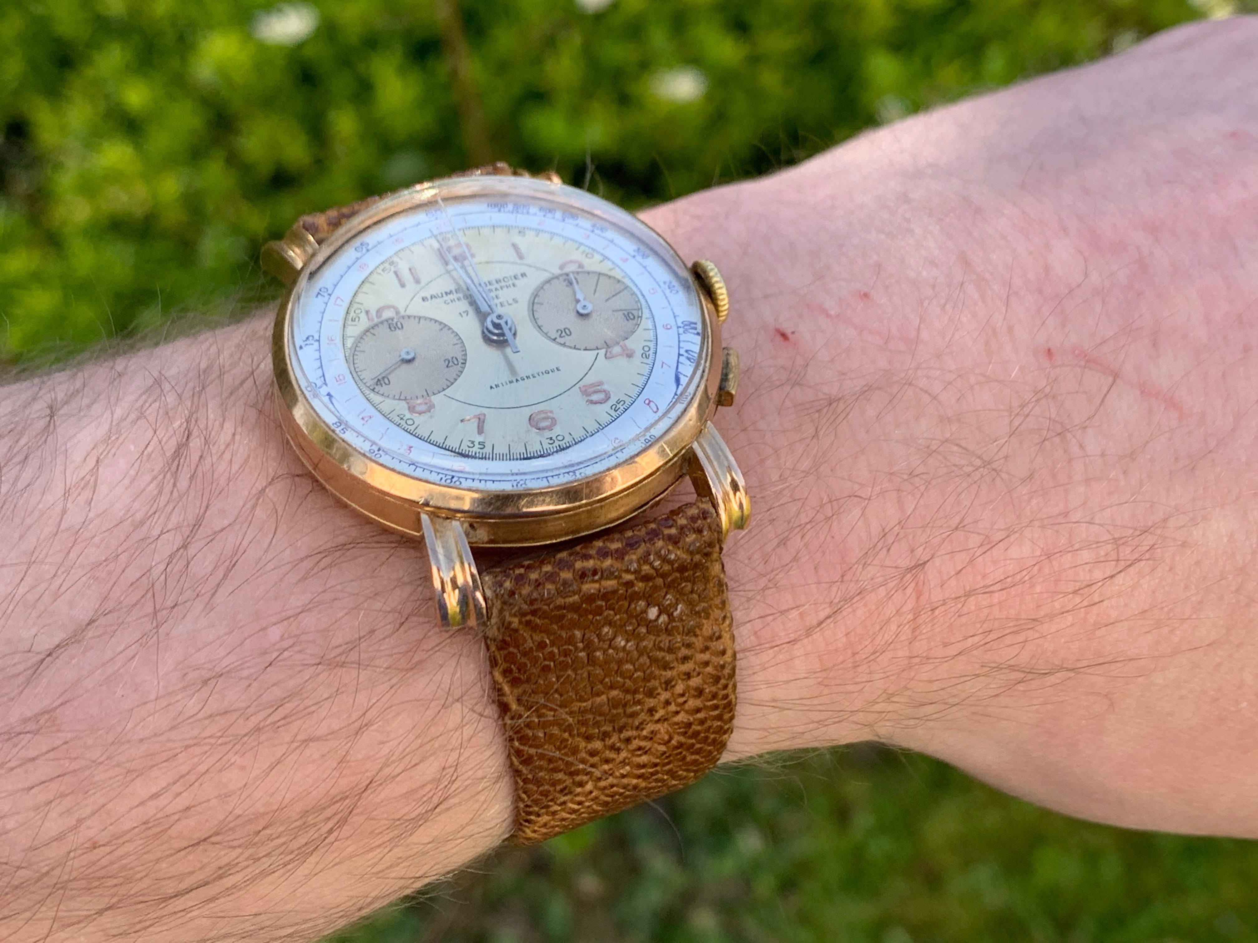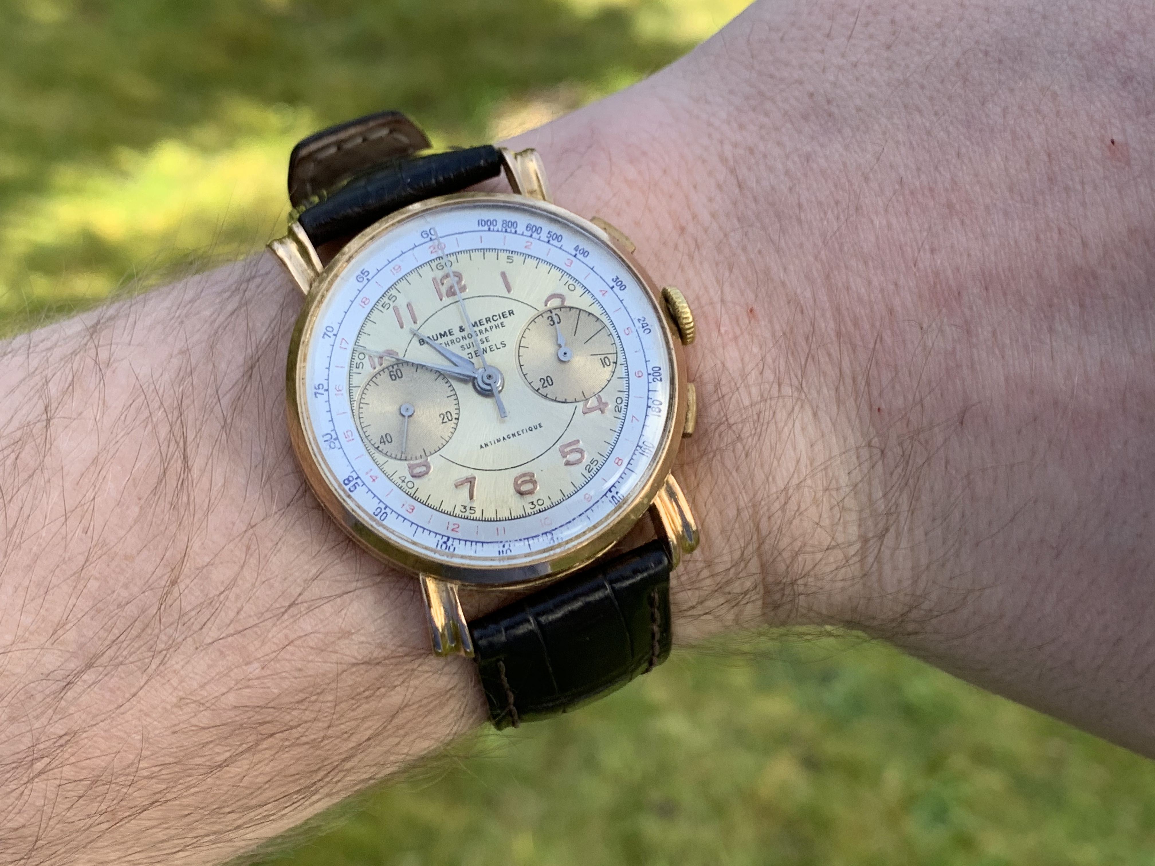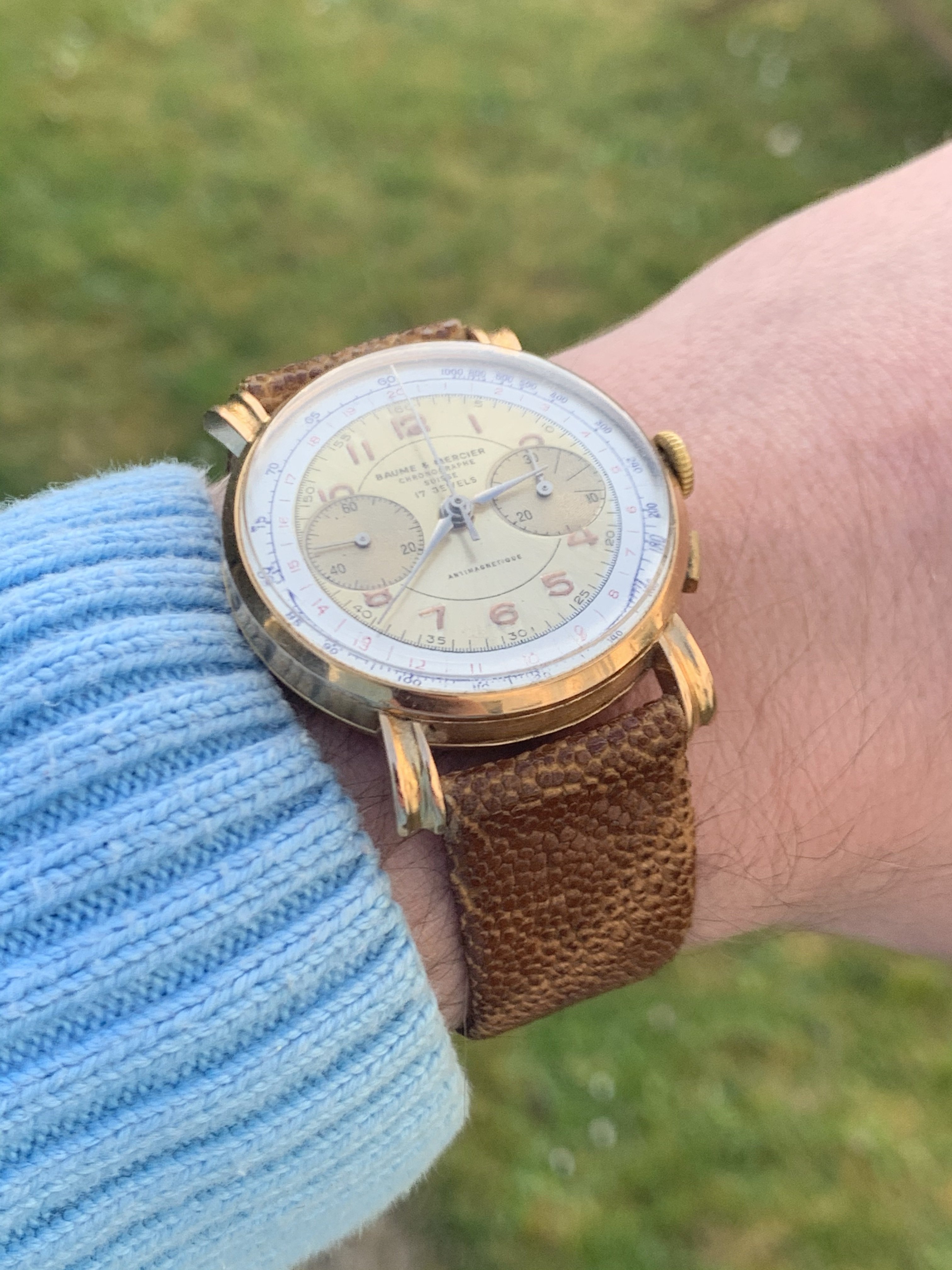 Up for sale is another one of my beauties, this time a hand wind 1950s Baume & Mercier Chronograph which is at a very respectable 37.5mm.