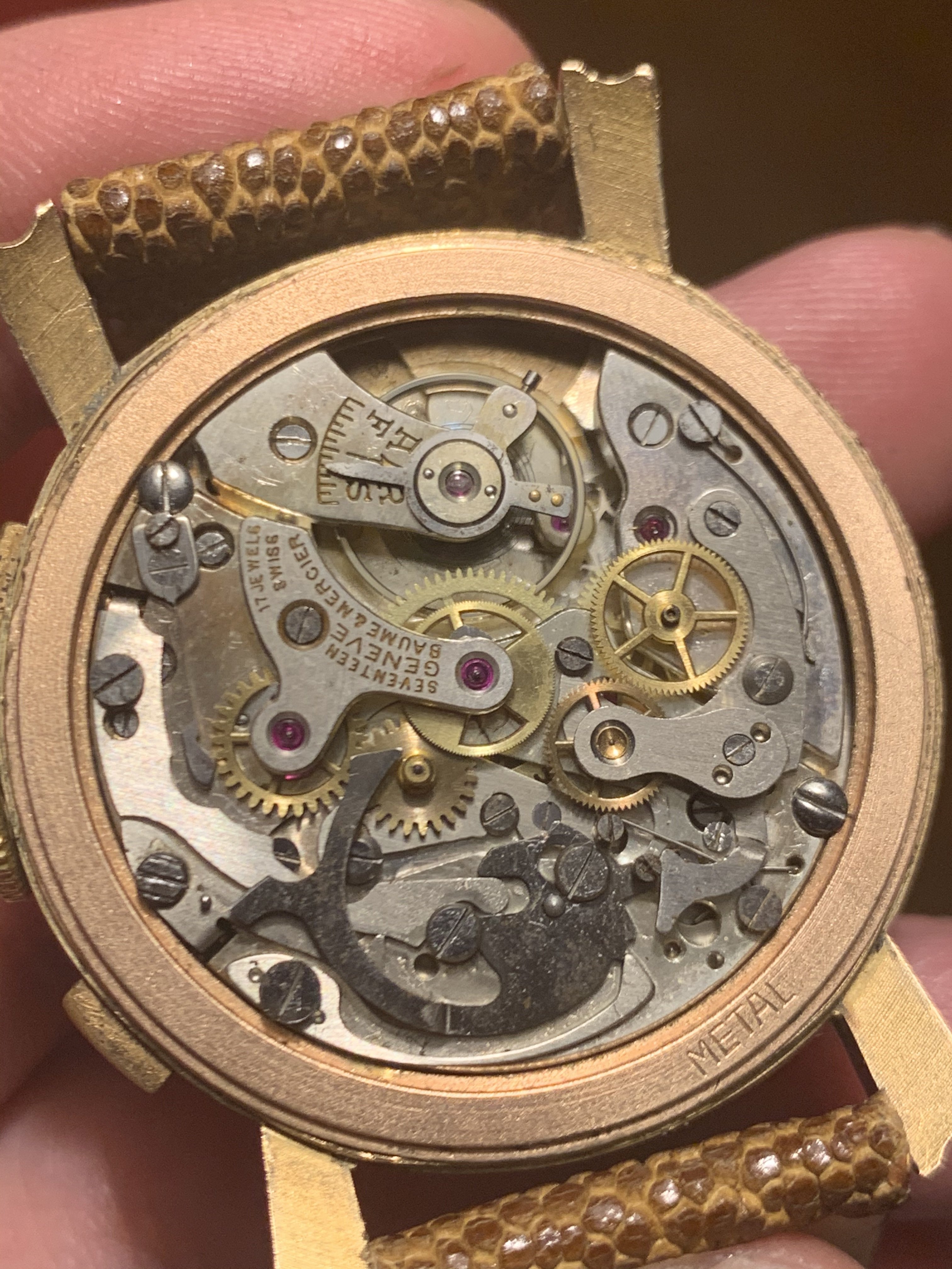 Caseback is a two part caseback, with the main protective metal alloy caseback, with a secondary 18k caseback that fits on top as often was the case on these older chronographs.