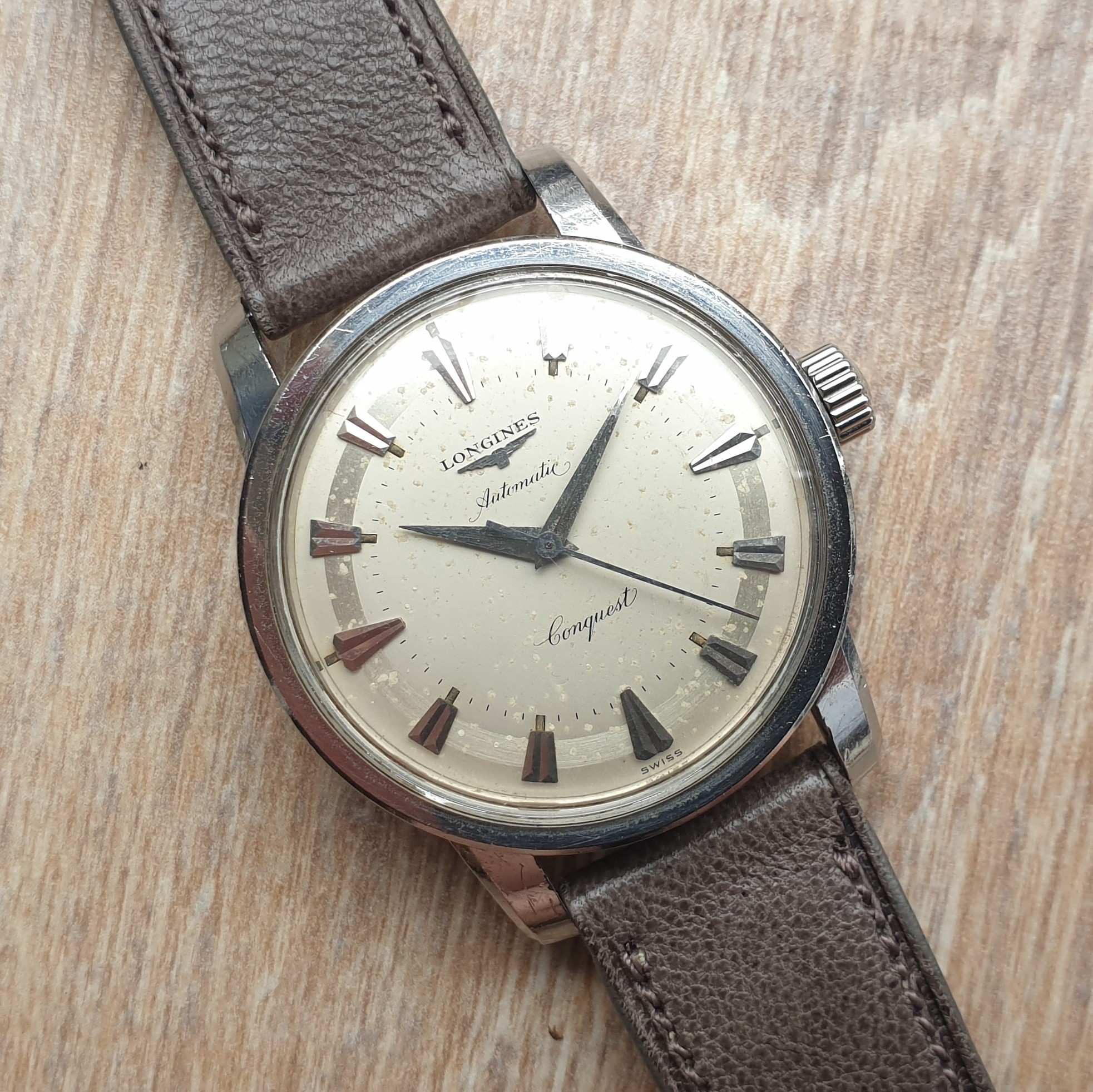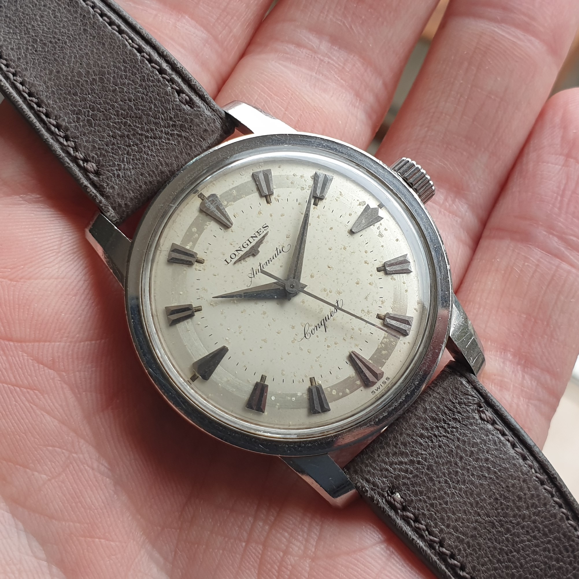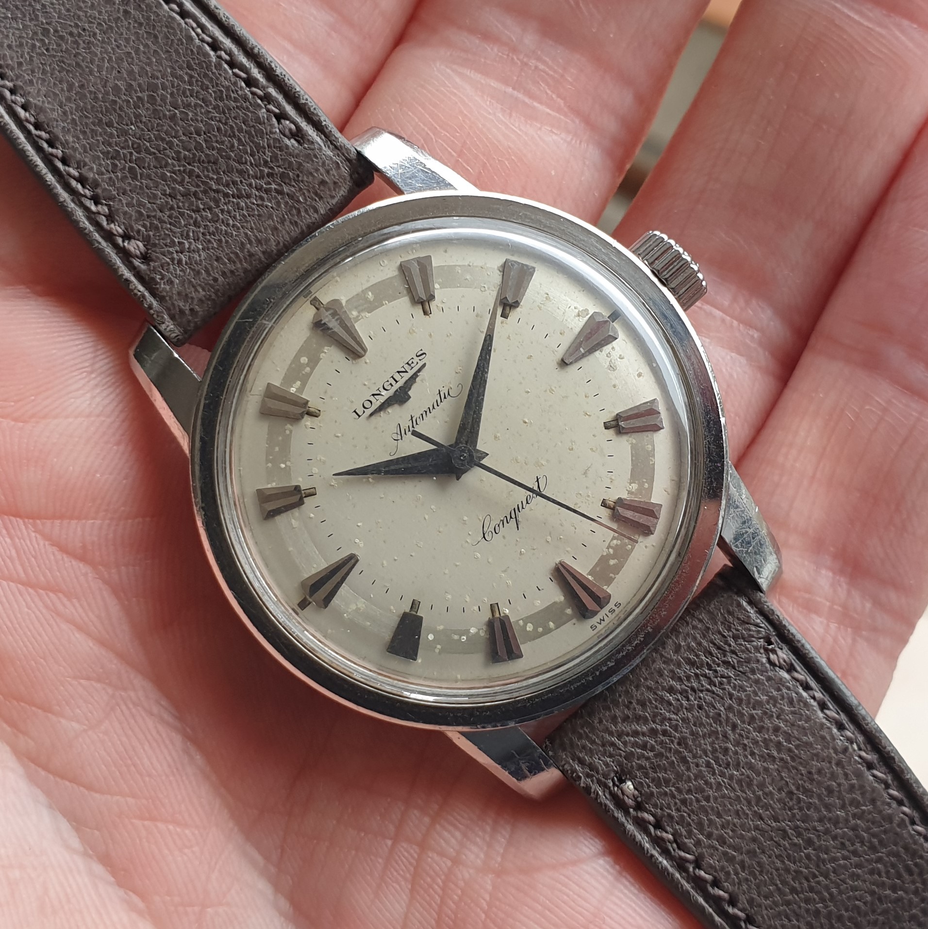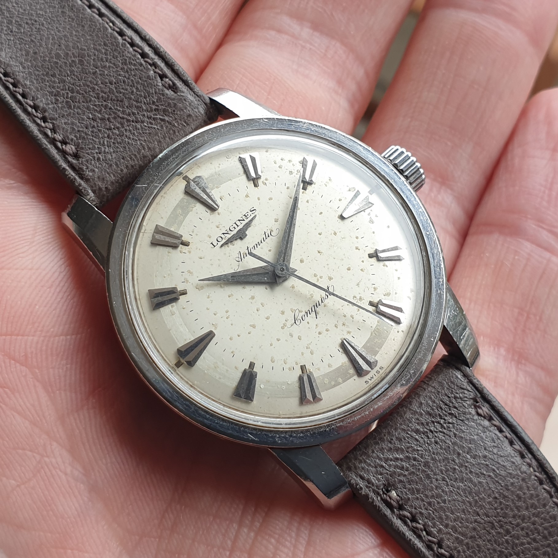 Up for your consideration is my very sharp Longines Conquest. The case is used but among the sharpest I've seen and the medaillon is largely intact, opposed to what you typically see with these refs. I think this is one of the most attractive dials ever designed and I'm only selling it off because I own a ref. 9000 with rose gold details, that I decided I'd prefer to keep.