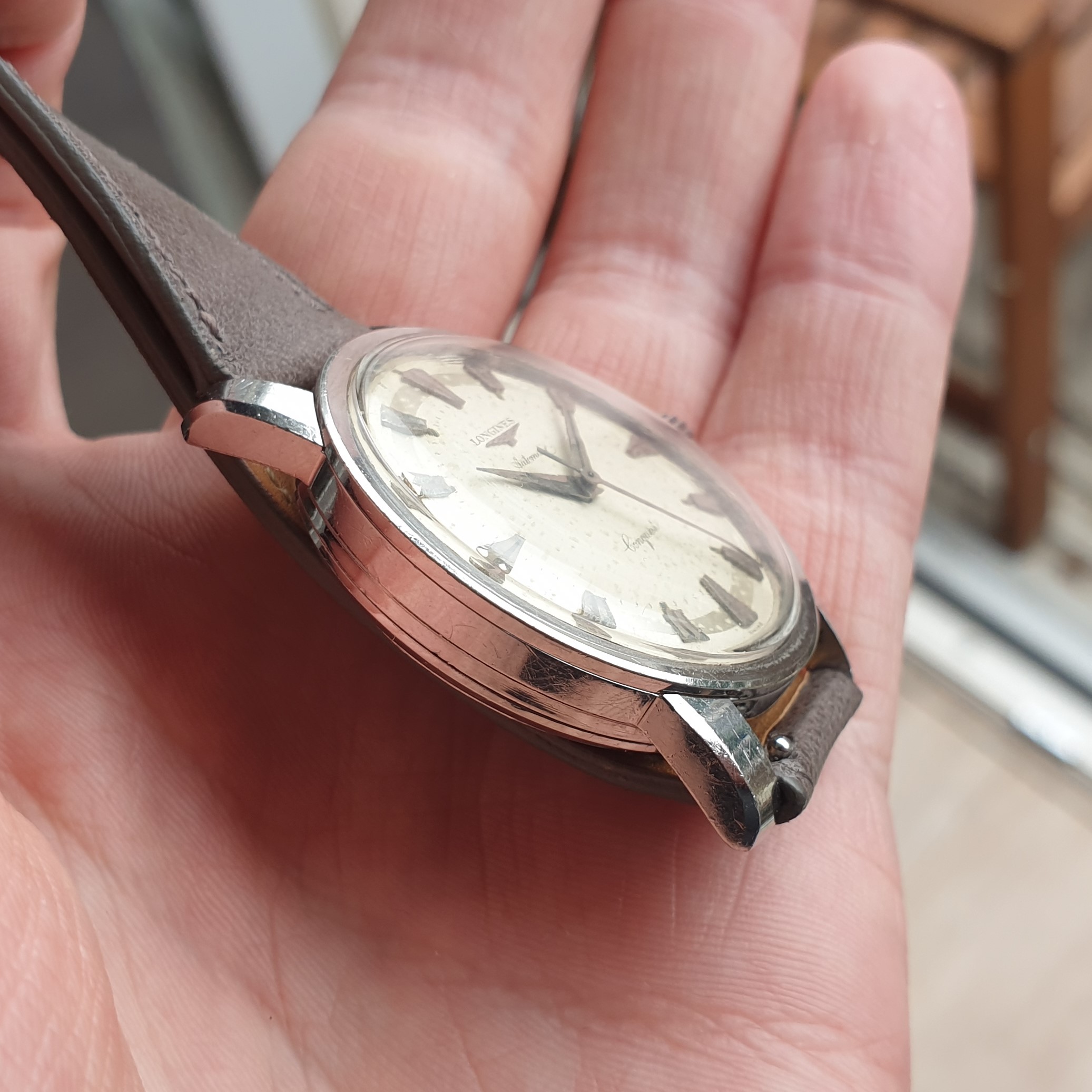 The crown is signed Longines and this perspective nicely shows the scalloped caseback, as well the 'bear claw' lugs.