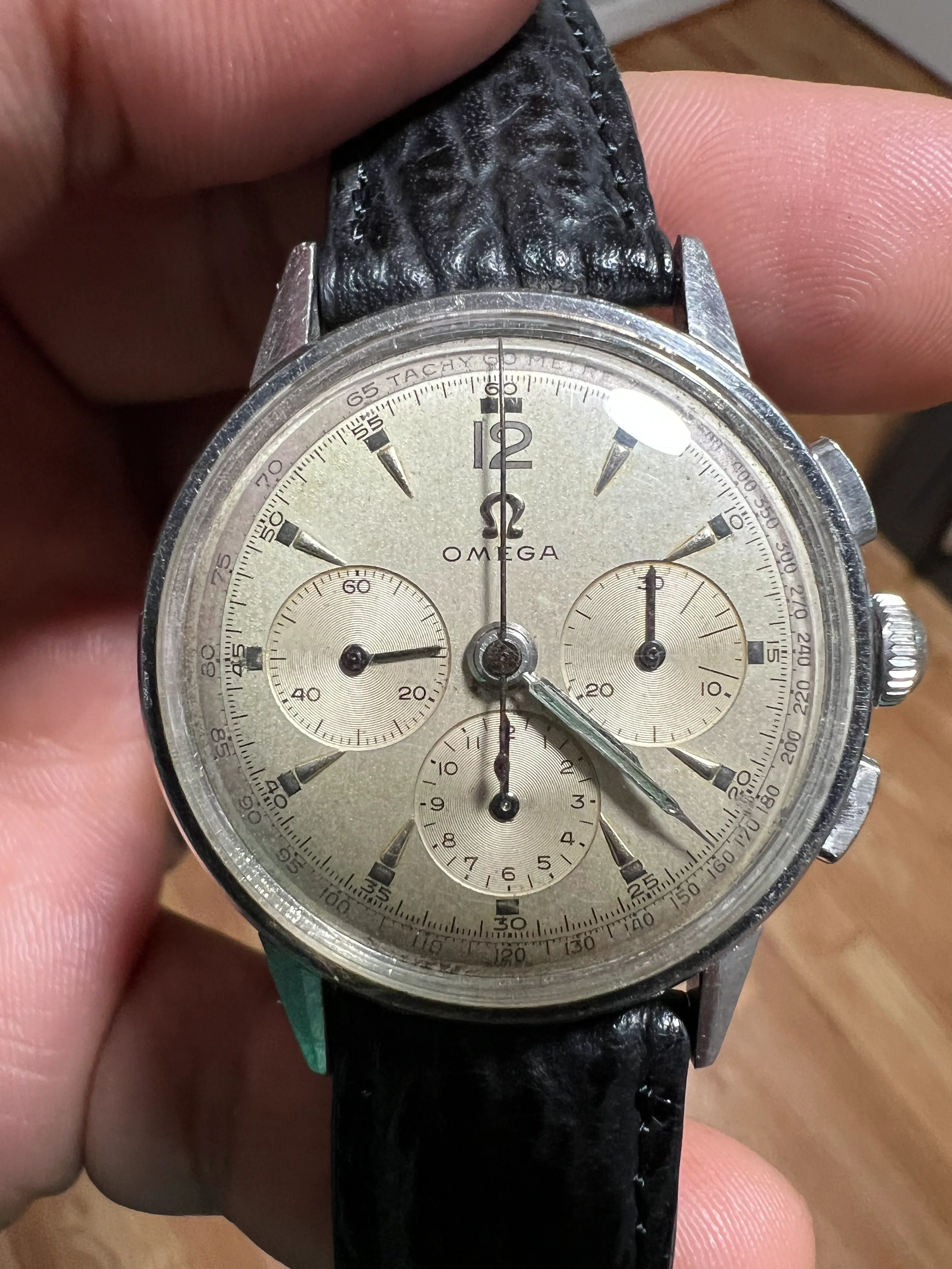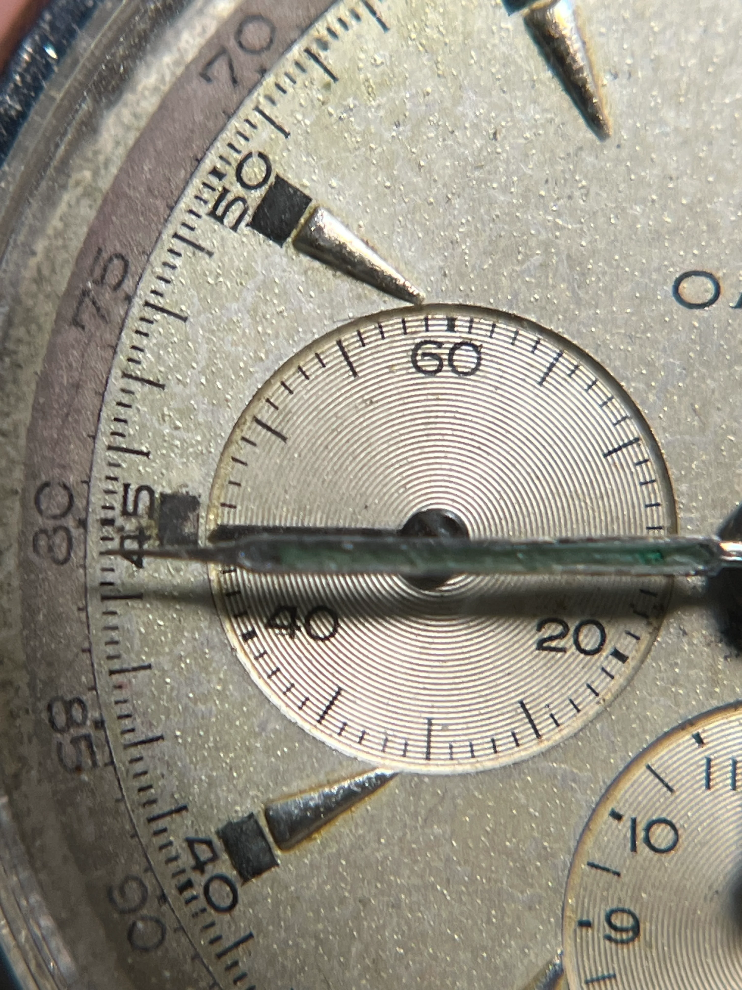 - Hands: Original lumed syringe H&M hands matching dial lume; black stick sub-dial hands and long chrono hand with counterweight