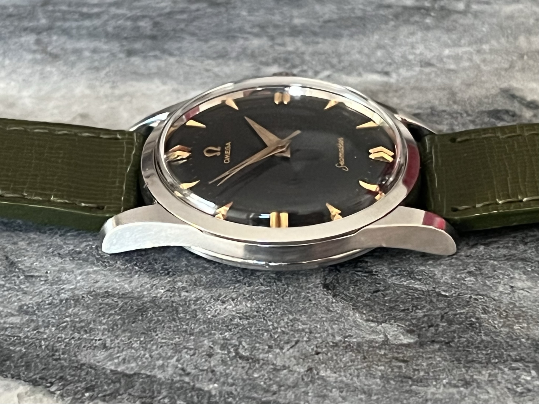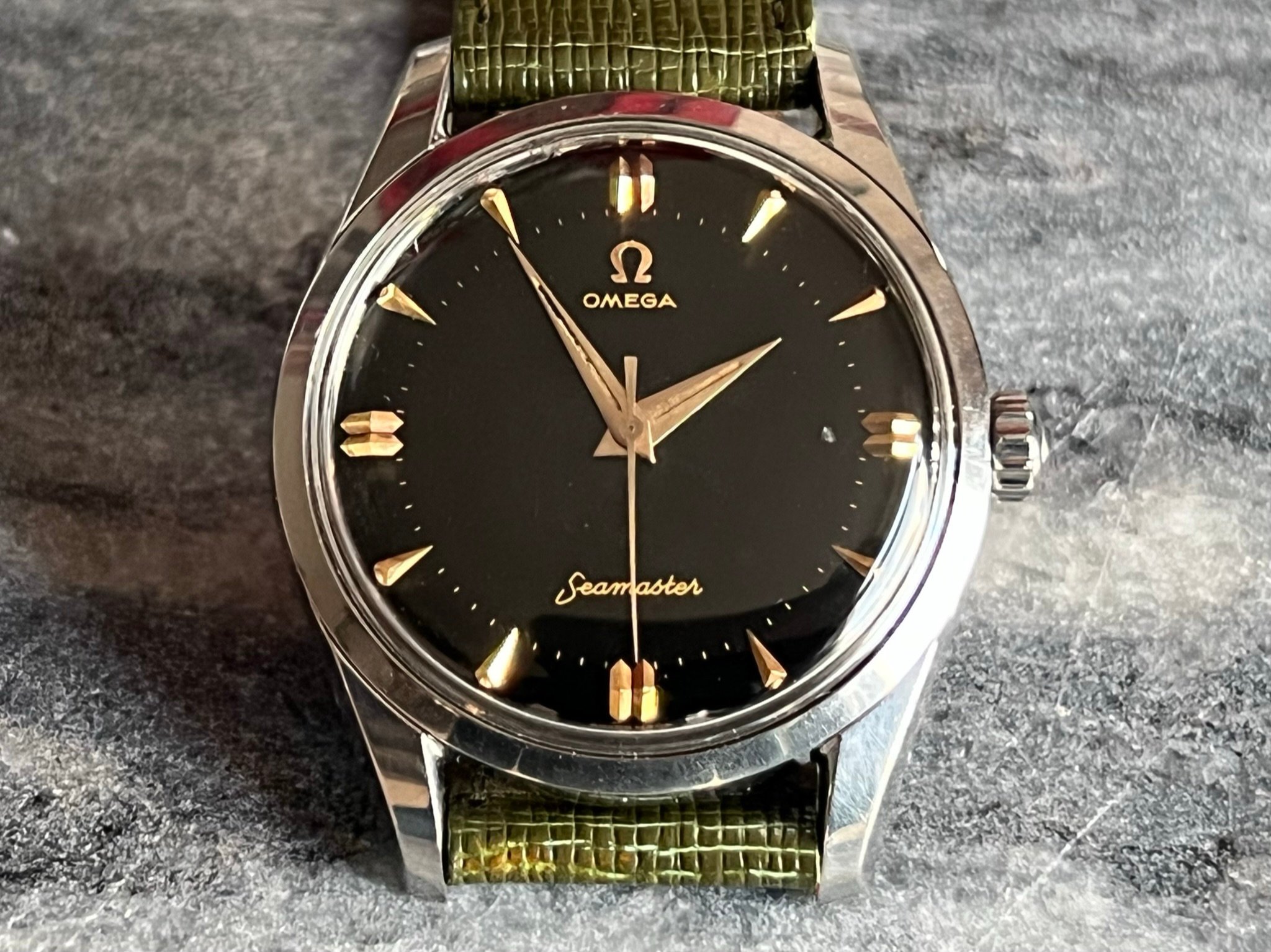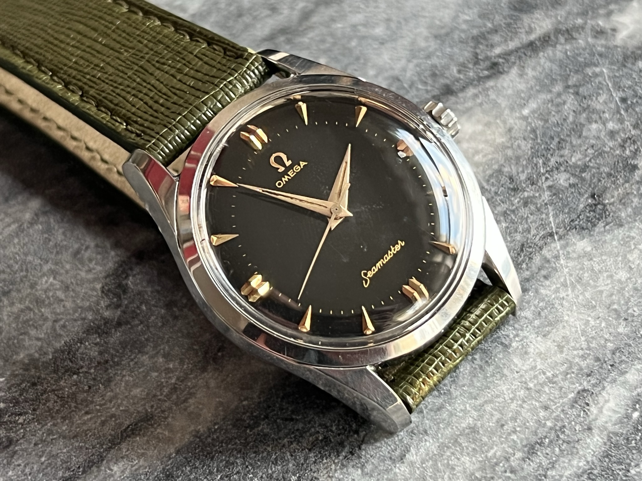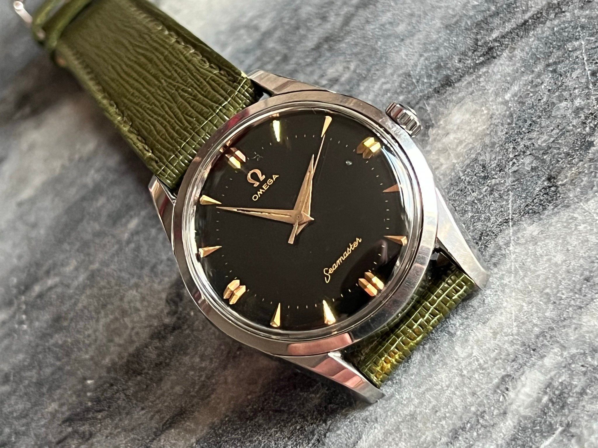 part four of my self-imposed path to refund recent arrivals: A 1950s 36mm Seamaster with a glossy black gilt dial.