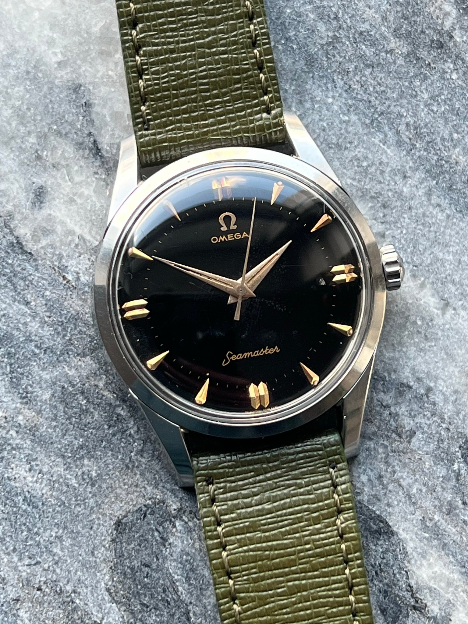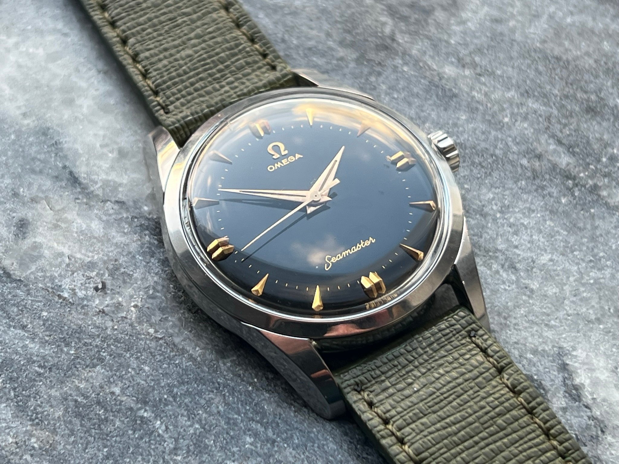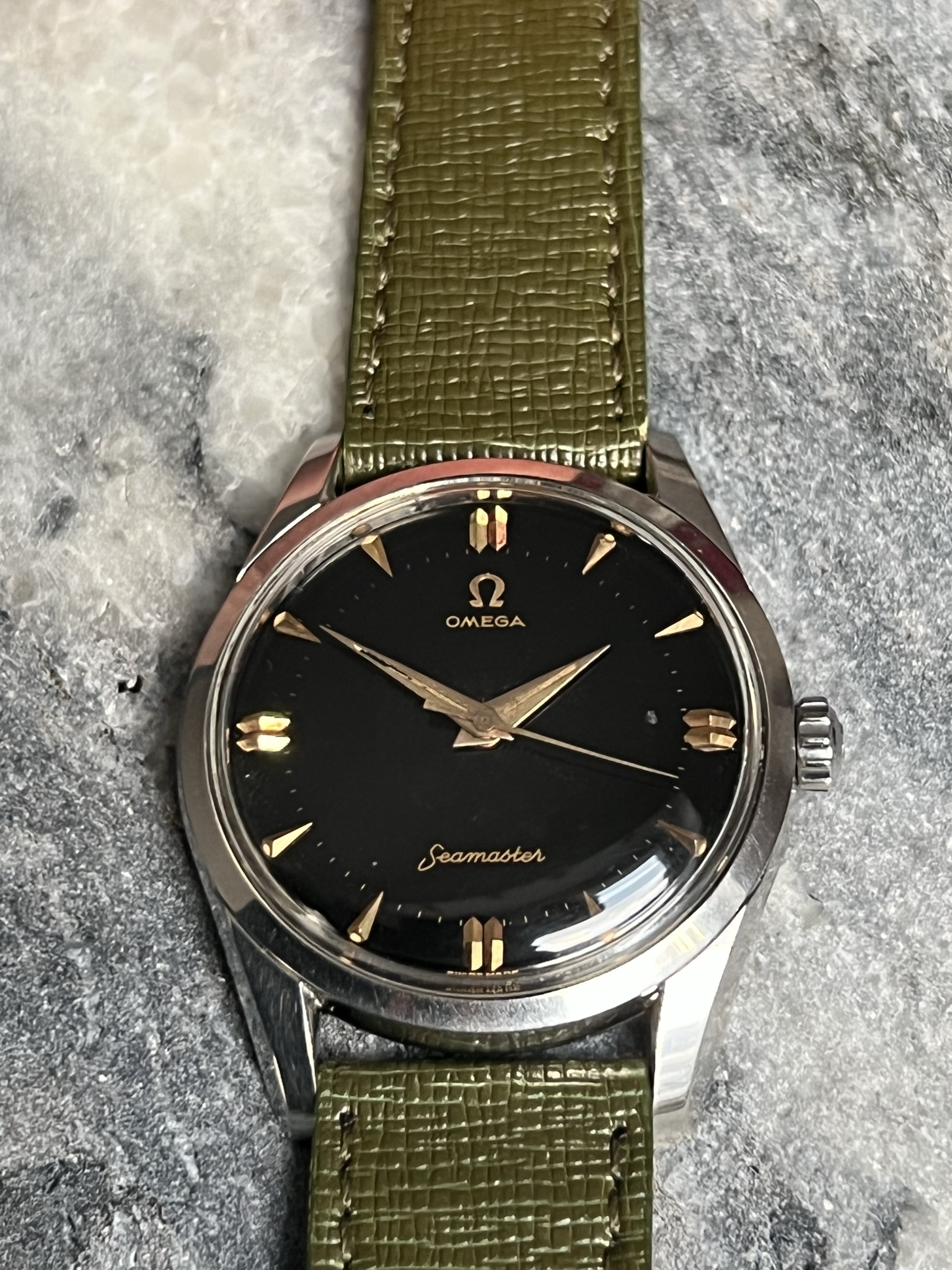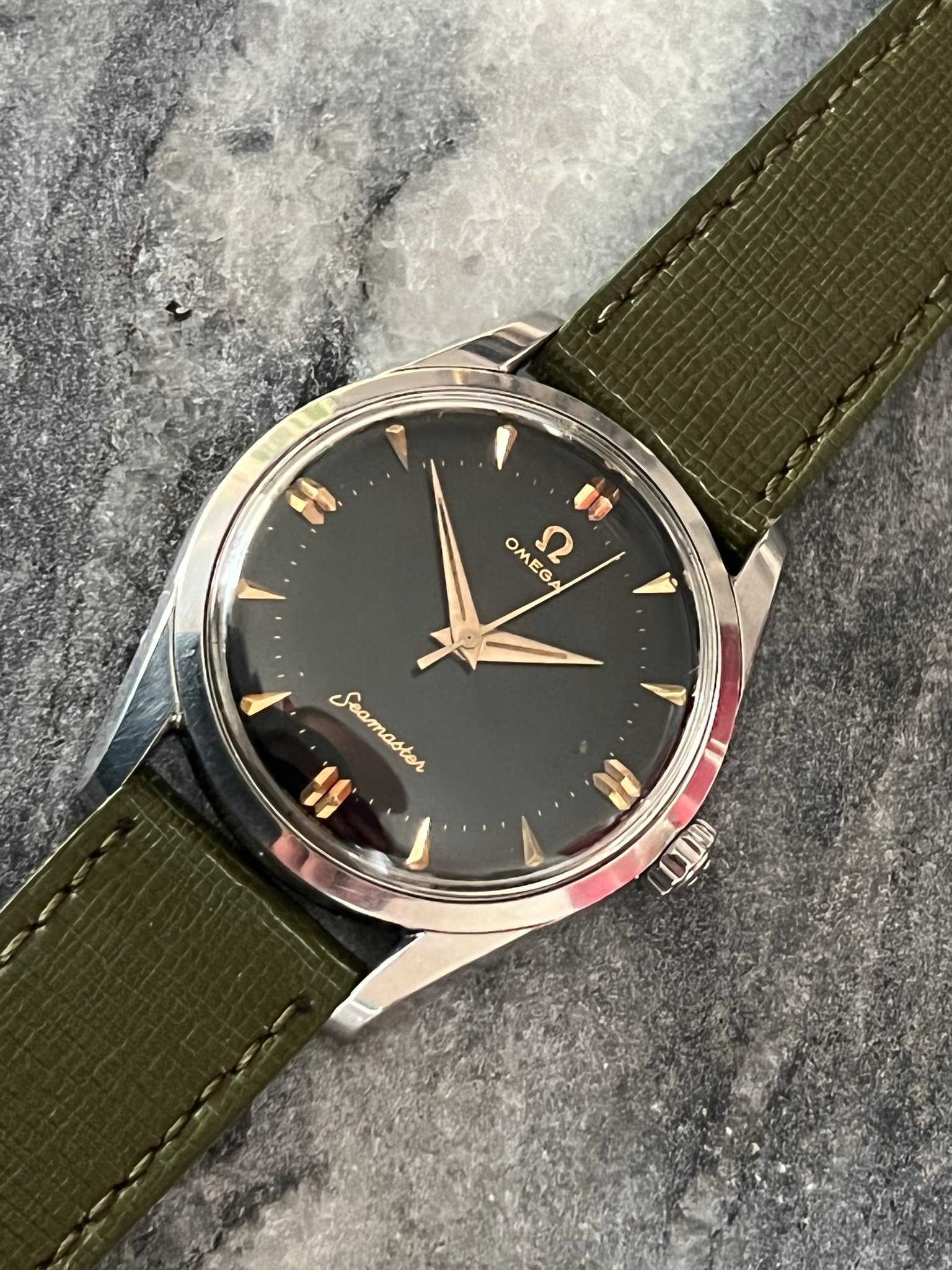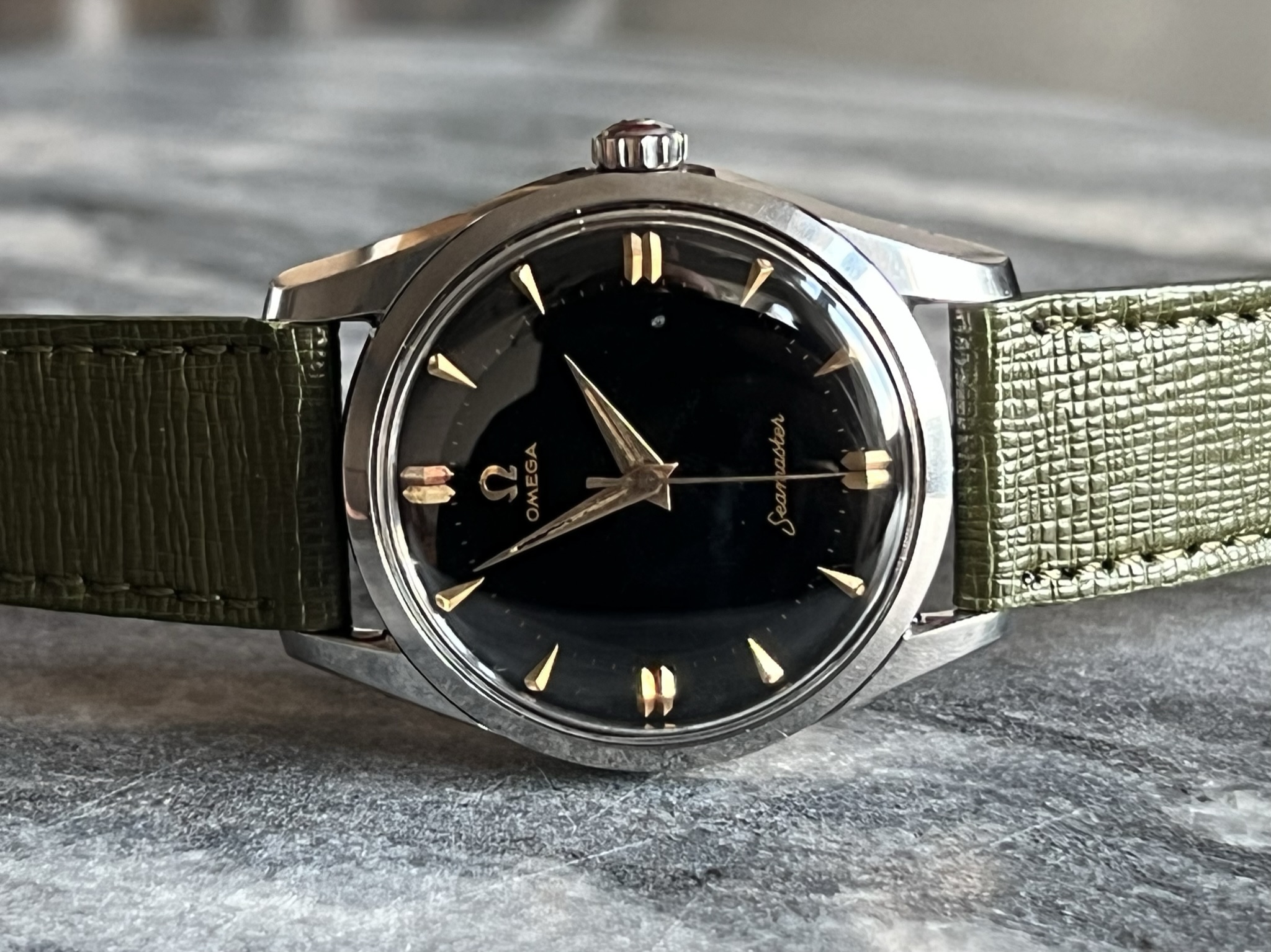 part four of my self-imposed path to refund recent arrivals: A 1950s 36mm Seamaster with a glossy black gilt dial.