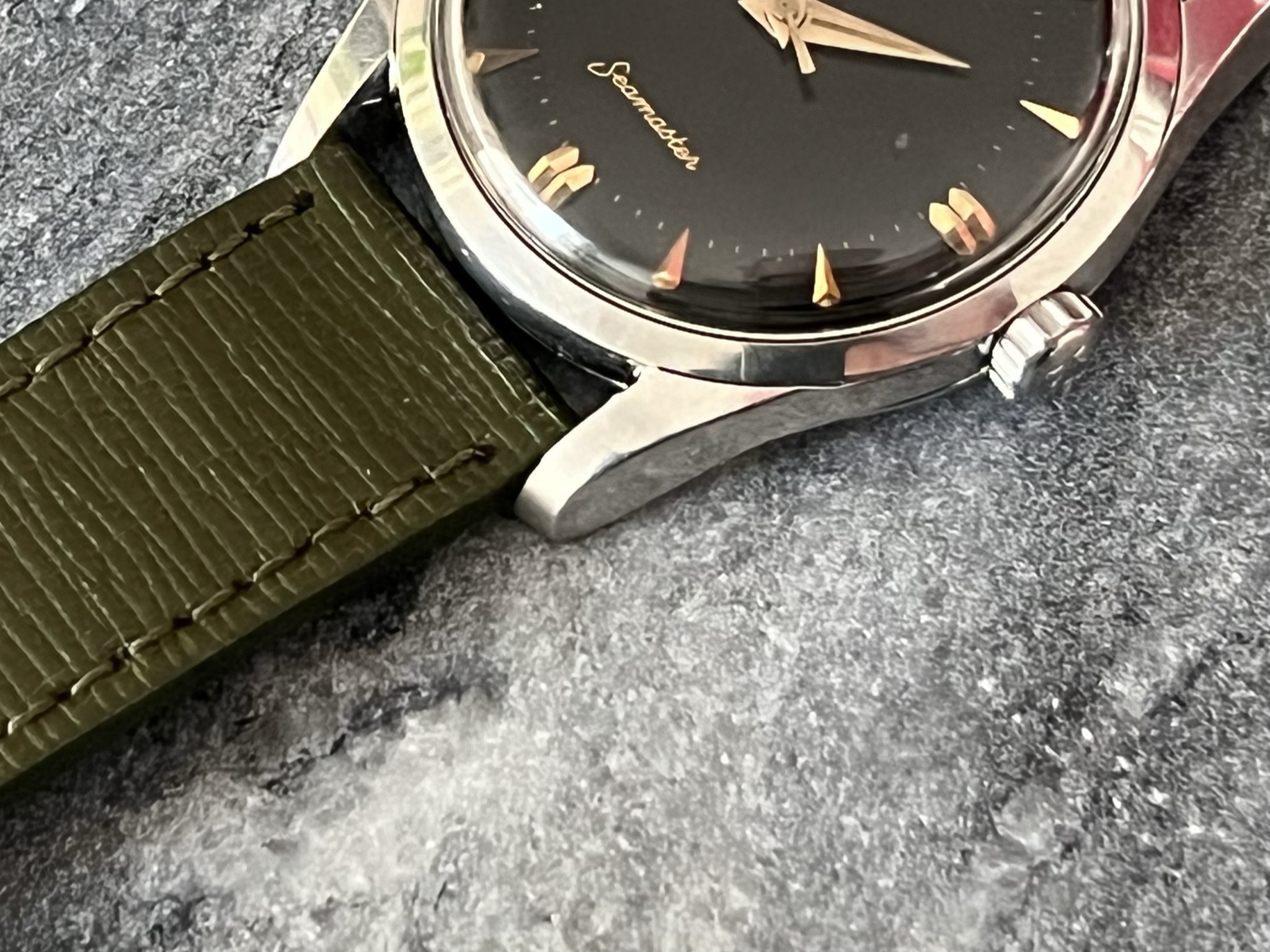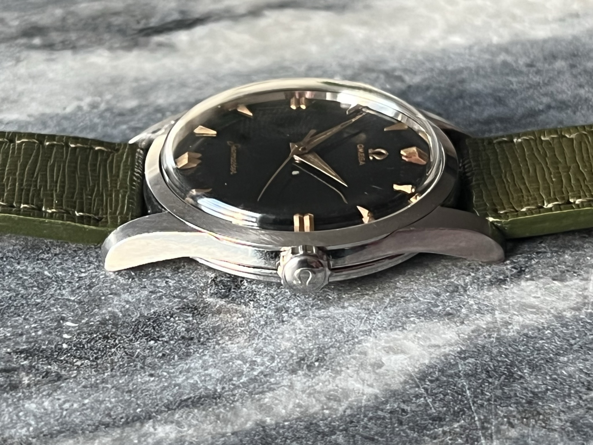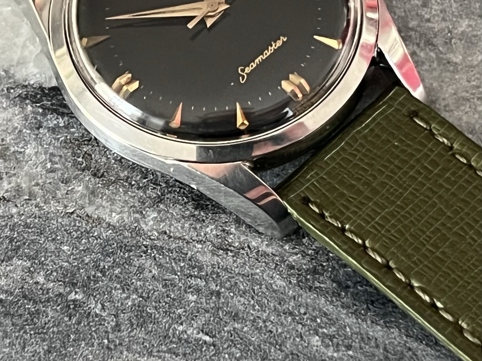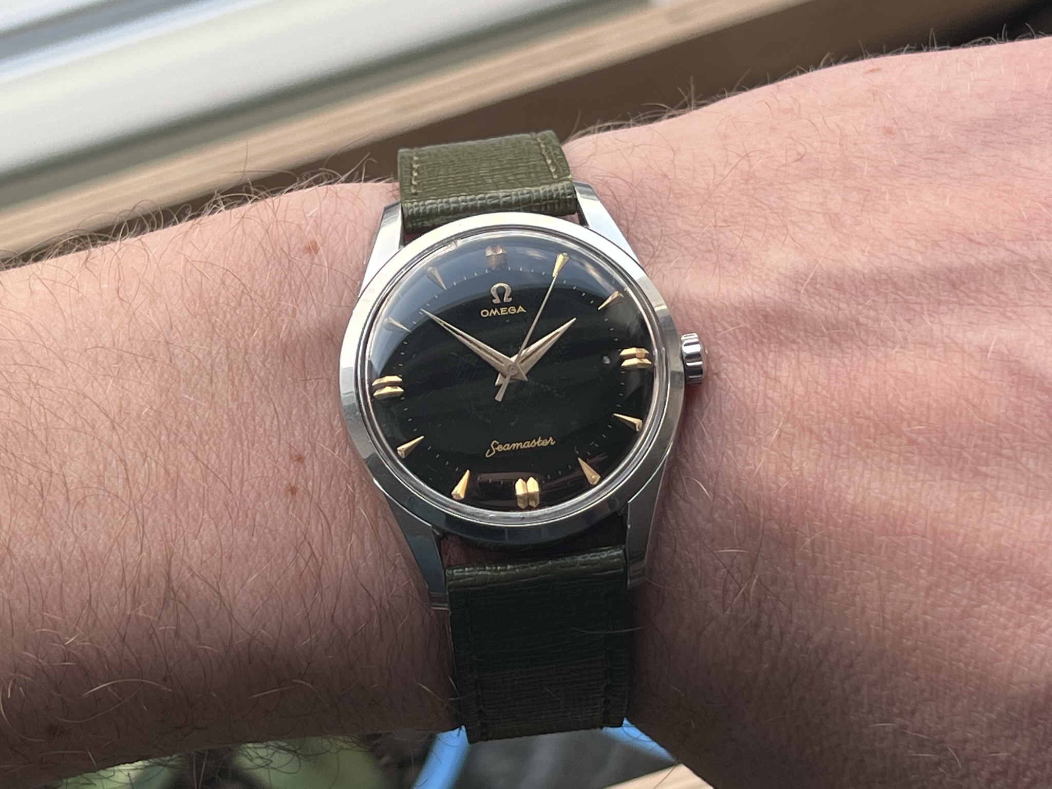 part four of my self-imposed path to refund recent arrivals: A 1950s 36mm Seamaster with a glossy black gilt dial.