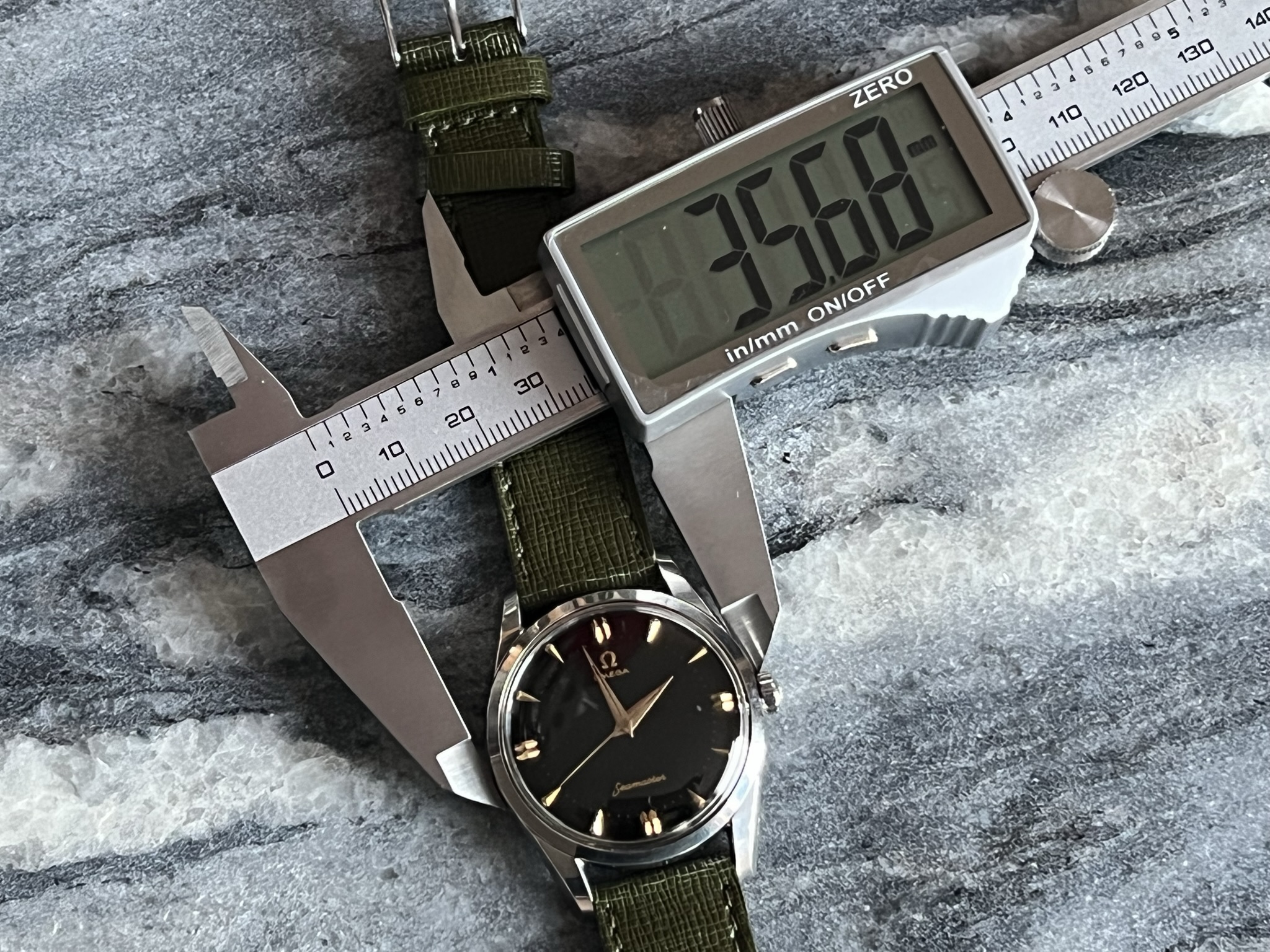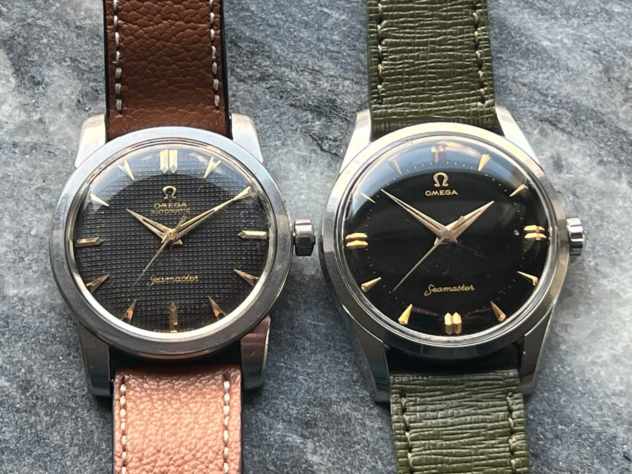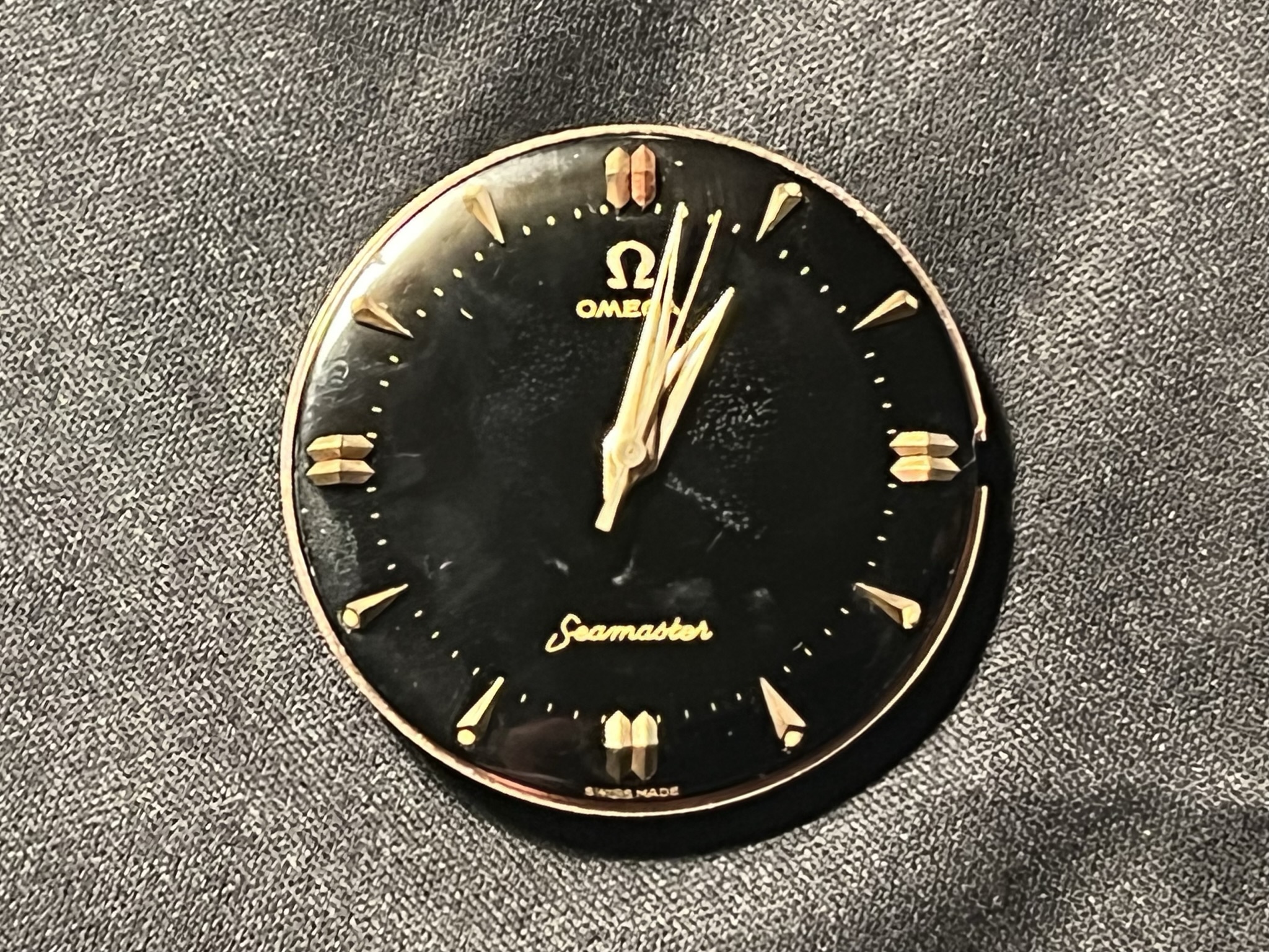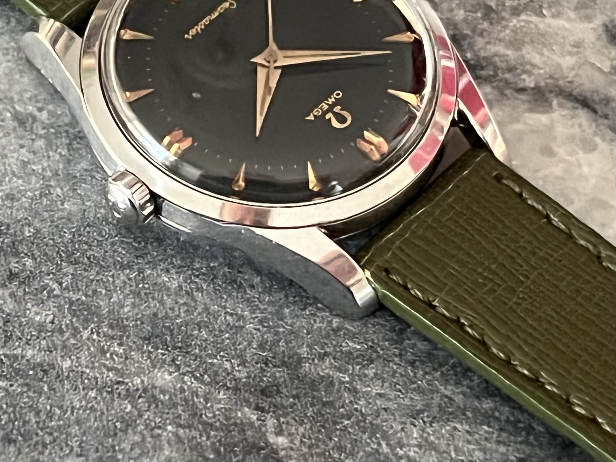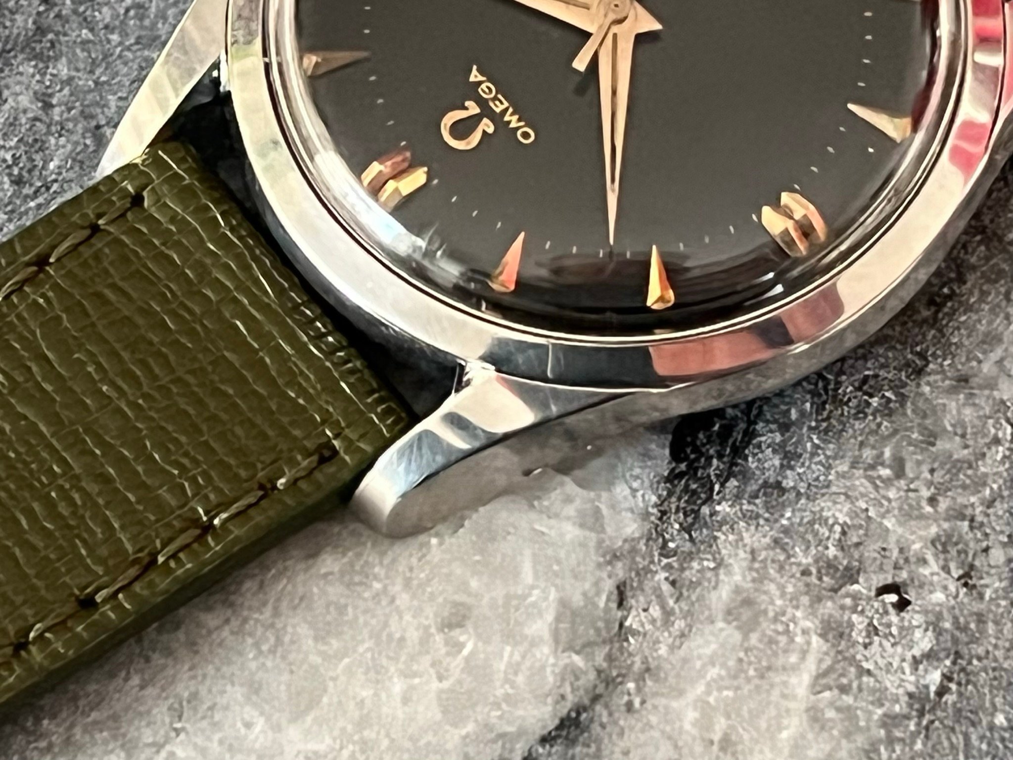 part four of my self-imposed path to refund recent arrivals: A 1950s 36mm Seamaster with a glossy black gilt dial.
