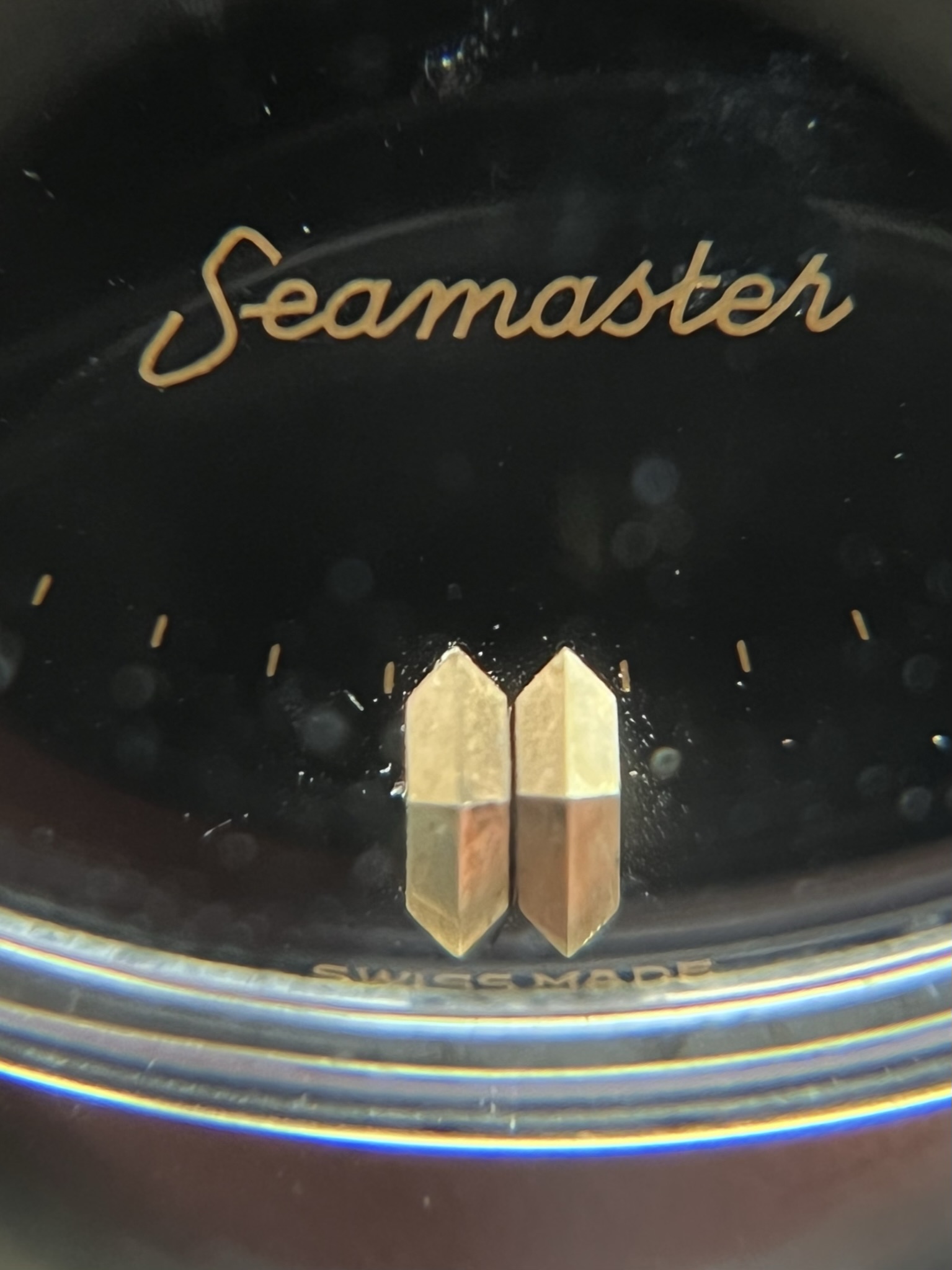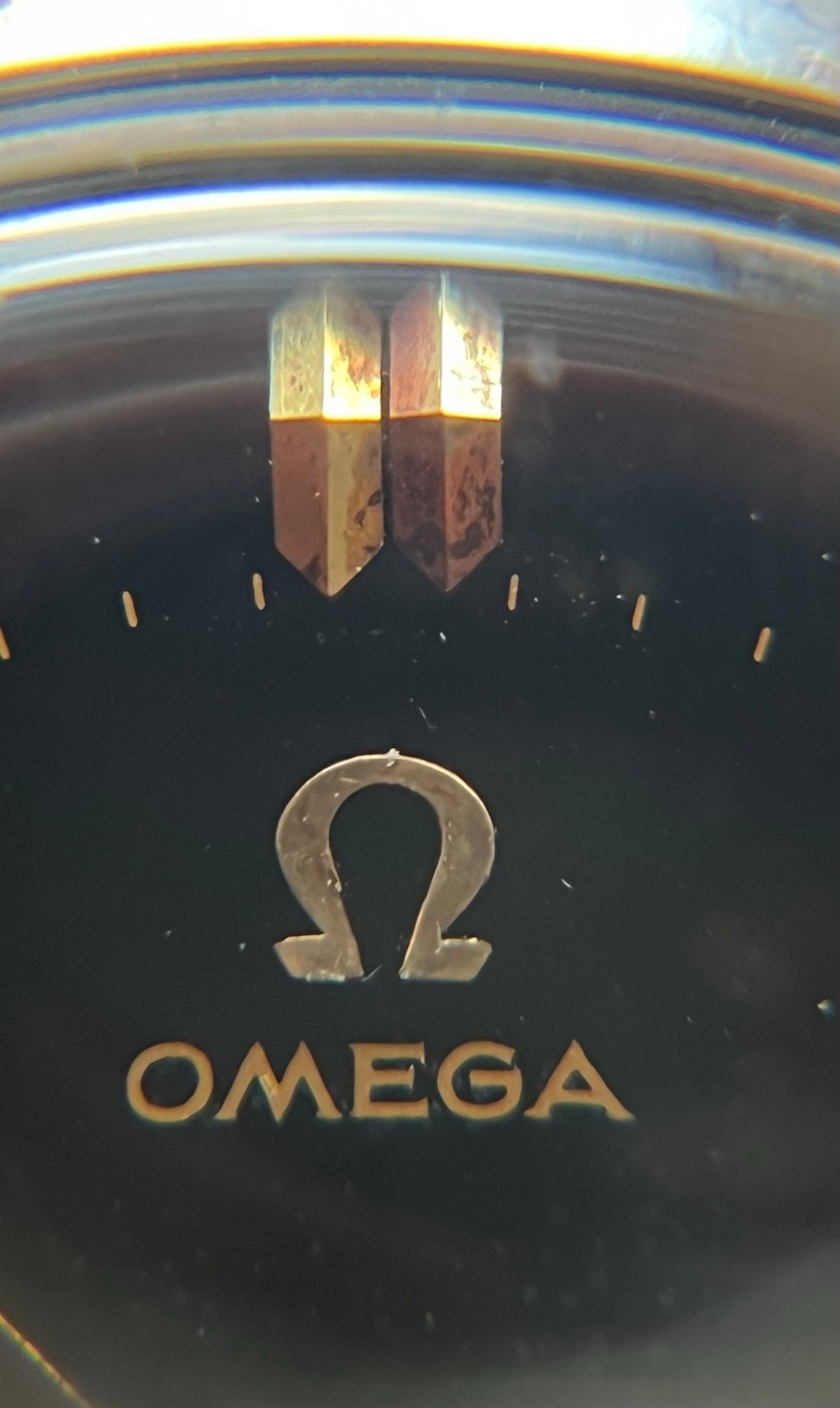 Dial & Hands: Completely original black dial with a glossy finish, all the writing is fully there and really pops out from the deep black. Yellow gold indices and hands, with the right indice at 12 showing discoloration. Lume has aged nicely in a beige-brown, some lume loss in the minute hand. Do note that the dot on 3 is on the plexi, not the dial. However, the dial does show some wear. There is a light layer of residue in some places, most notably above the Seamaster writing, right of the center, and at the outer edge in the left bottom quarter. That being said, I found it’s basically impossible to really depict this in pictures with the plexi on and it’s not very noticeable with the bear eye, except for in some specific angles. I’d say that this is a very attractive watch on the wrist, but I want to highlight the negative side as much as I can, so here’s a picture in artificial light, dial extracted from the case, in the worst possible angle of light. I’ve never managed to make it look anywhere near as bad on the wrist, but regardless:
