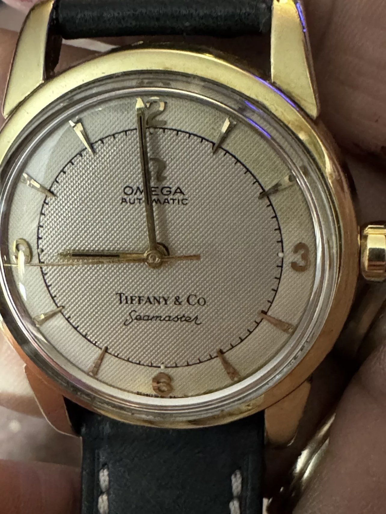 I have found examples like it, that match the dial details from the 1950’s….except I can only find one other example of a 1950’s bumper model with a Tiffany stamp. I have found examples from as early as the 1940’s with Tiffany stamps, and Omega pocket watches with Tiffany stamps. So, there were definitely Omega watches in the 50’s with Tiffany stamps. but I don’t know, something about this feels too good to be true.
