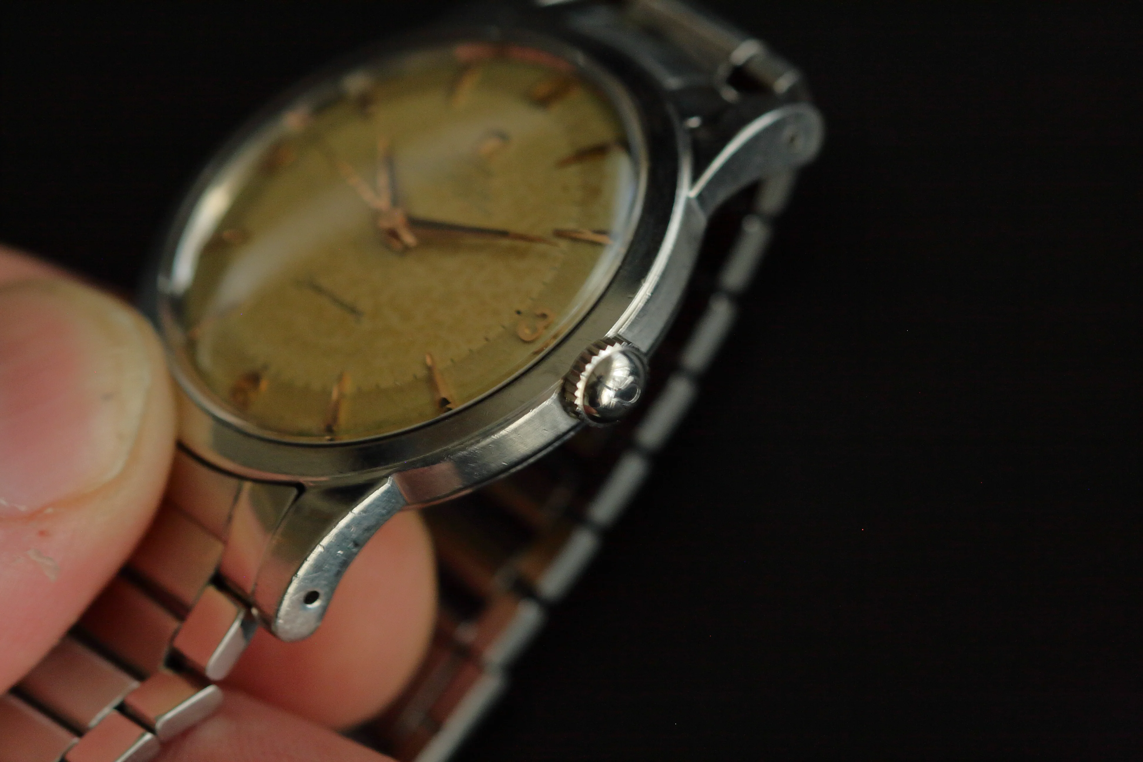 The 36mm steel screw back case is in very good shape with strong lugs and a good bezel. These wear substantially larger on the wrist when compared to the more common 34.5mm references of the time. The crown is the bowler hat type and period correct with the thin logo.