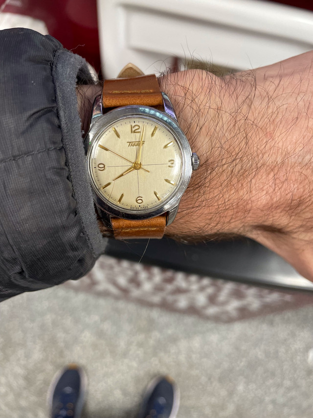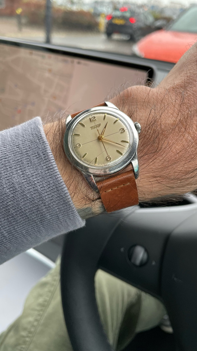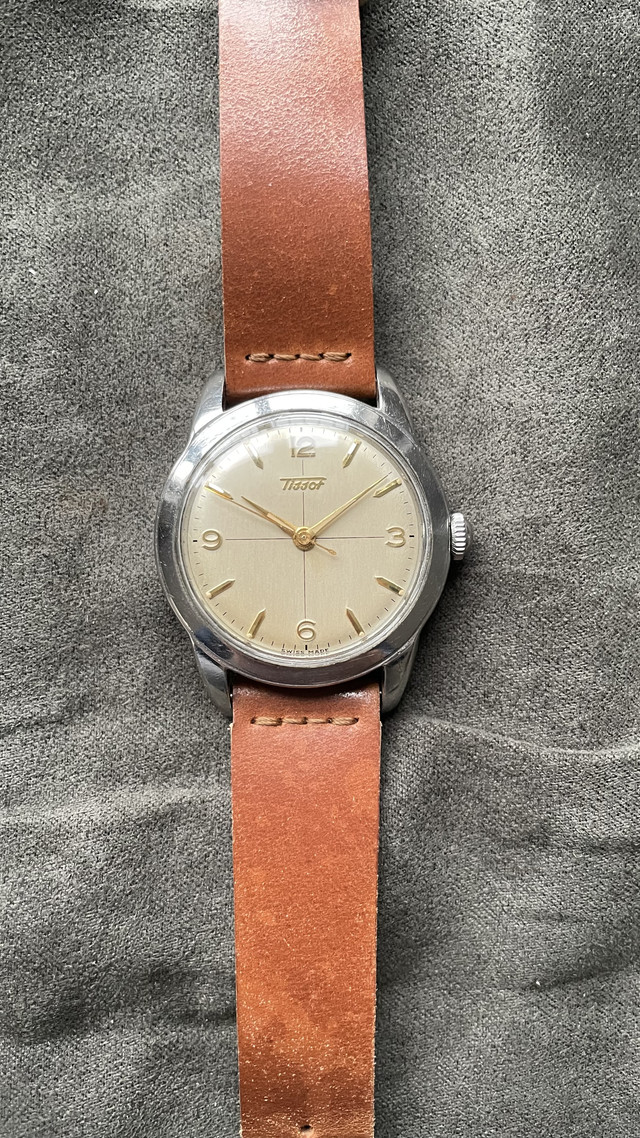 The manual wind movement has been serviced by Guy Jeffrey approximately 1 year ago so is running very well. It winds as expected via what must be a replacement crown as it is signed Omega. It’s worth noting that many years ago, Tissot and Omega were sister companies so I assume parts were interchangeable. This crown must have been replaced many years ago as it is in keeping with the rest of the condition of the watch.