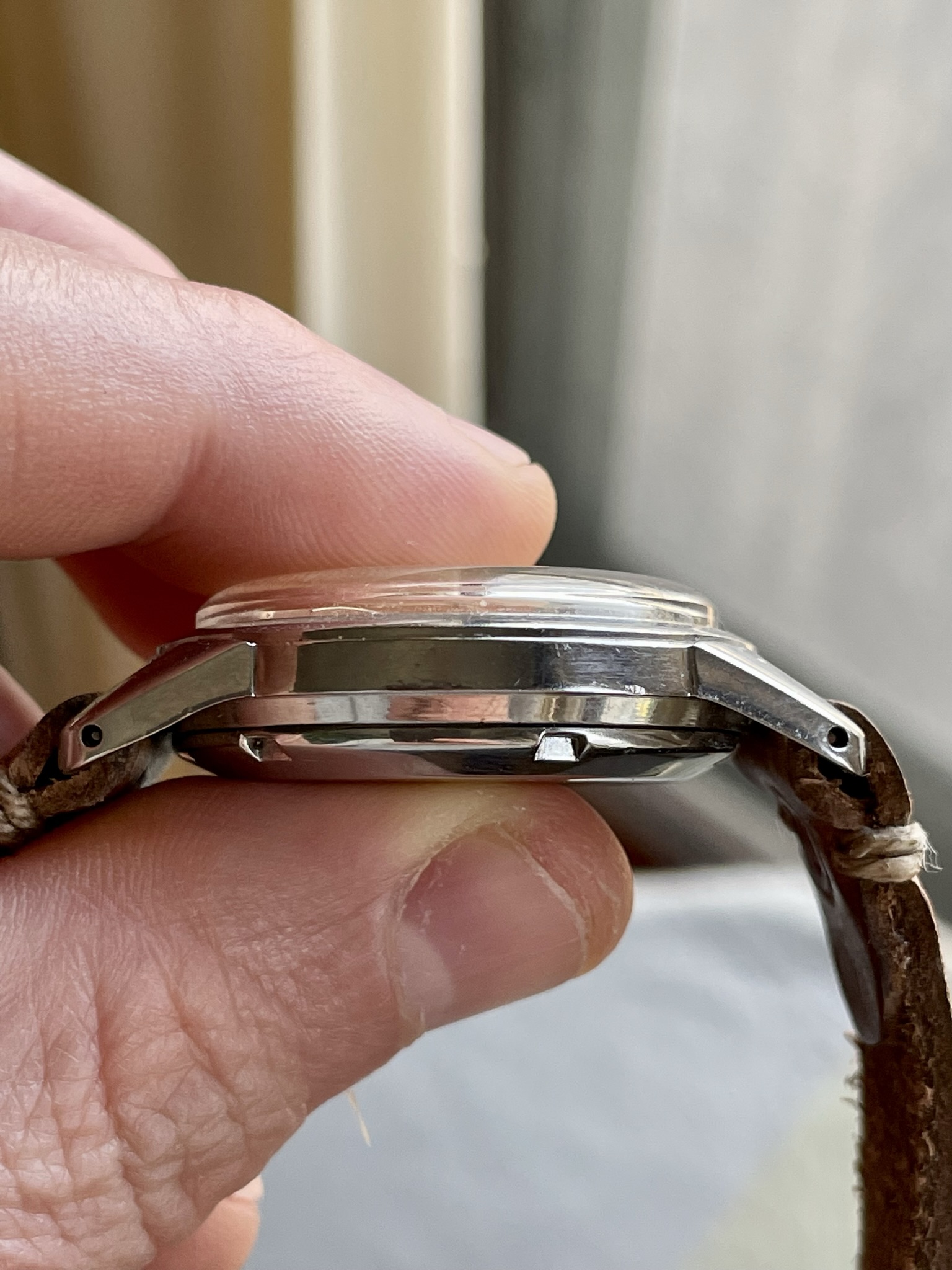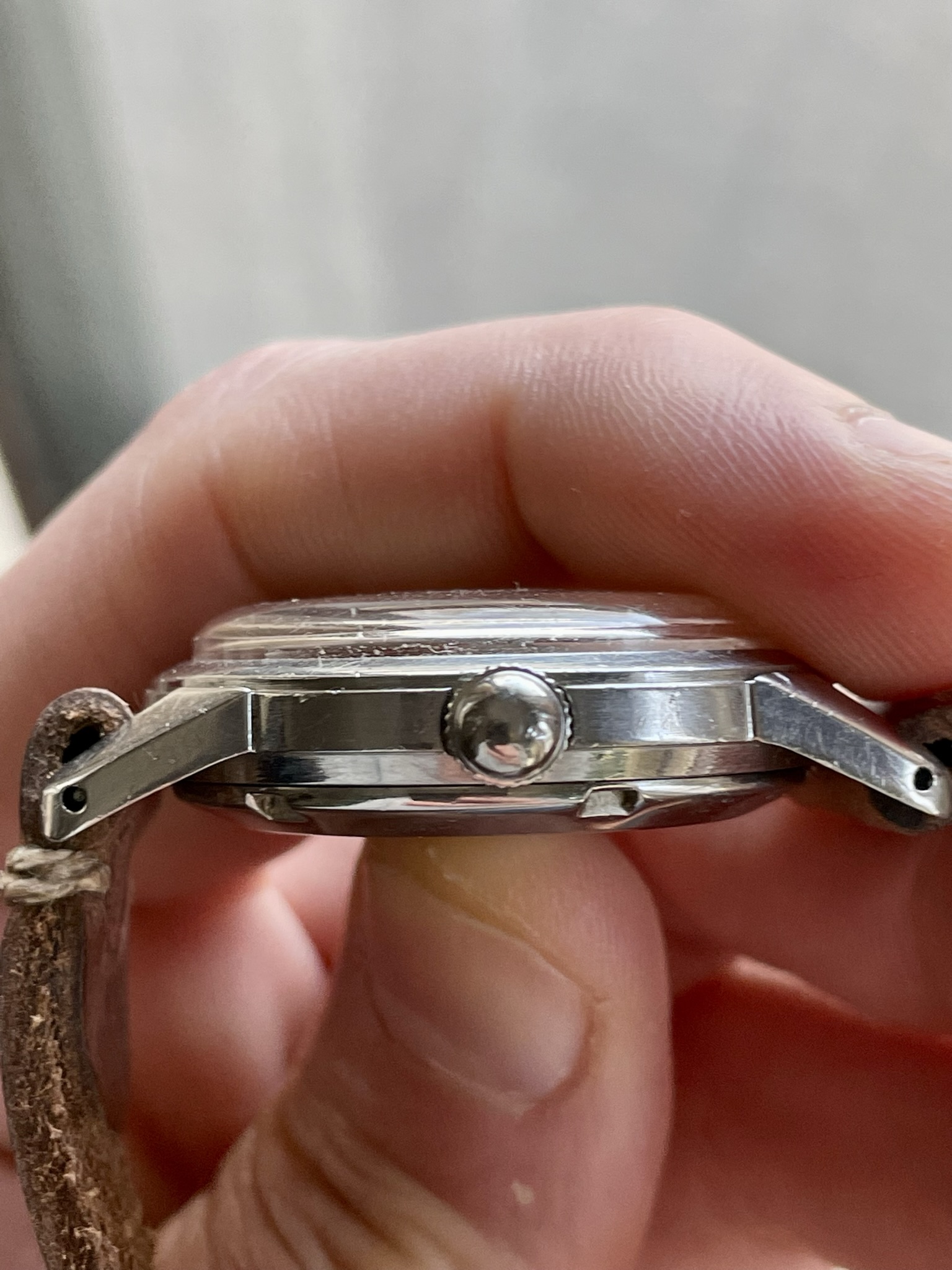 Dial is in great shape and the case is honest (there are couple of blemishes as seen in the pictures). Everything appears original to my knowledge, including the crown. There is considerable lume loss in the hands. The watch winds and sets smoothly. The date wheel has no quickset function but it can be set both forwards and backwards. I just timed it over 24 hours and it was off about 2 minutes. Neither myself nor the previous owner had it serviced. Included is the strap seen in the photos.