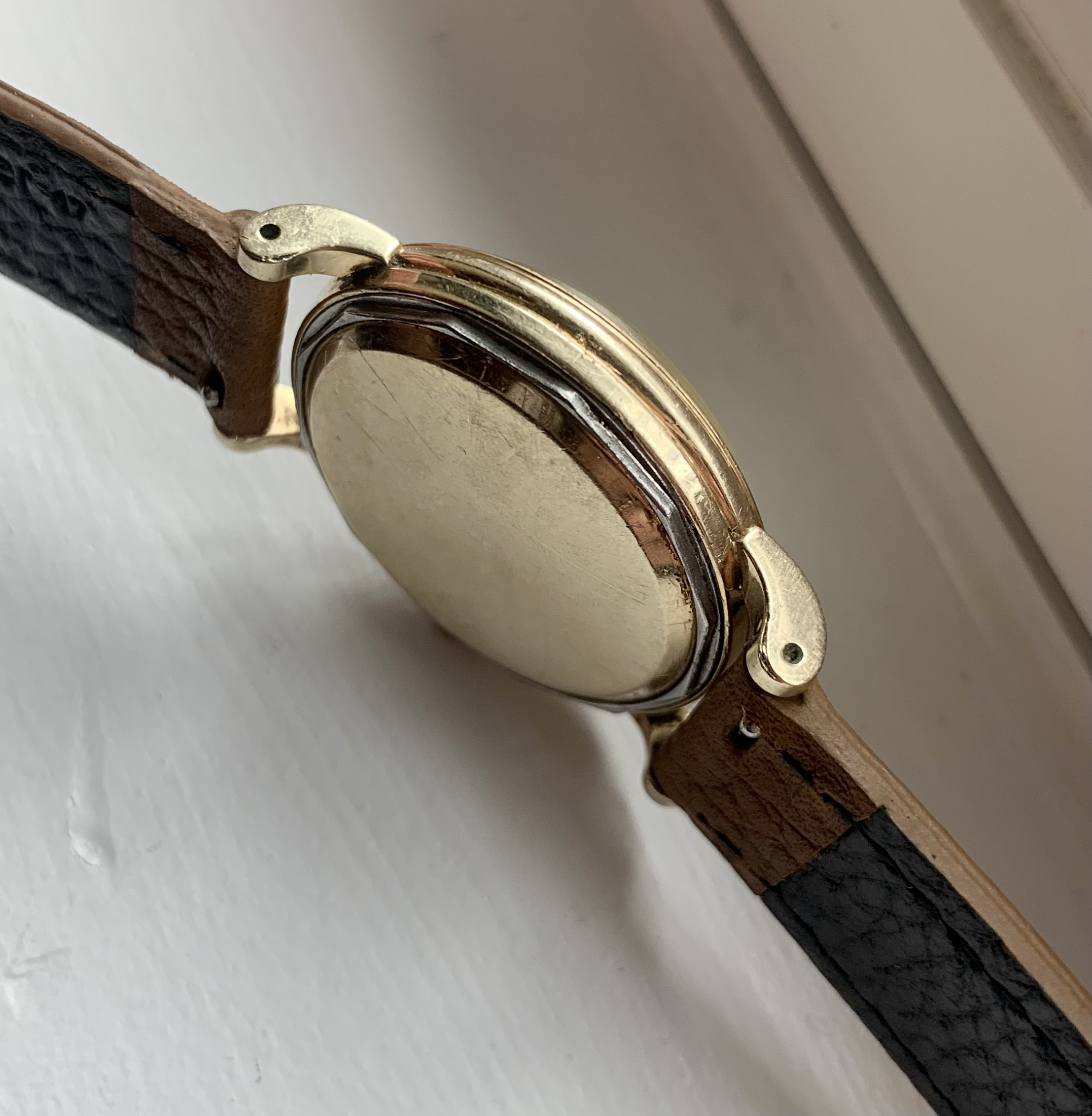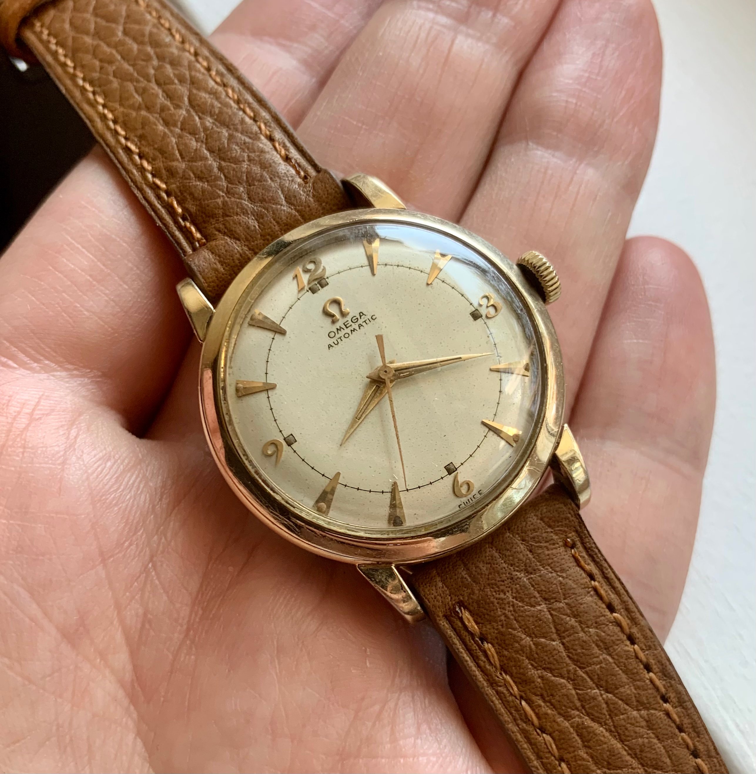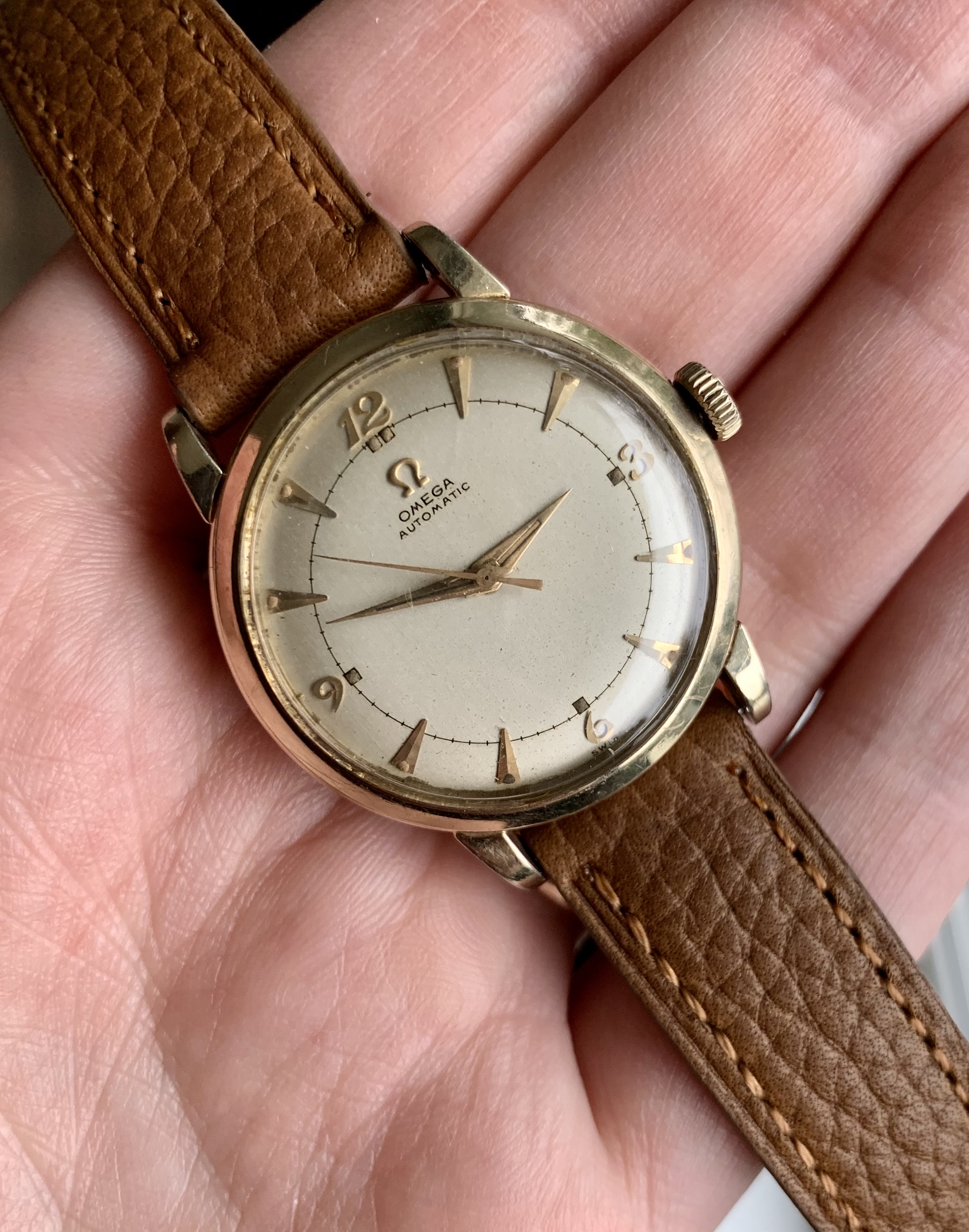 The watch features a somewhat unusual 14k gold filled case, which measures ~34mm not including the crown.