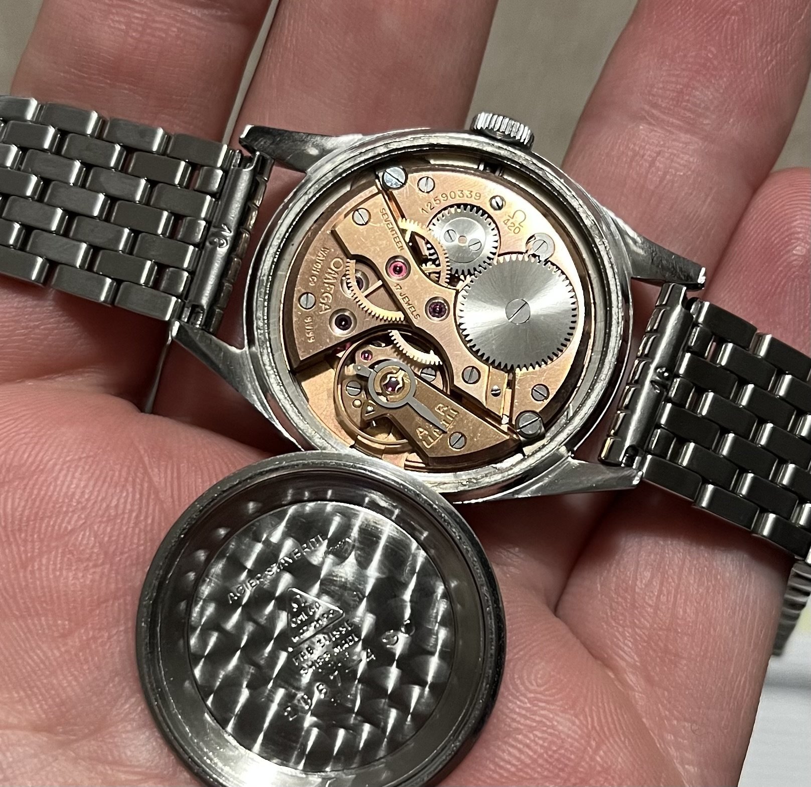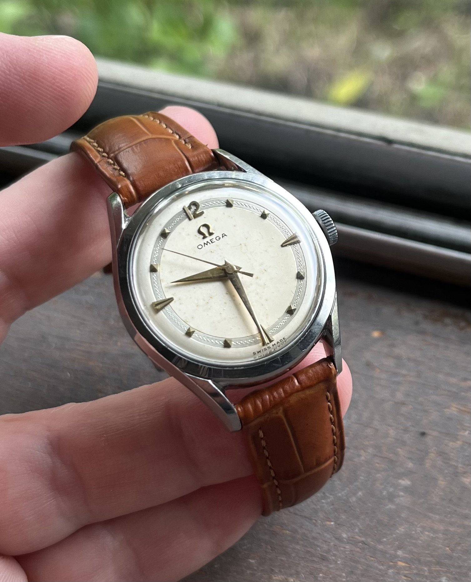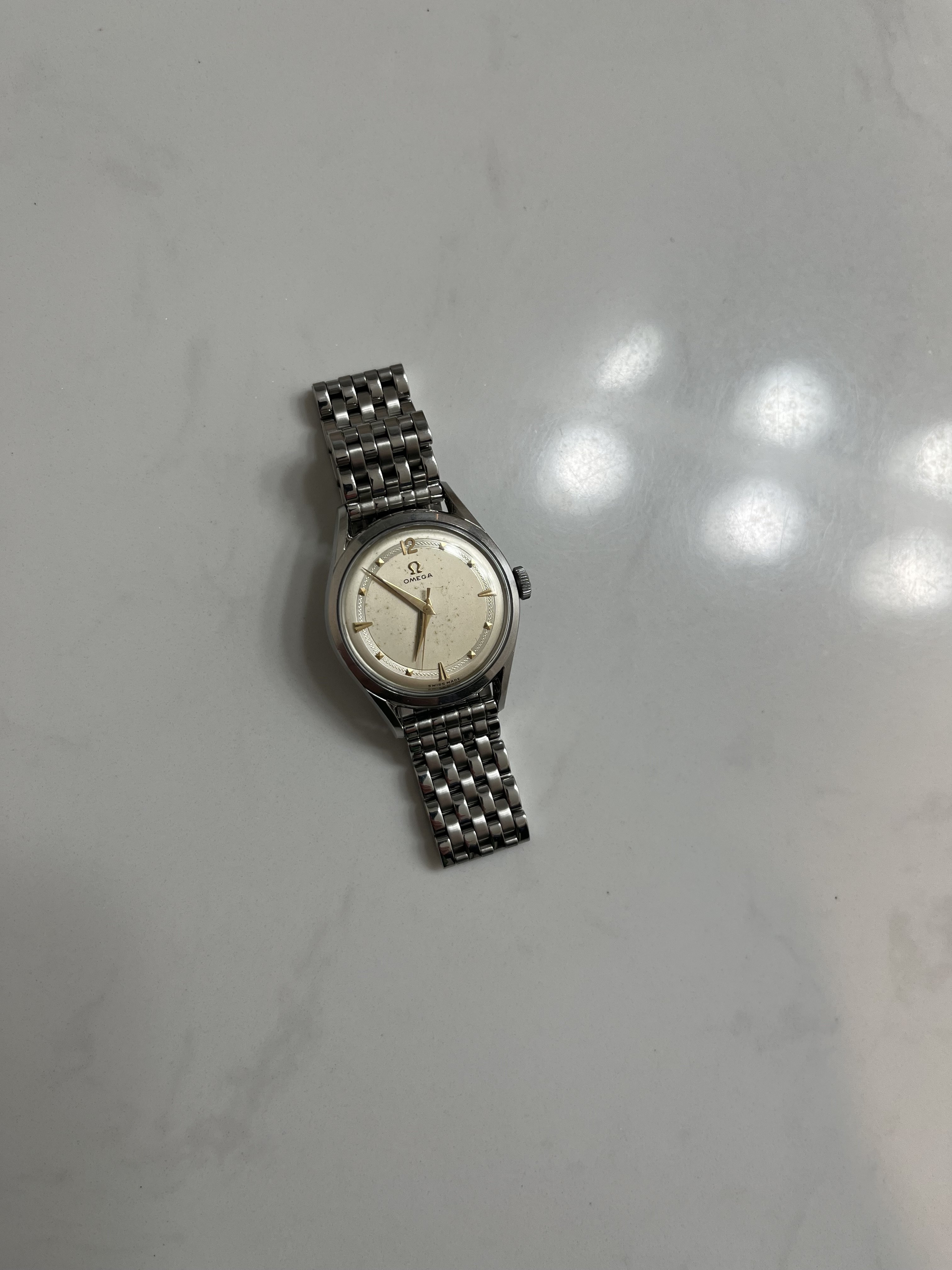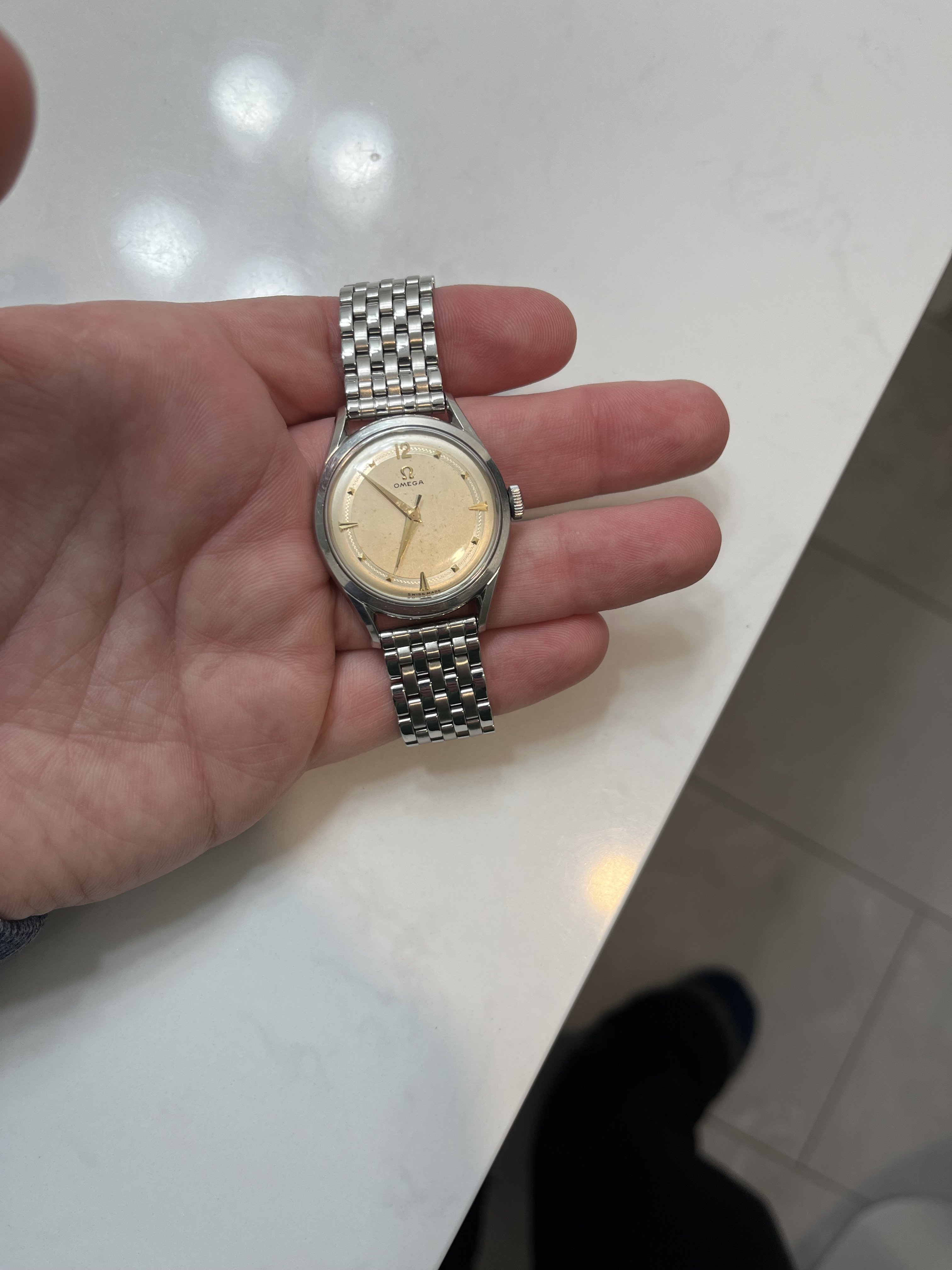 This is a really beautiful little 32.5mm mid-century Omega dress watch. Unpolished condition, manual wind cal. 420 is running perfectly. It has been very recently fully serviced ( I can show this ). On a brand new Forstner bracelet. The pyramid markers are so neat, as well as the textured decorative strip around the minute track. I really don’t want to sell this because I love it, but I’ve recently inherited a gorgeous little custom 400cc Honda cafe racer from the 70’s in mint shape and need to build a nice little garage for it.