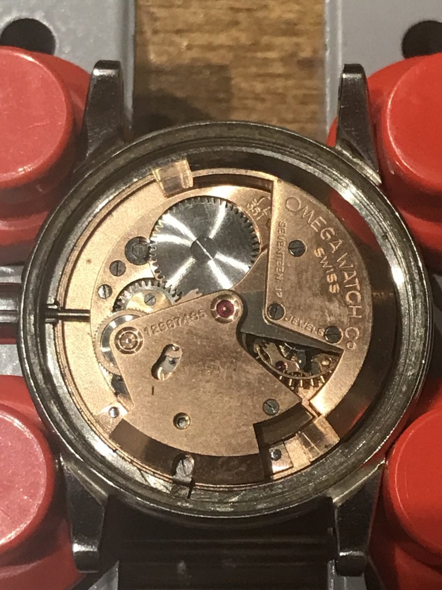 Dial: The original, non-refinished dial features desirable gold 3/6/9/12 breguet numerals. The dial has developed a fairly even patina however is slightly darker near the center, has some marks around the edge, and "Omega" and "Automatic" text is a bit faded, presumably from being cleaned. Also, the lume plots appear to have been filled in (it's possible it's just darkened lume but seems too consistently dark and too intact to me - I haven't checked with a blacklight). "Swiss" text is present below the 6 marker as expected.