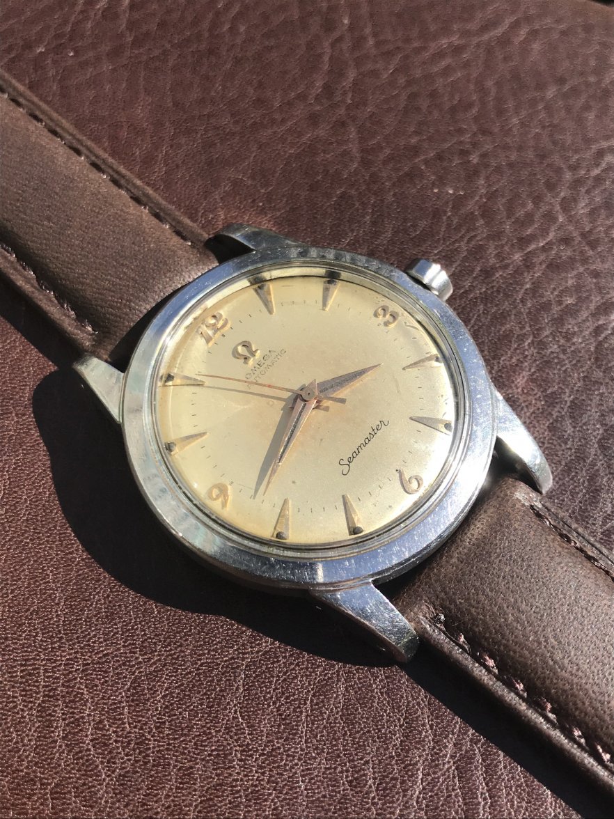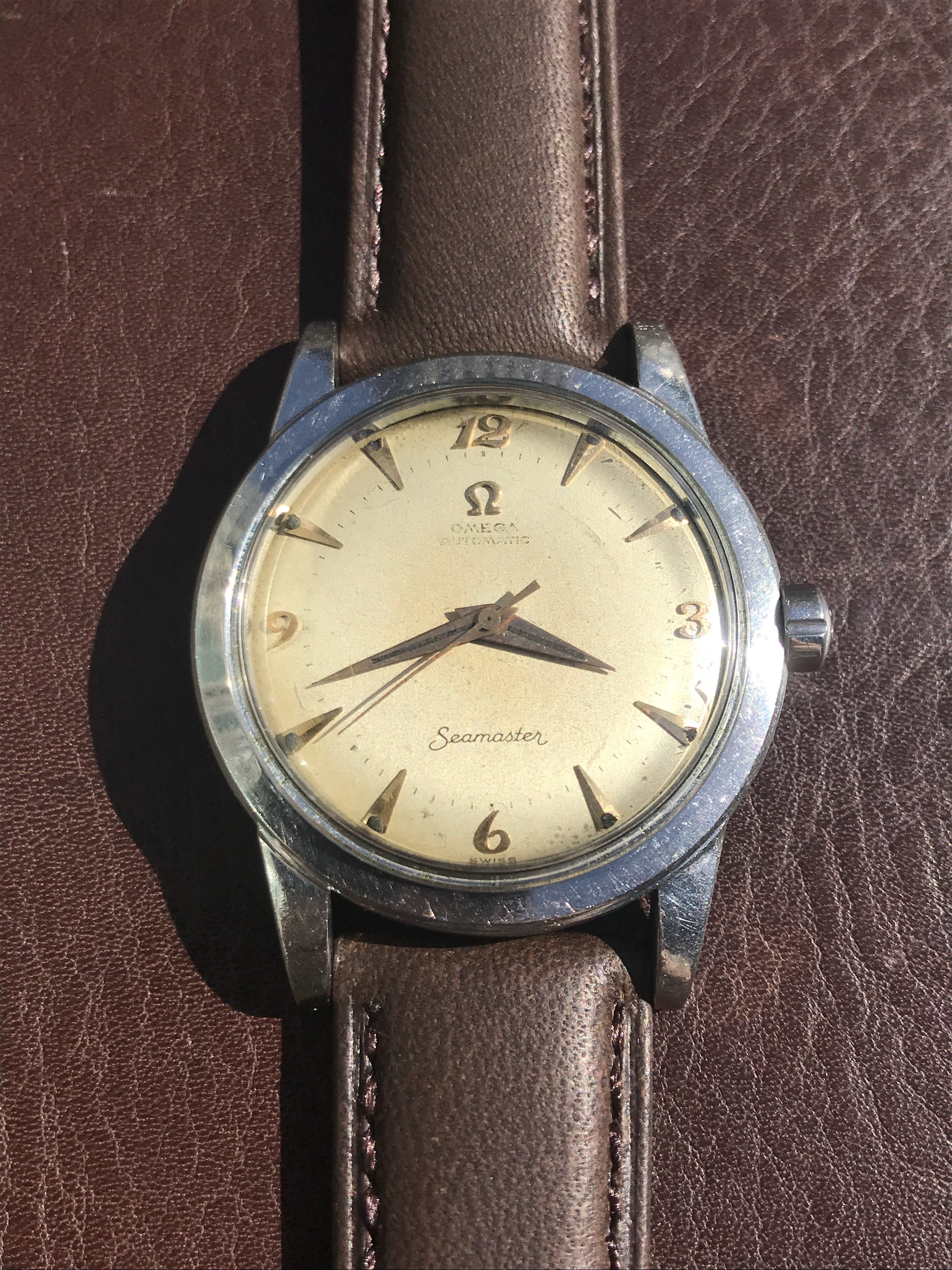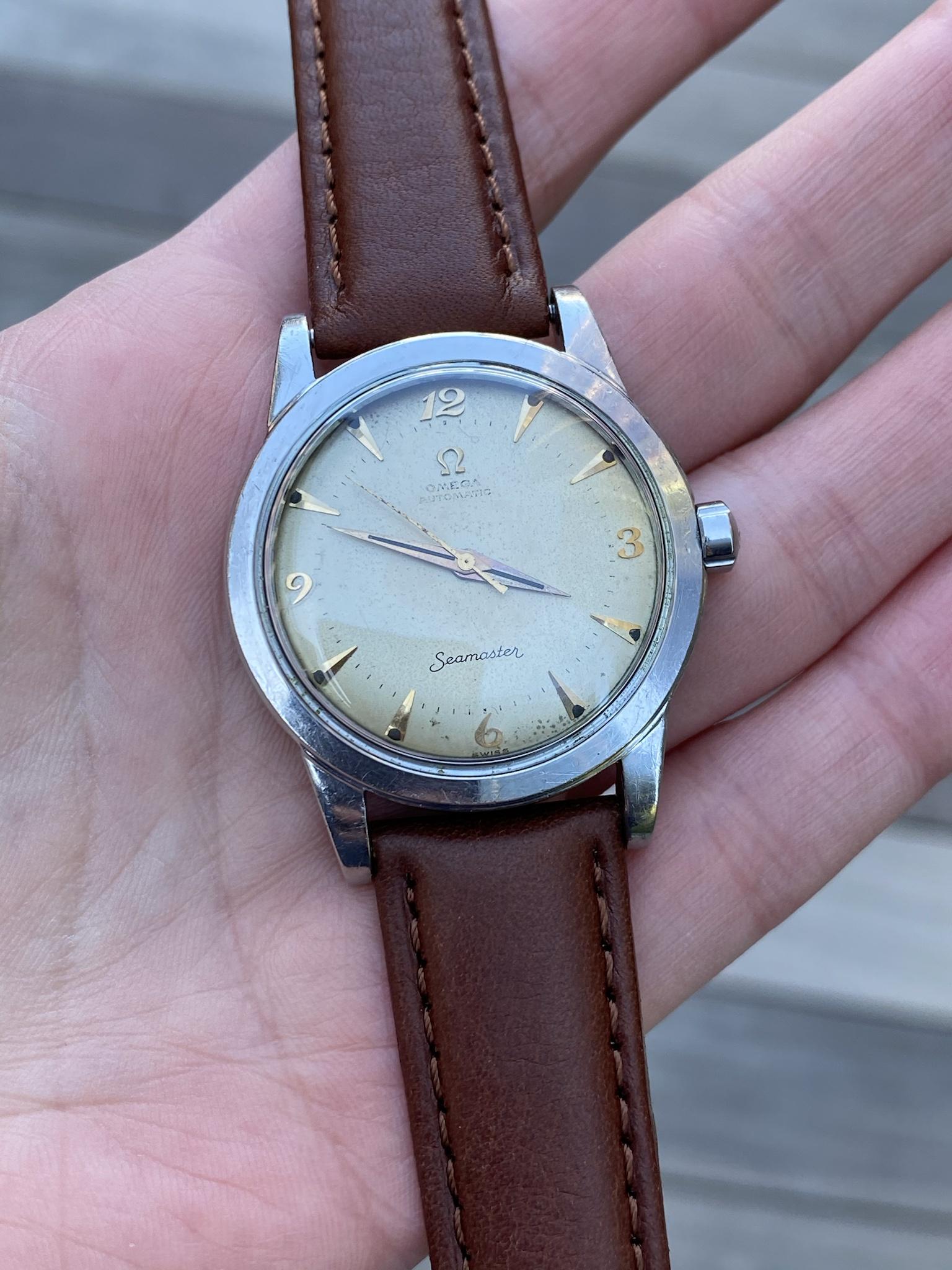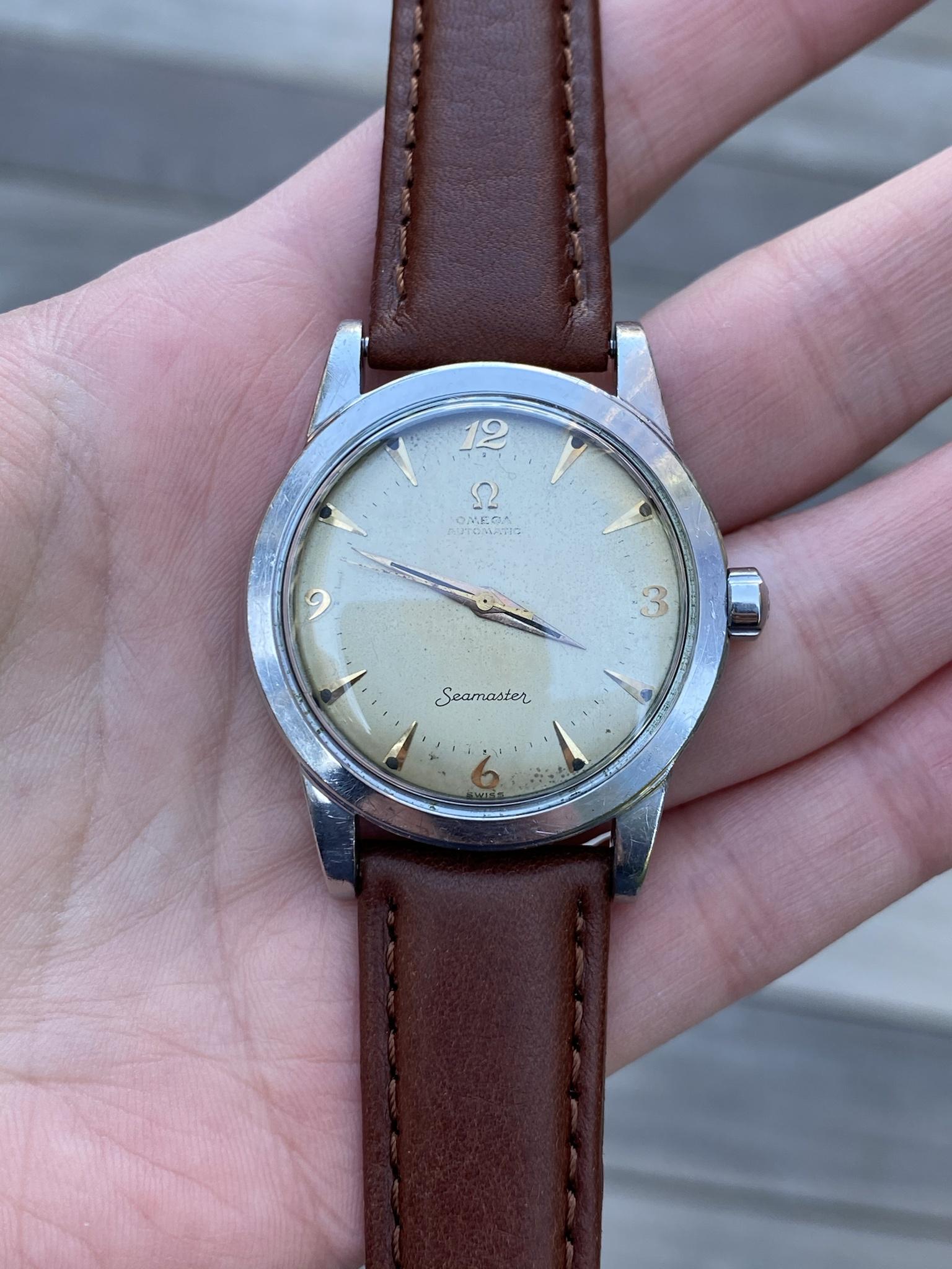 ·For sale is a 1951 2577 reference Omega Seamaster with a 351 bumper movement, a patinated dial, and gold breguet numerals. The dial has a fairly even patina but appears to have been cleaned at some point. The case is in nice, seemingly unpolished, condition. The movement was running a couple minutes fast last I timed it, and service history is unknown so a service is recommended prior to regular use. Price is $400.