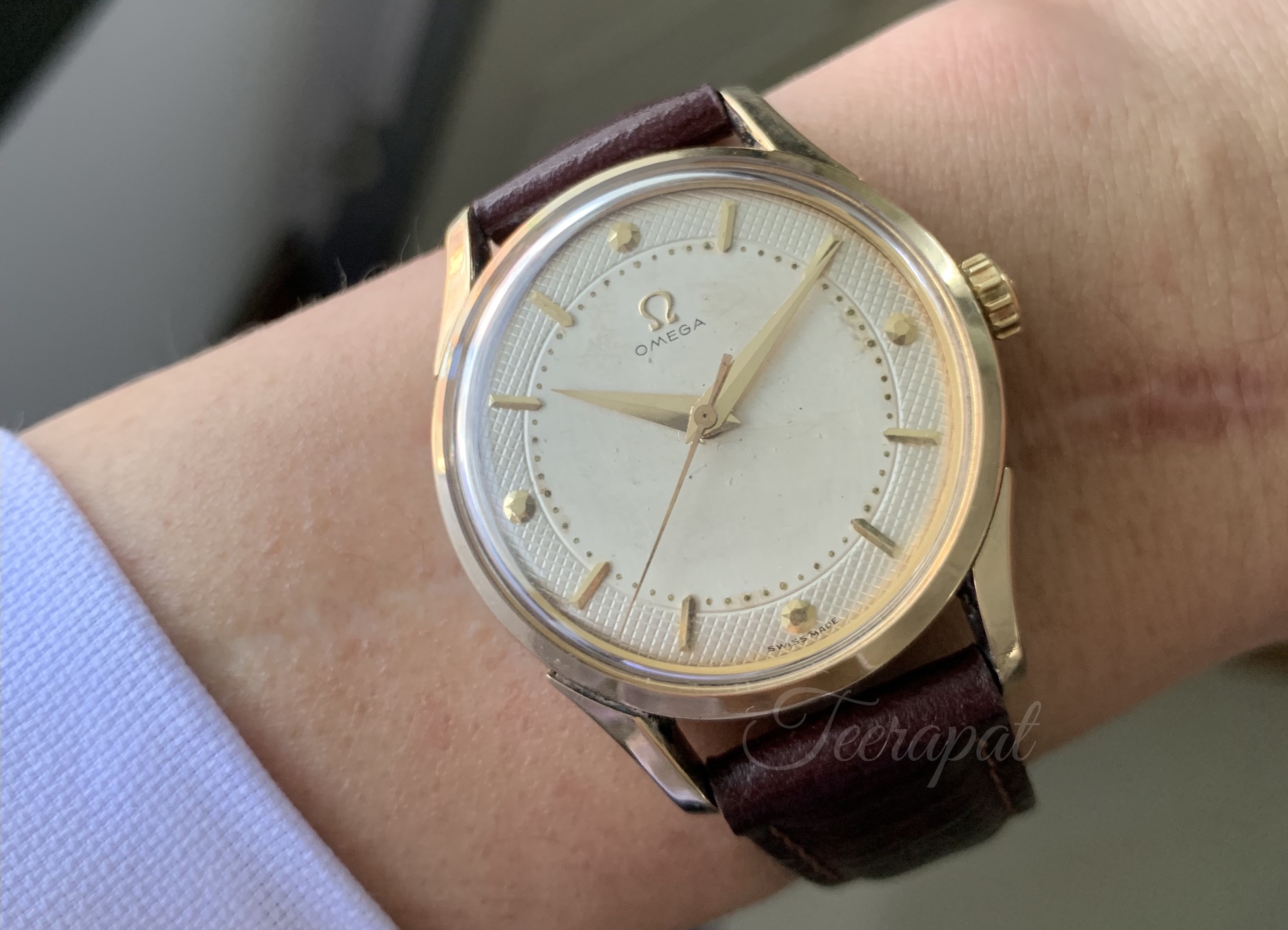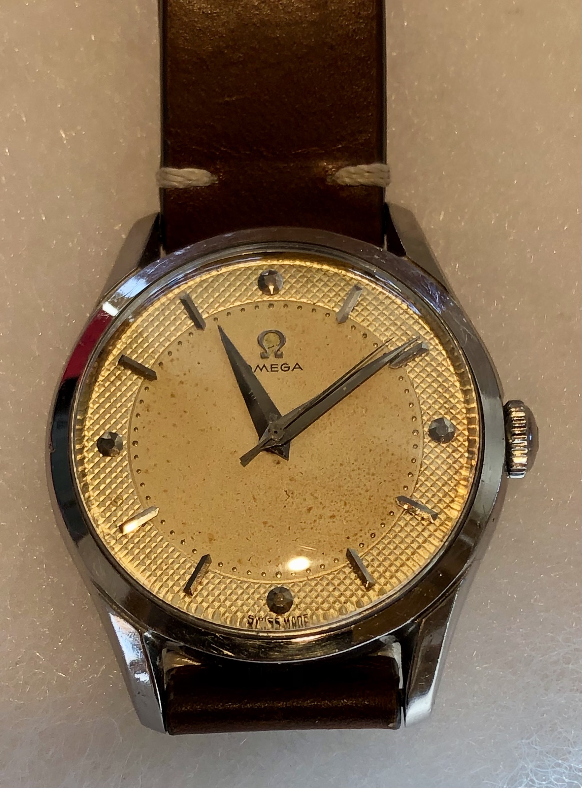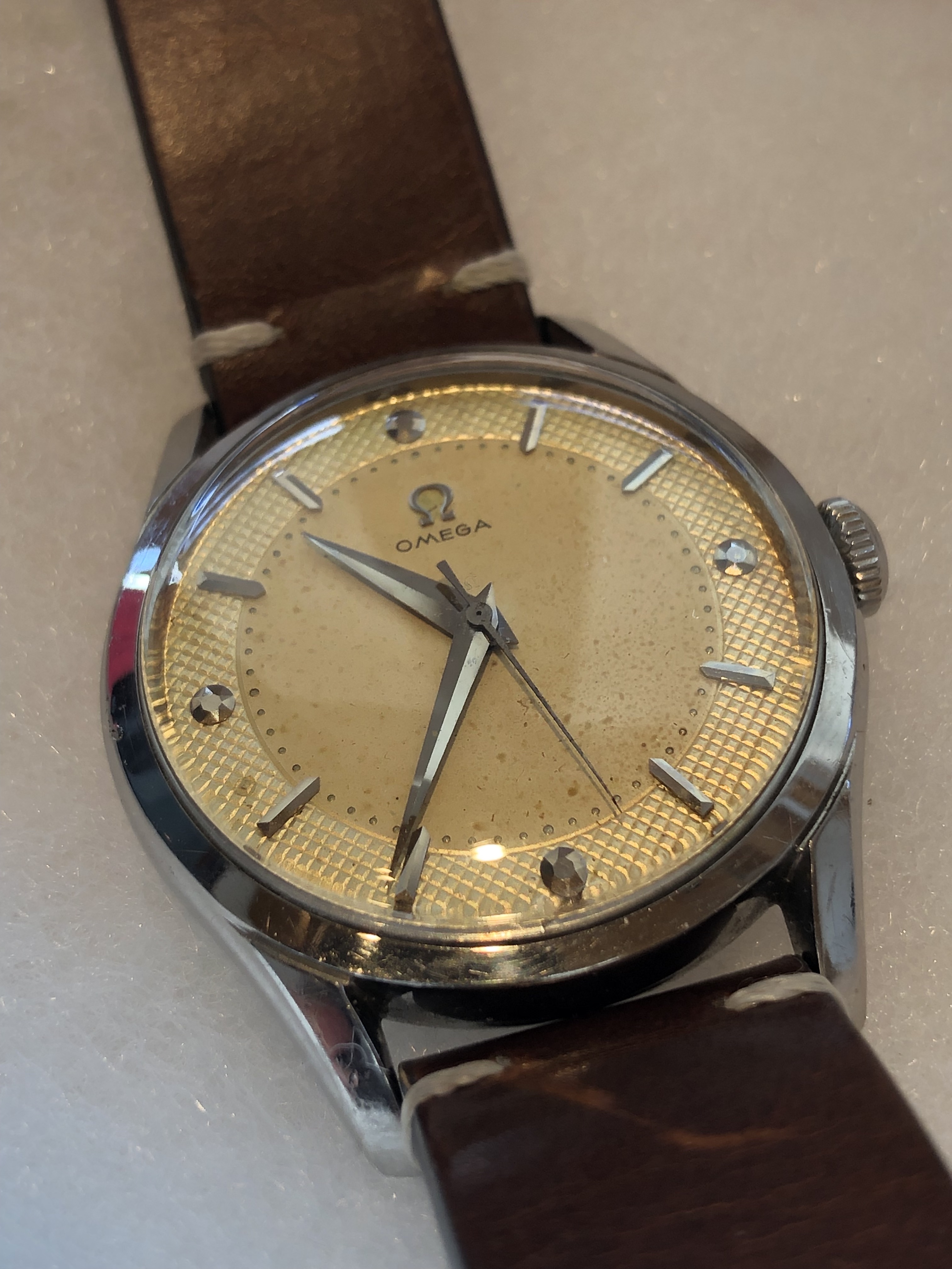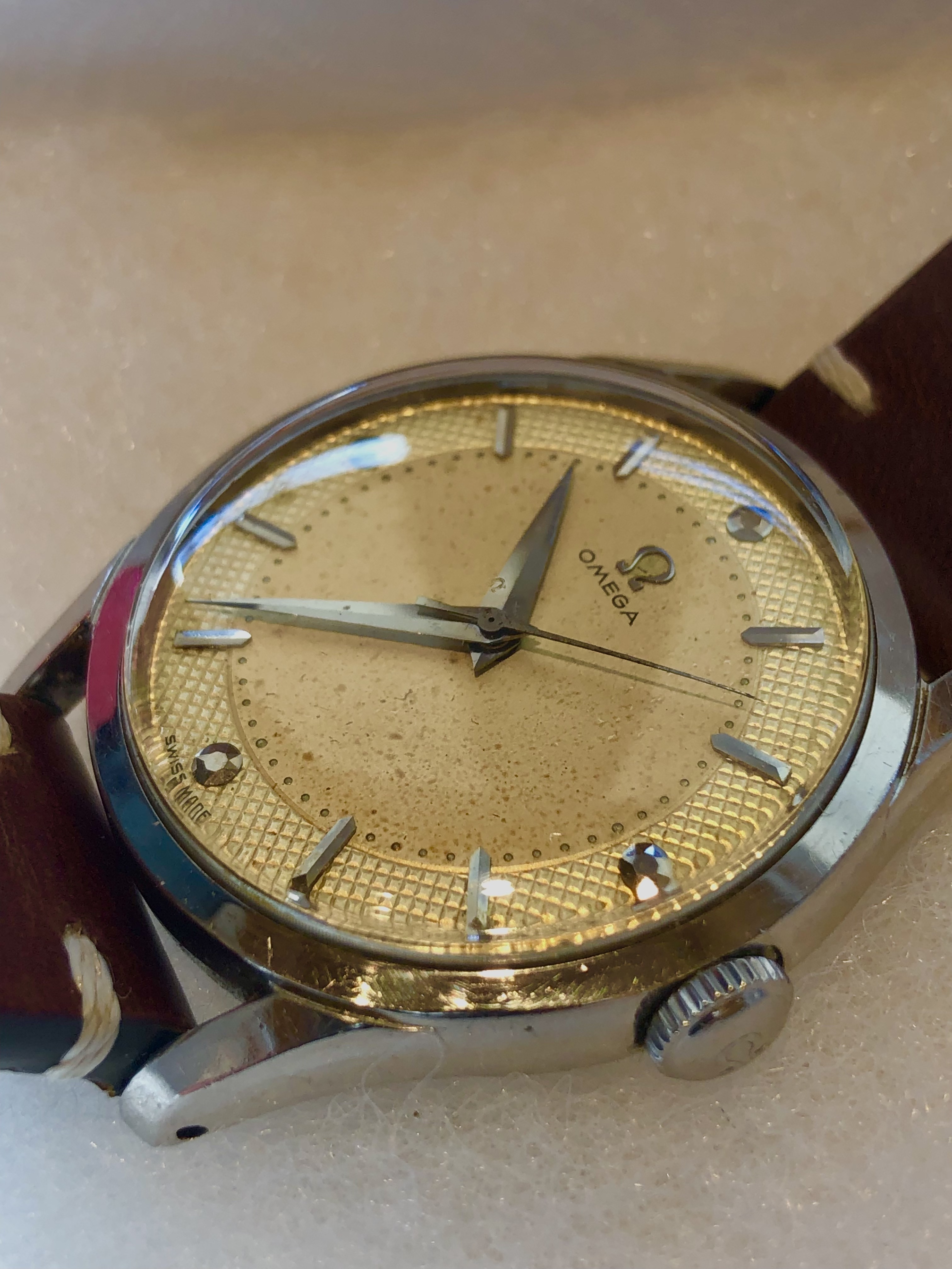 As a newbie to this I'm hoping to get feedback on new acquisitions as well as prospective purchases. This first one here is already purchased, I fell for the beautiful dial, wonderful patina and the guilloche drew me in. The watch ref# 2640-5SC is a nice 36mm case size, tiny logo on the crystal, also crown. The hands seem correctly matched to me. I noticed there was no script (Seamaster?) at 6 o'clock. I'm no expert on Omega watches though - so all legitimate?