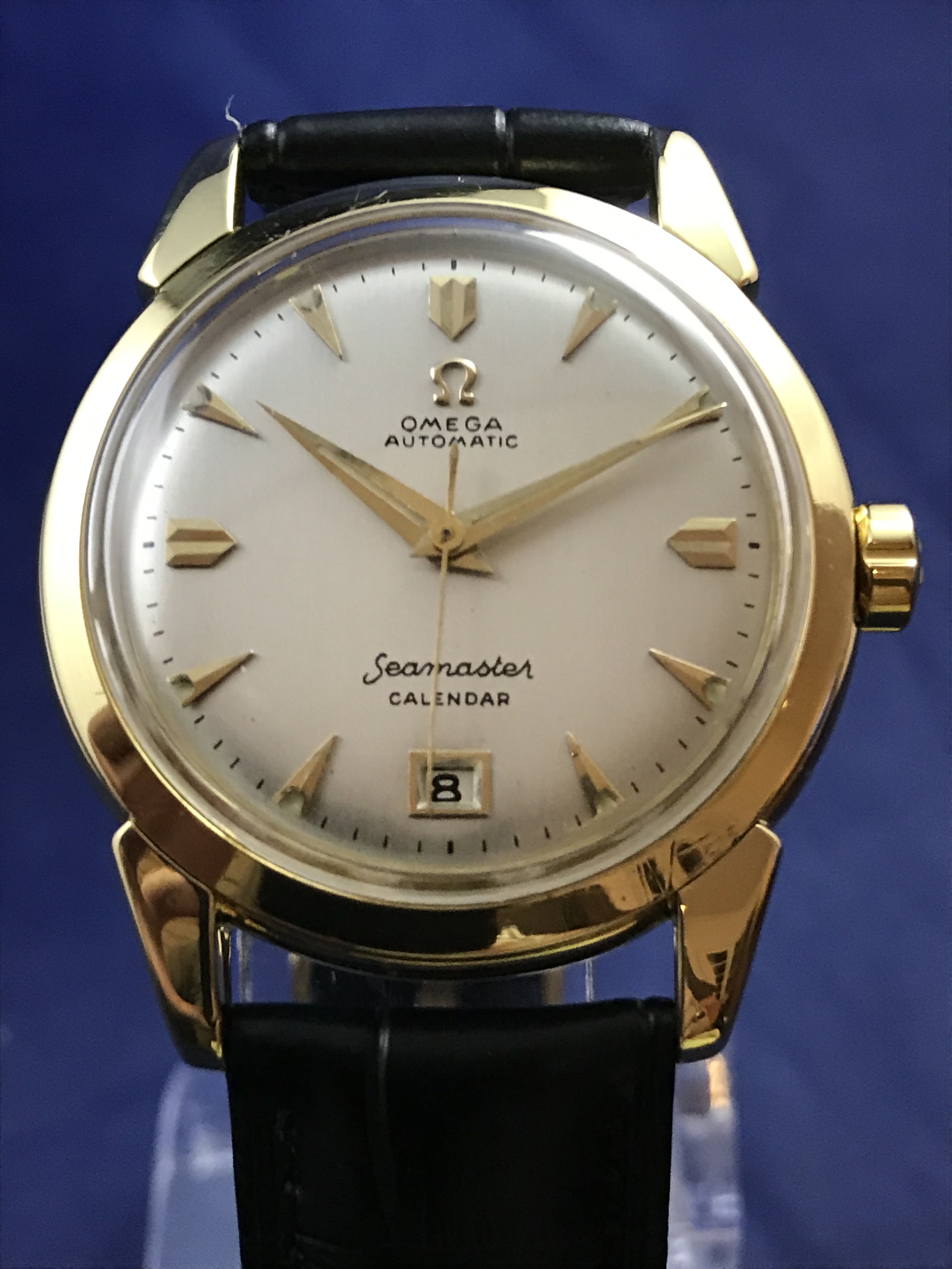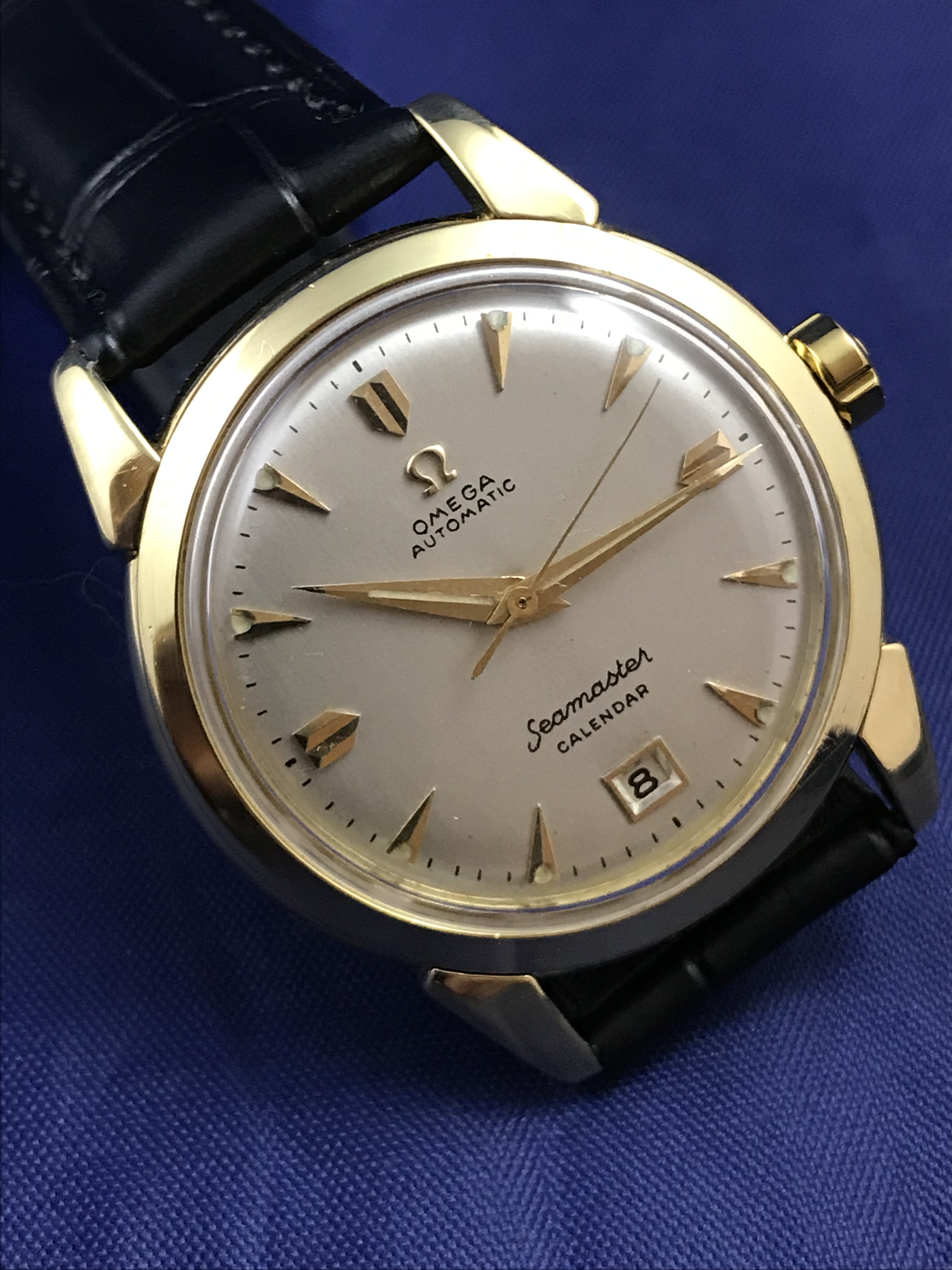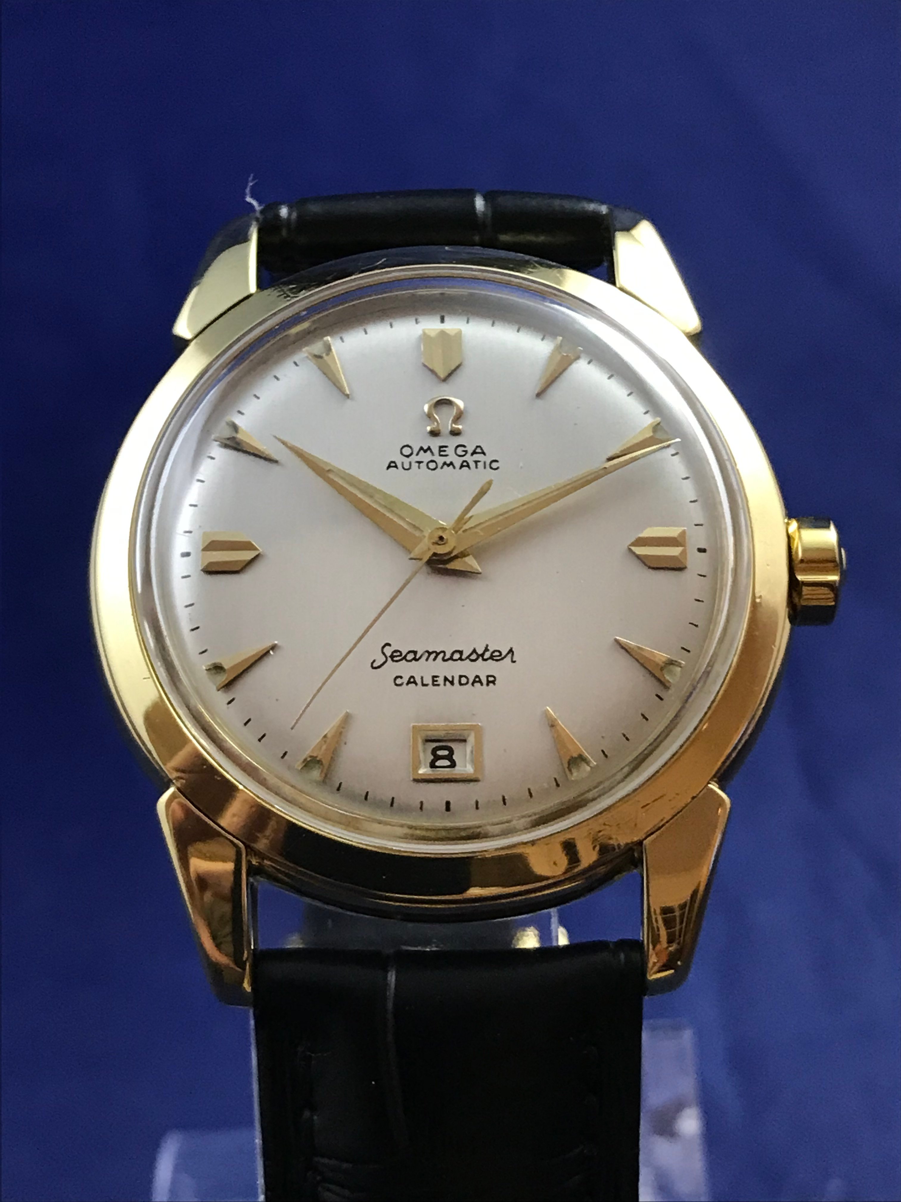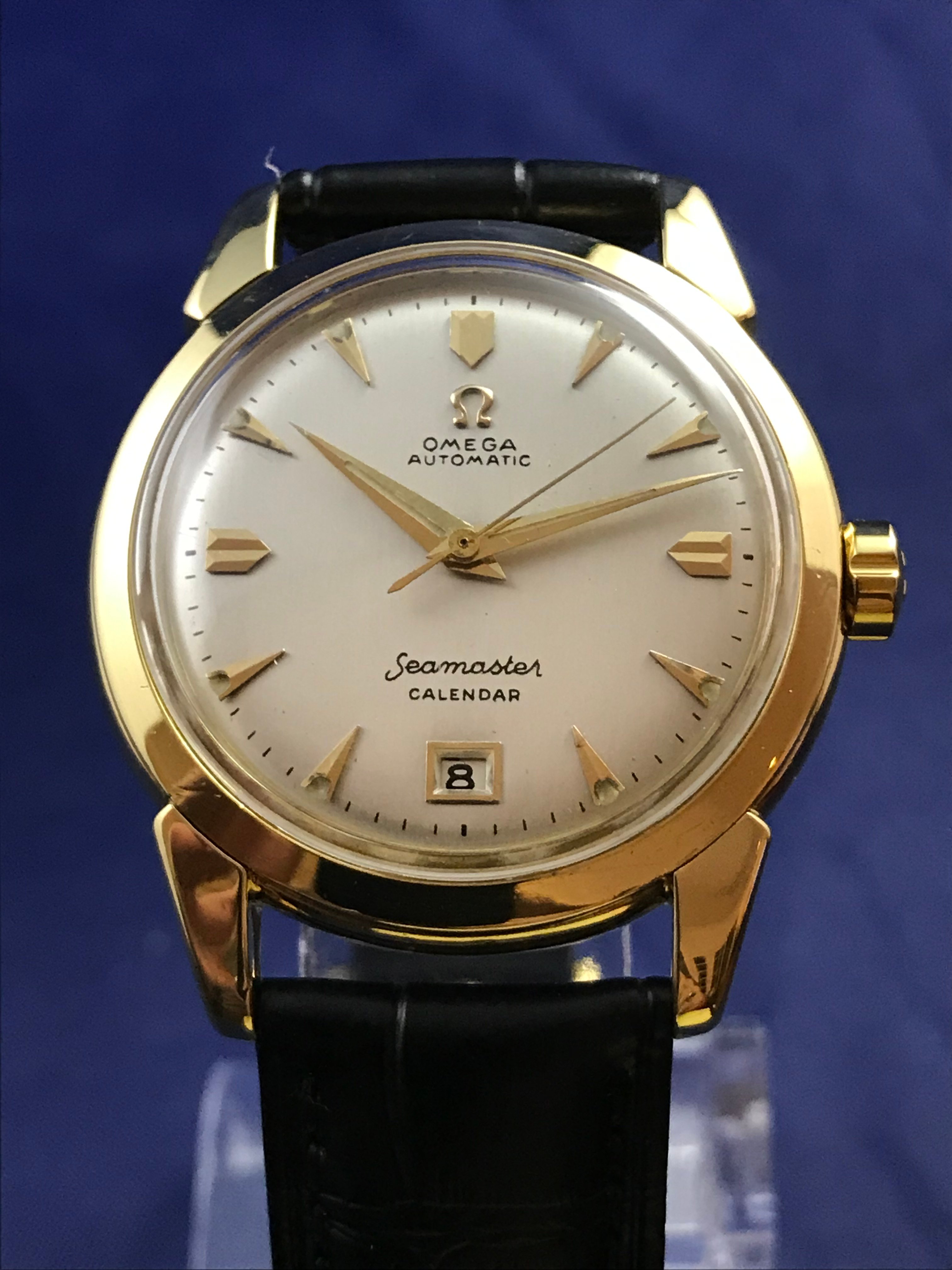 ·1952 Omega Seamaster Calendar Automatic 18k Yellow Gold watch for sale. This superb timepiece has just been serviced and runs perfectly on time.