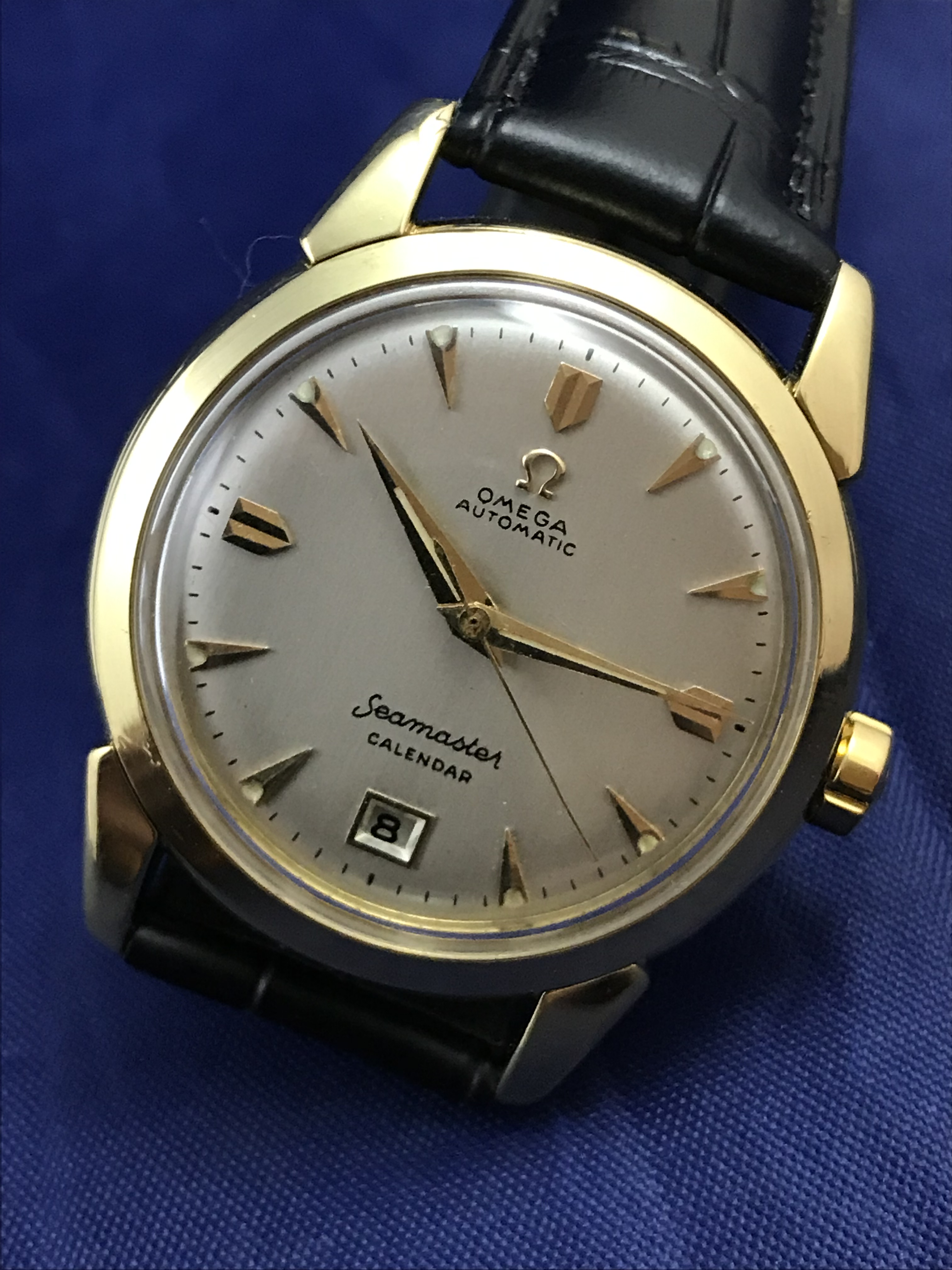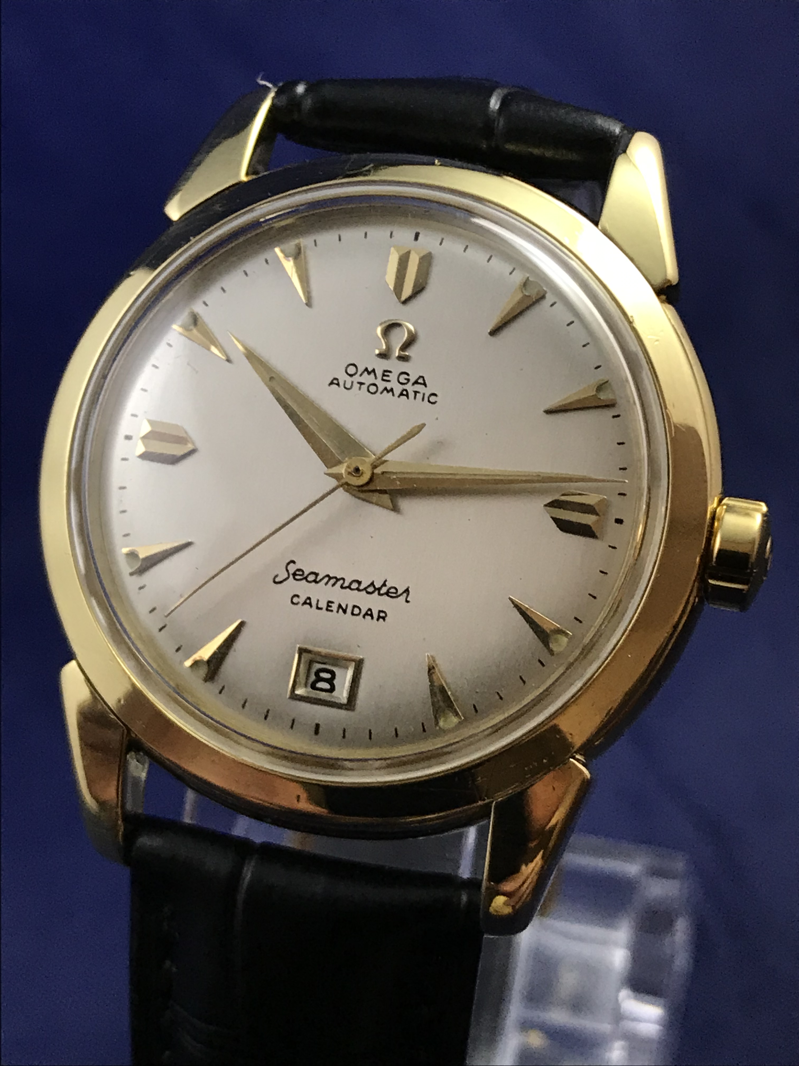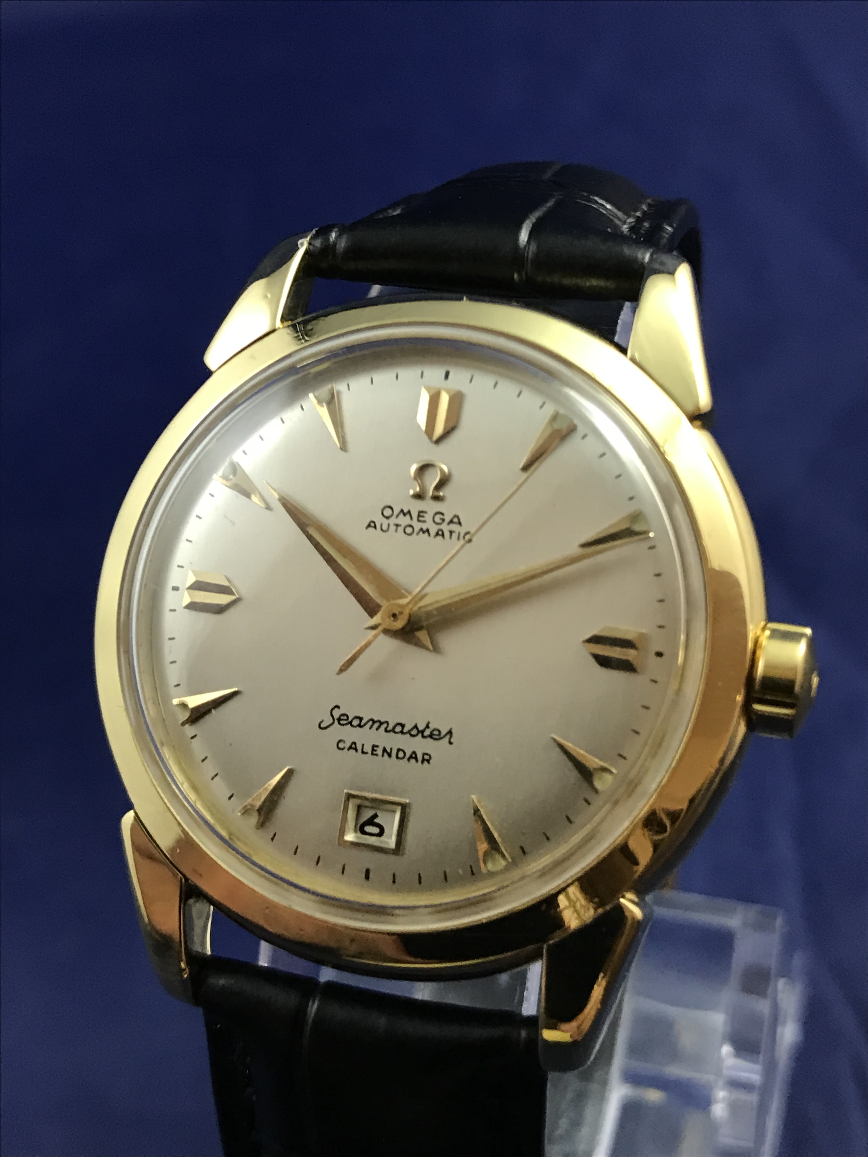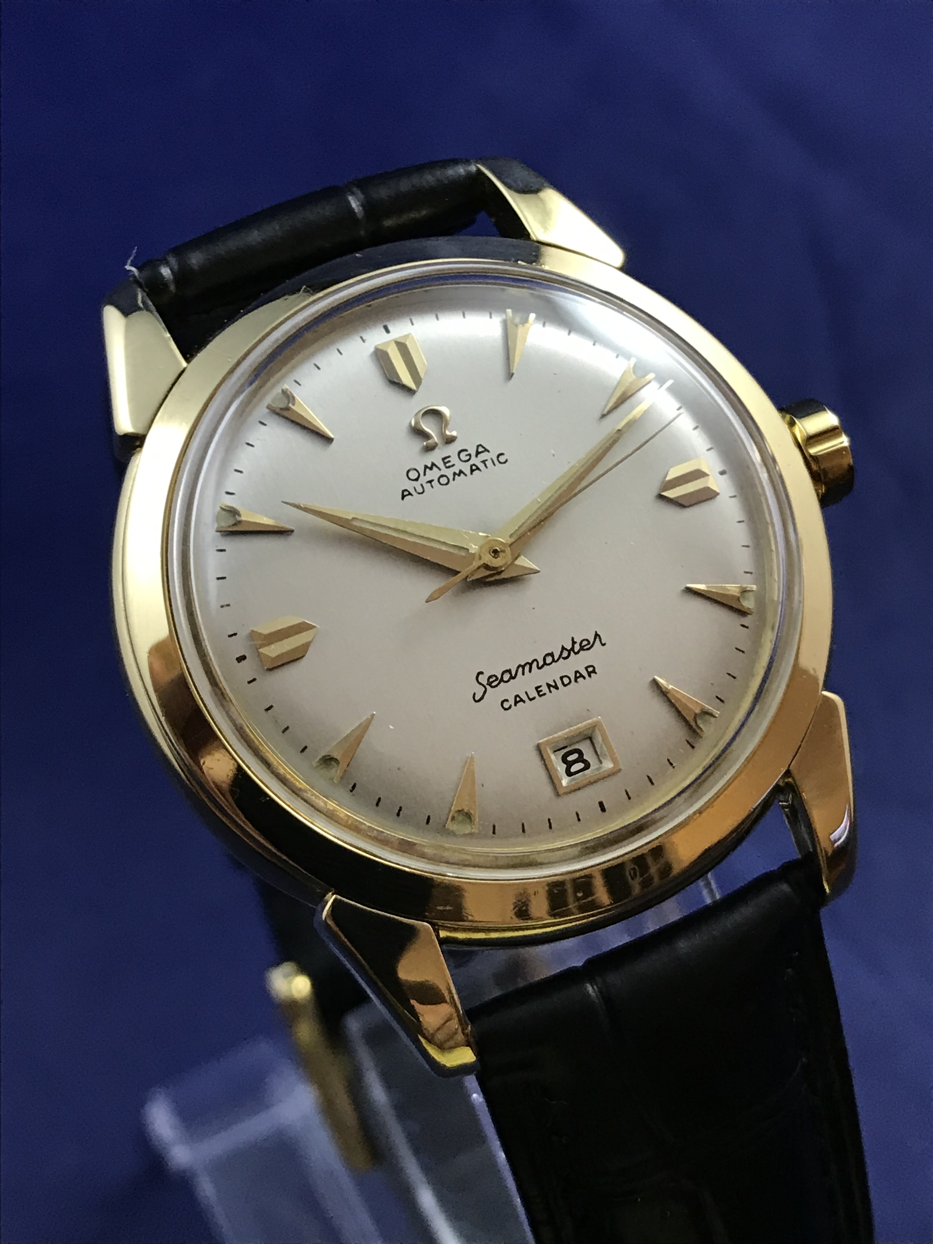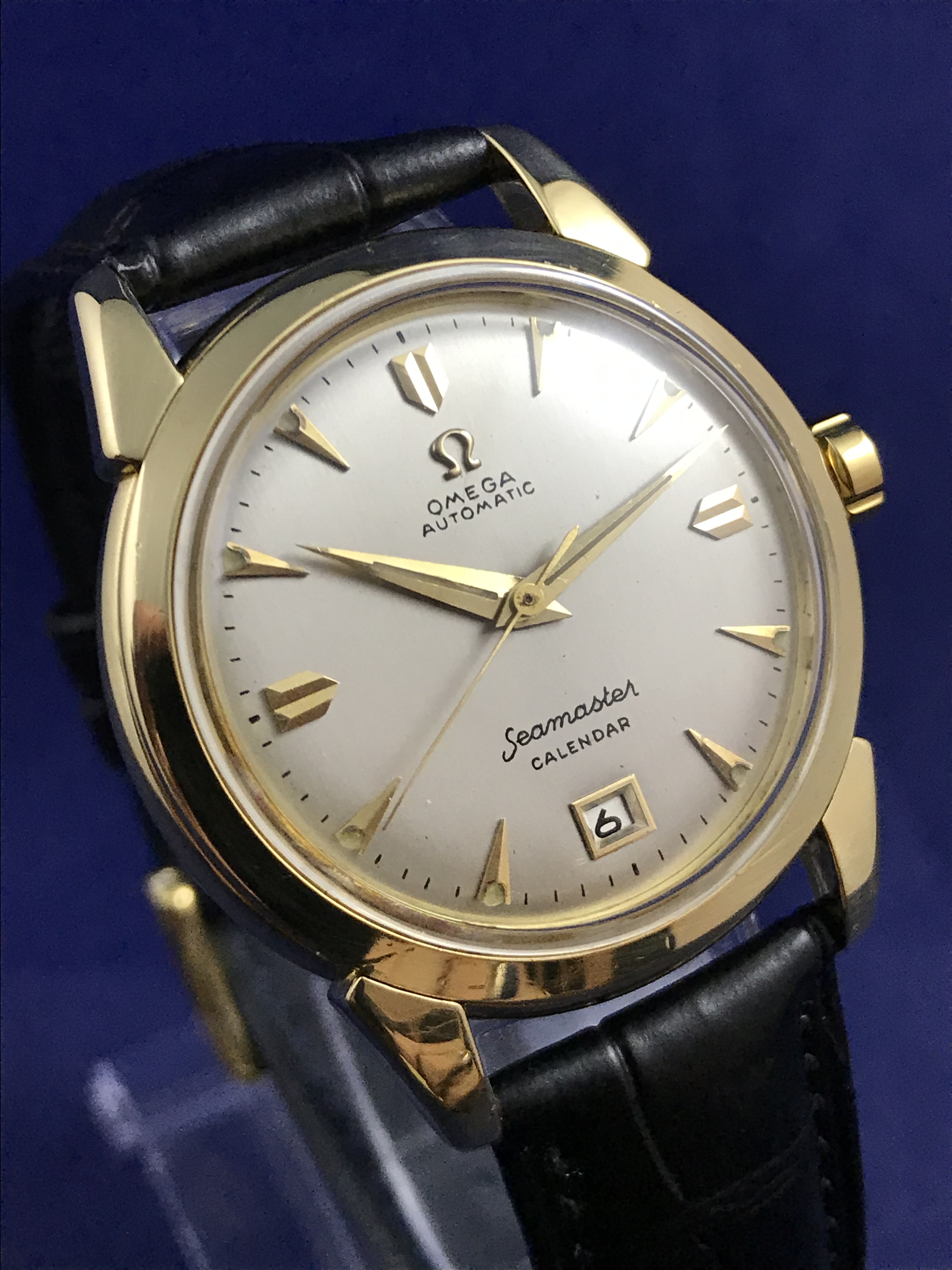 ·1952 Omega Seamaster Calendar Automatic 18k Yellow Gold watch for sale. This superb timepiece has just been serviced and runs perfectly on time.