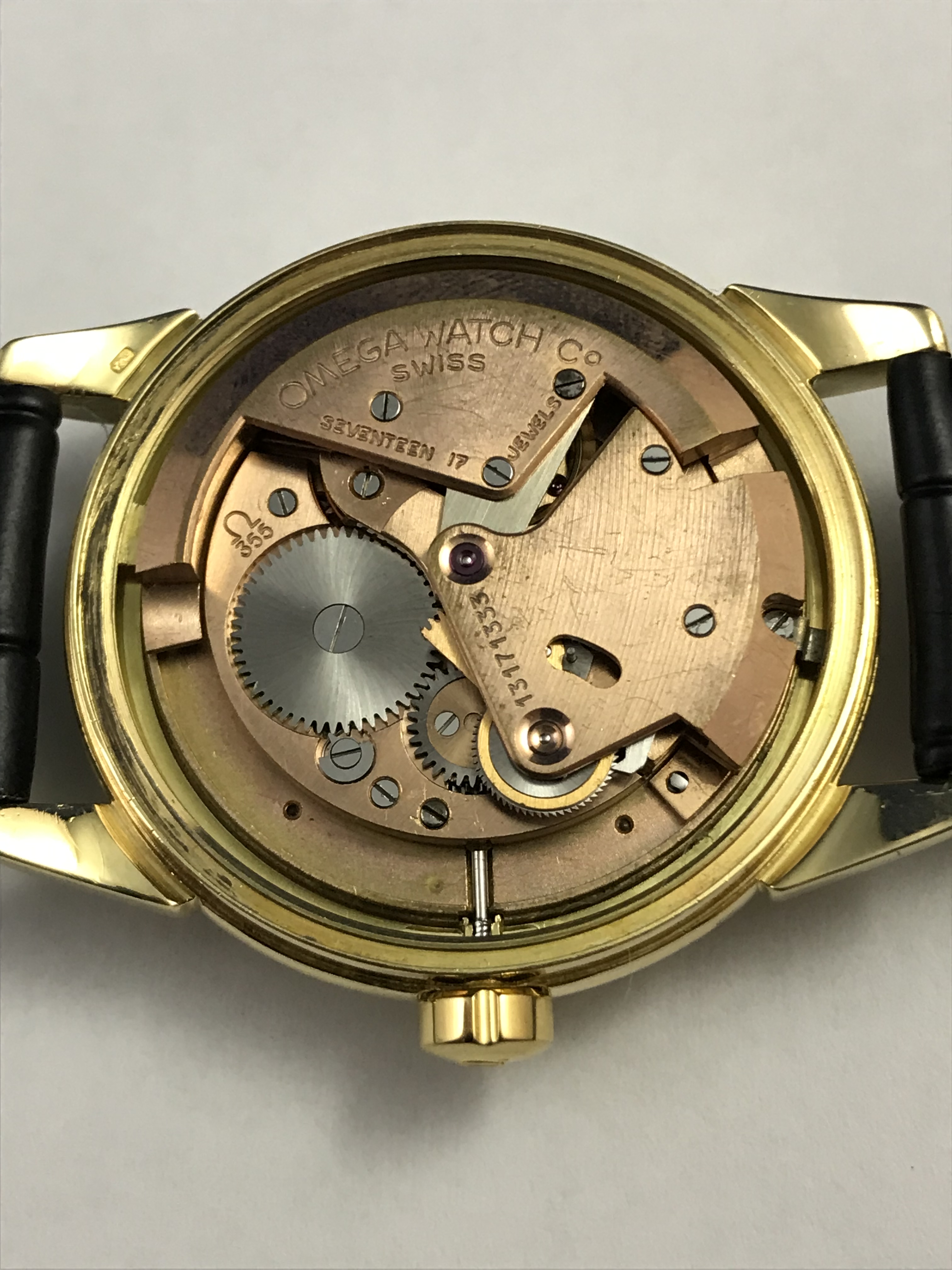 Movement: Omega bumper automatic (self-winding) movement with cal. 355 - 17 jewels movement (http://www.ranfft.de/cgi-bin/bidfun-db.cgi?10&1archimedeshop&be130&2uswk&Omega_355);