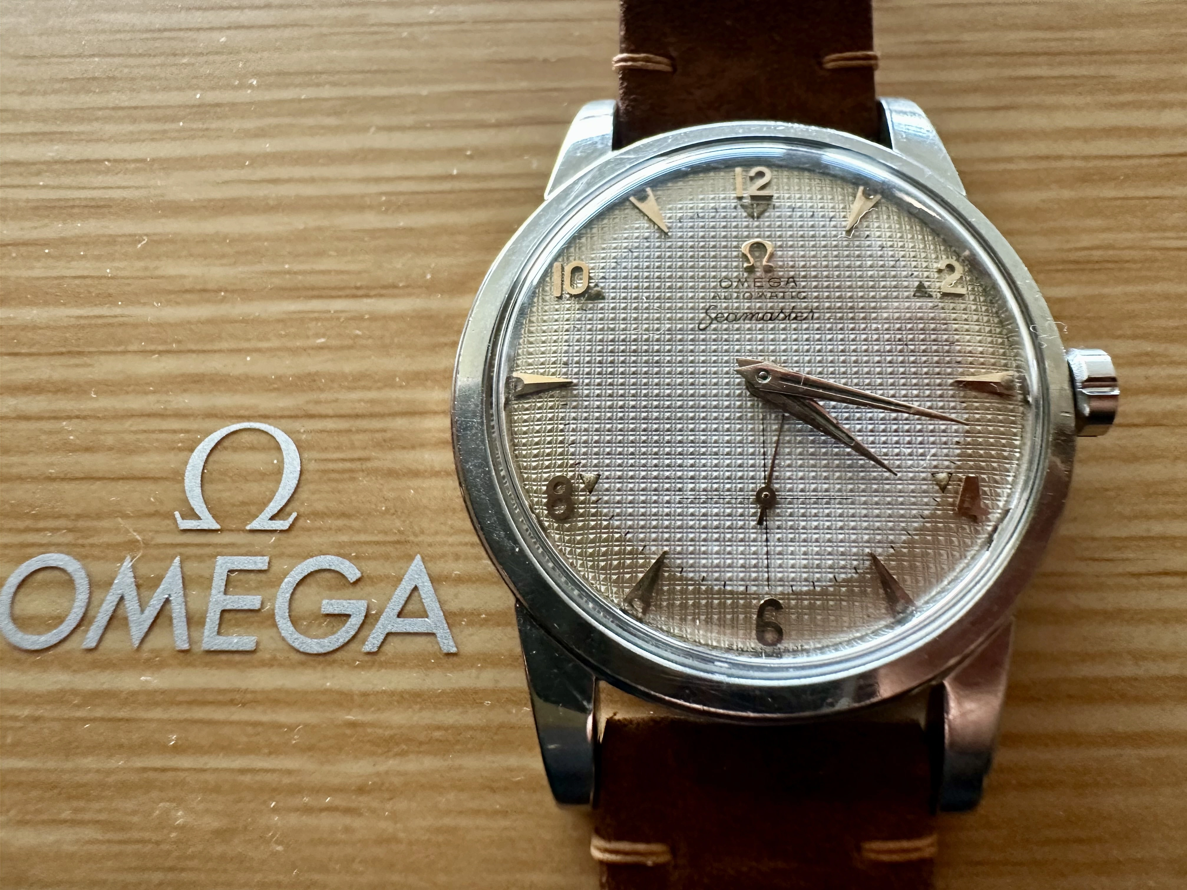 ·Good day all. Up for sale is a very special watch. If you want something unique, very collectible, and also very seldom available - then you'll want to look at this particular Seamaster 2657 because it is very beautiful and very difficult to find. This stainless Seamaster 2657 has a 36mm case, dauphine hands, rose gold furniture and a stunning two-tone hobnail dial. The case appears to be unpolished, has drilled lugs, and the correct Omega crown. The 1953 caliber 344 bumper was completely serviced from my watchmaker on 6/20/2024. All worn parts were replaced and the service paperwork will be included with the sale.