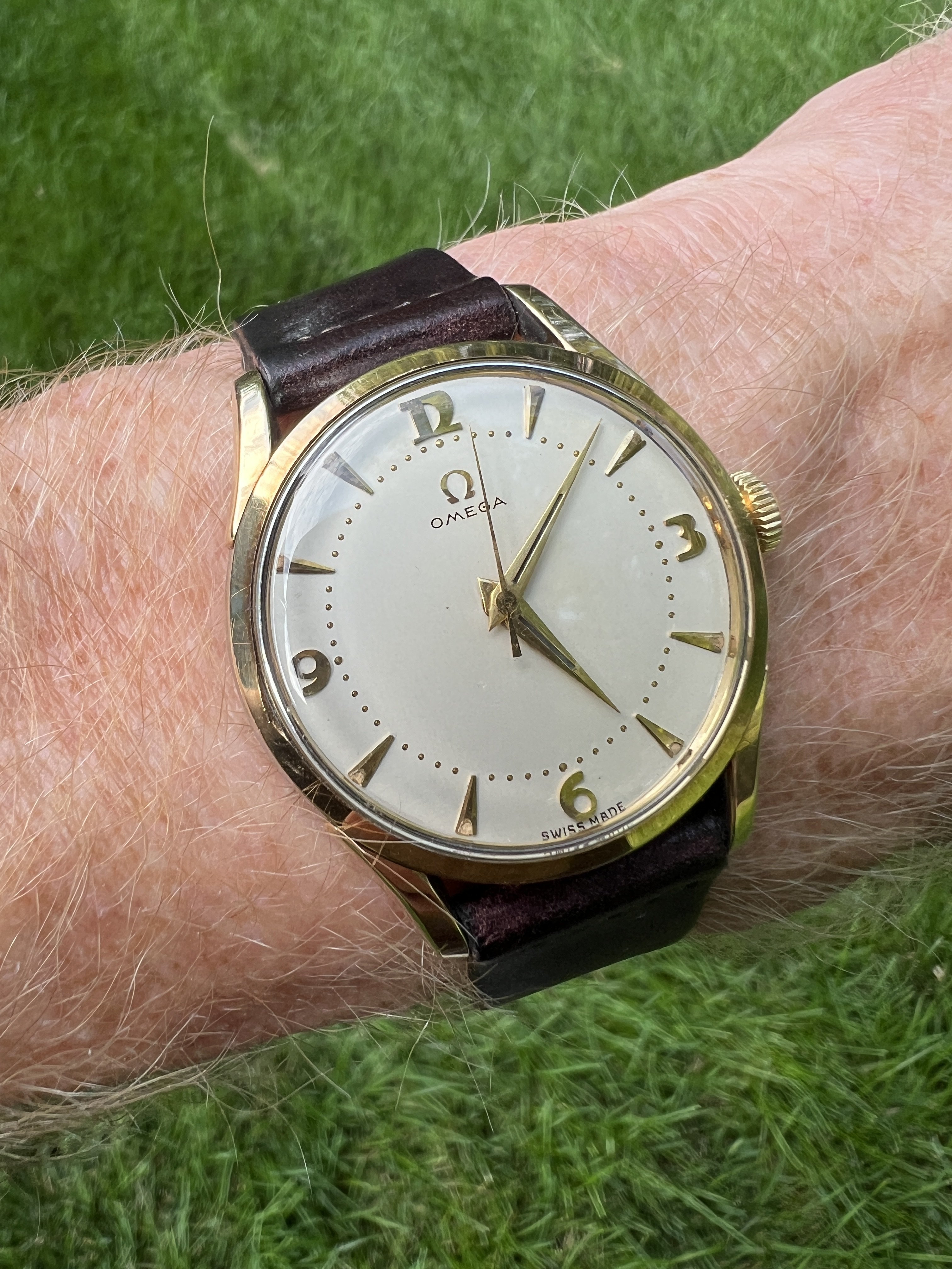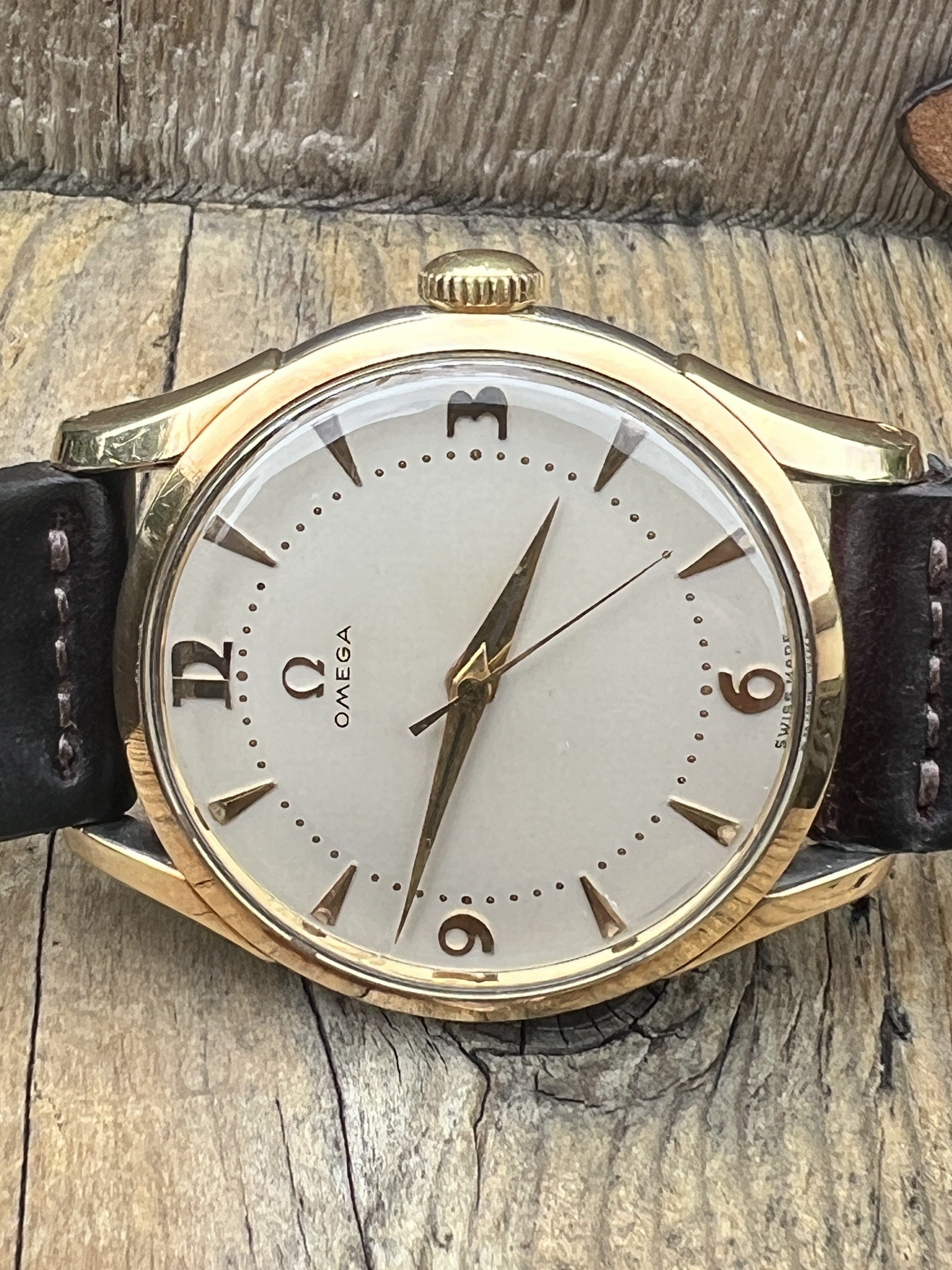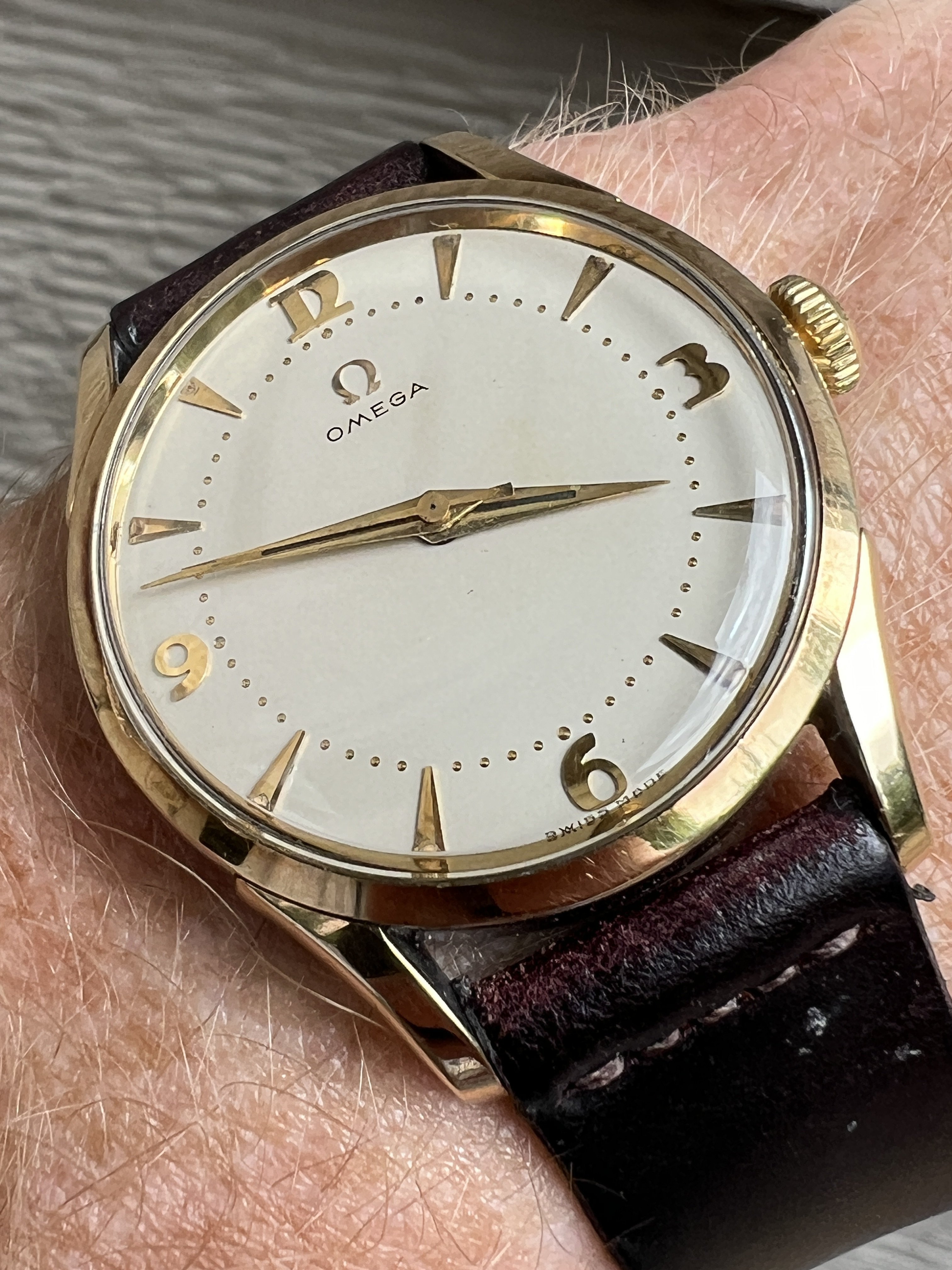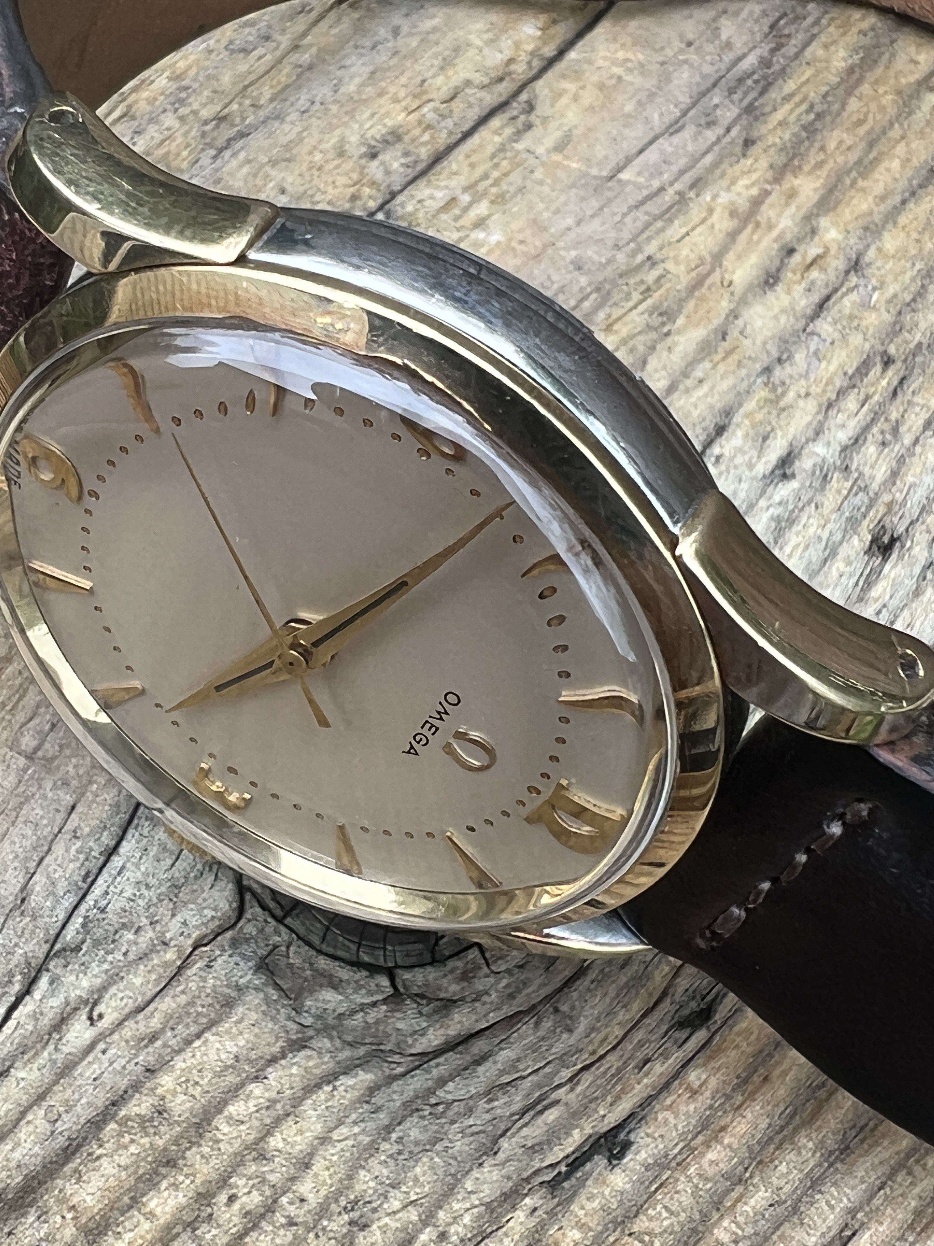 I'm looking for a new home for my last remaining vintage Omega. This one is a caliber 283 from 1953, case model 2640-6 SC. The case is unpolished gold-capped stainless steel (35mm) and the crown (unsigned), crystal, and dauphine hands are original to the watch. The art deco-type numerals are terrific and do not show up very often. The watch was professionally serviced in 2021 and keeps good time, typically +/- 10-15 seconds per day. This is a fabulous dress watch, but I've moved on to other things.