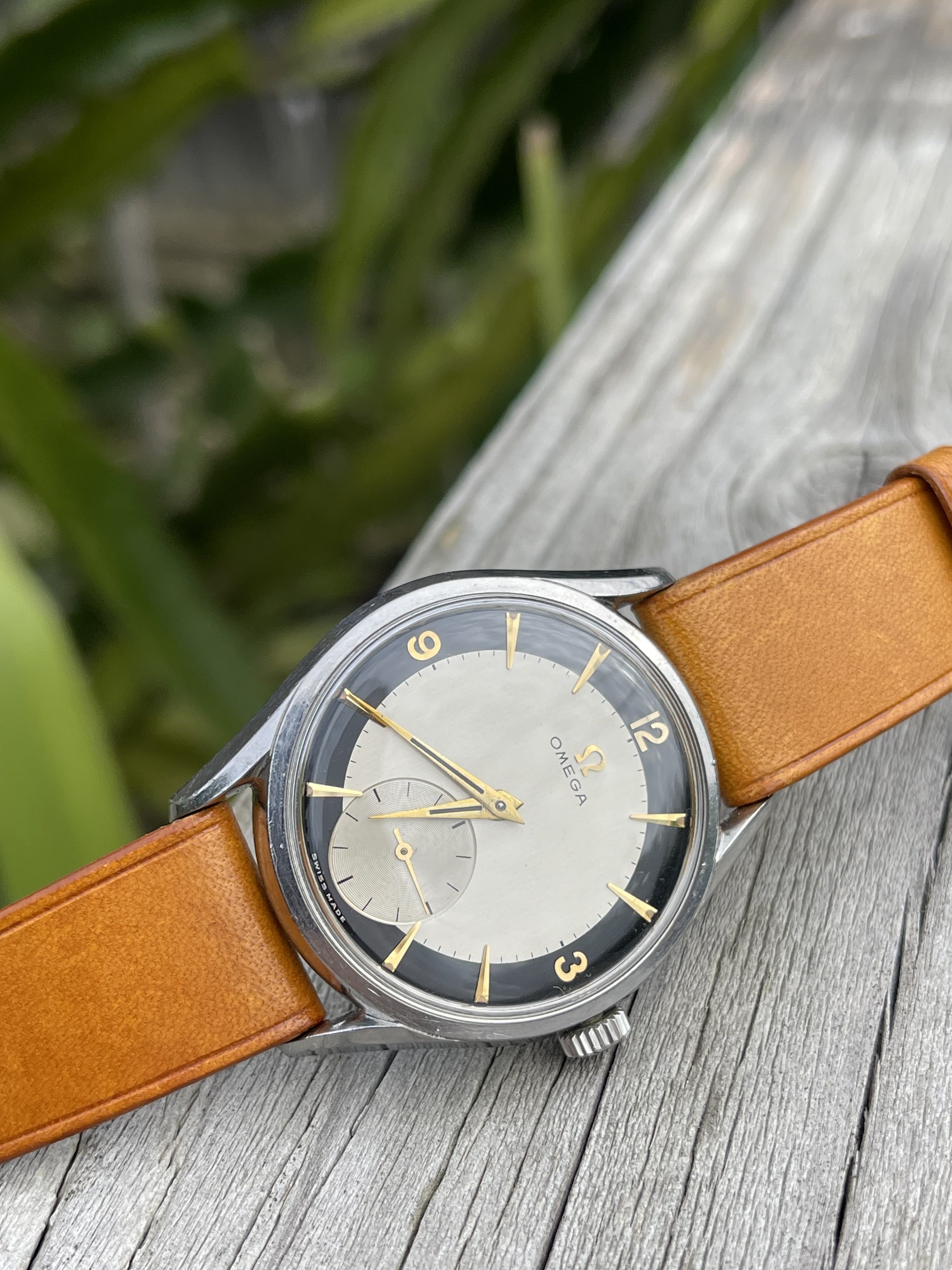The two tone dial is a BULLSEYE with GOLD accents. Super attractive. The most collectible of its model. Deep BLACK outer ring. Brushed white inner dial. The gold logo, gold hour markers and gold hands POP against this dial. In very good condition. Slight aging in the concentric subdial. Very little on the dial in certain lighting. See photos.