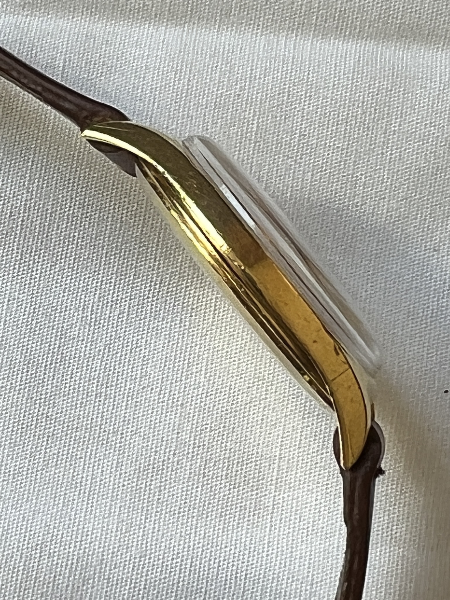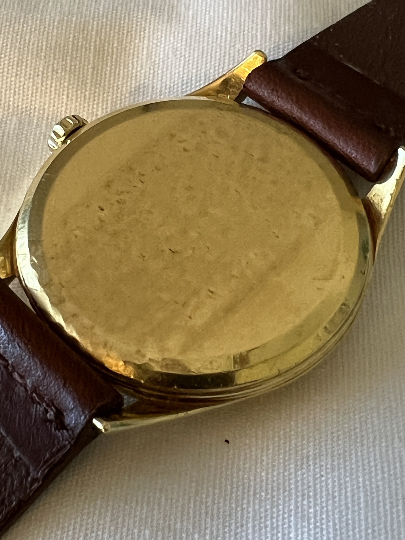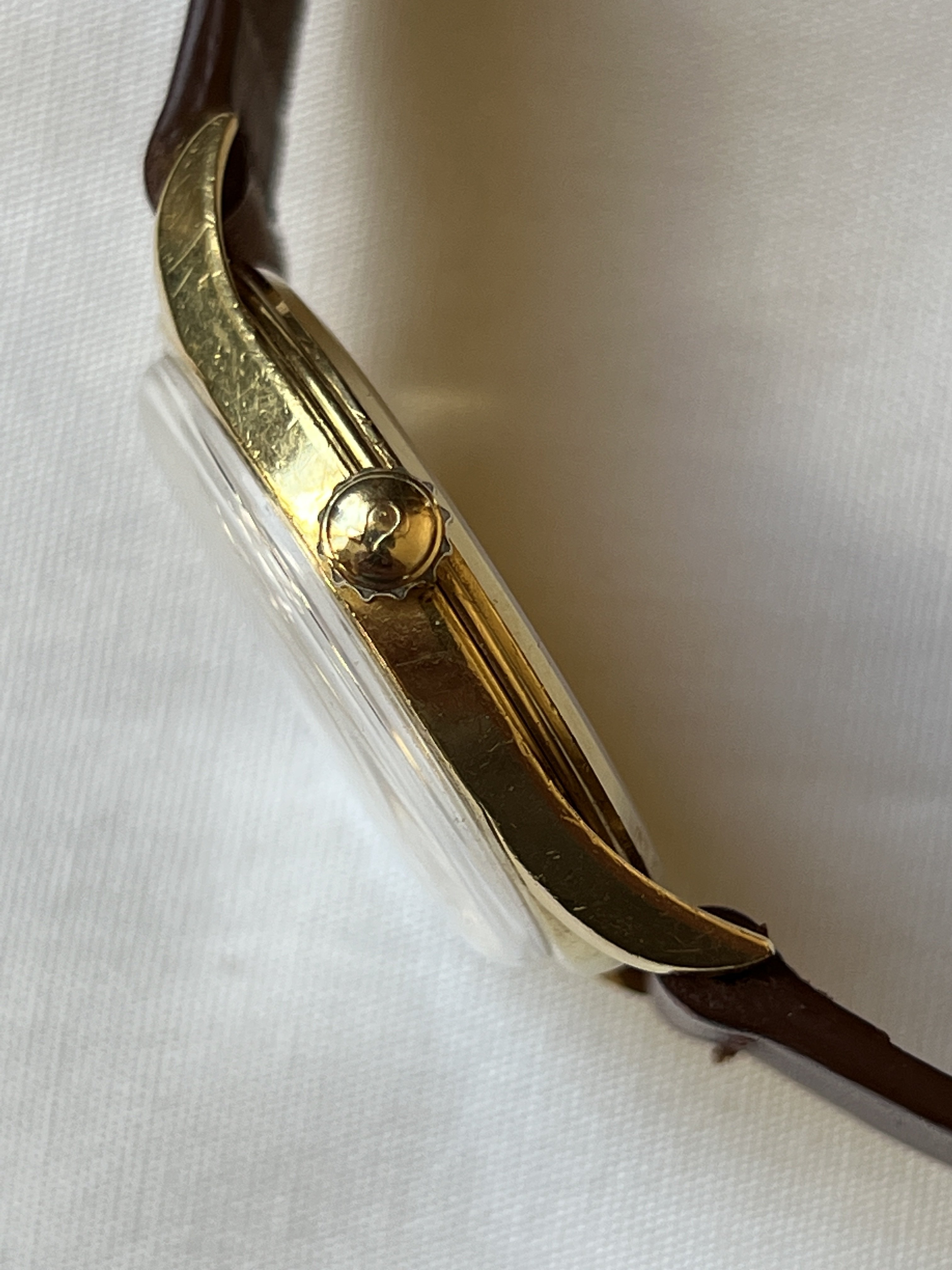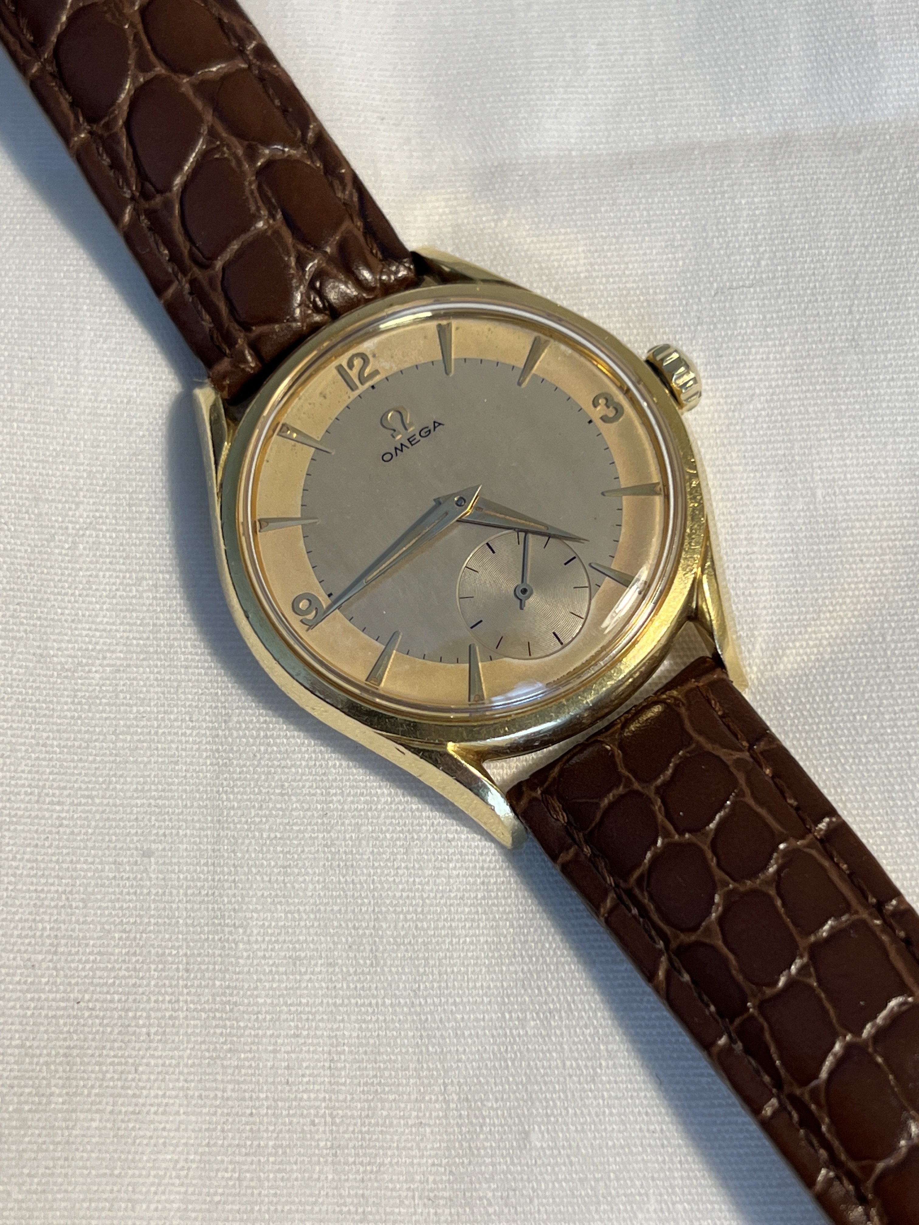 I had this one listed a while ago and thought I had it sold, but no dice. The watch dates from 1954 and is manual caliber 266. The case (model 2791) is solid 18k gold and is unpolished. The case back shows light marks, probably from having been worn on a bracelet at some point. The crown, dauphine hands, and two-tone dial are all original. The watch was serviced two years ago and is running great. Tough to get good pictures of this one - and as always, the macro photos drastically highlight the imperfections on the unpolished case - but it looks terrific on the wrist.