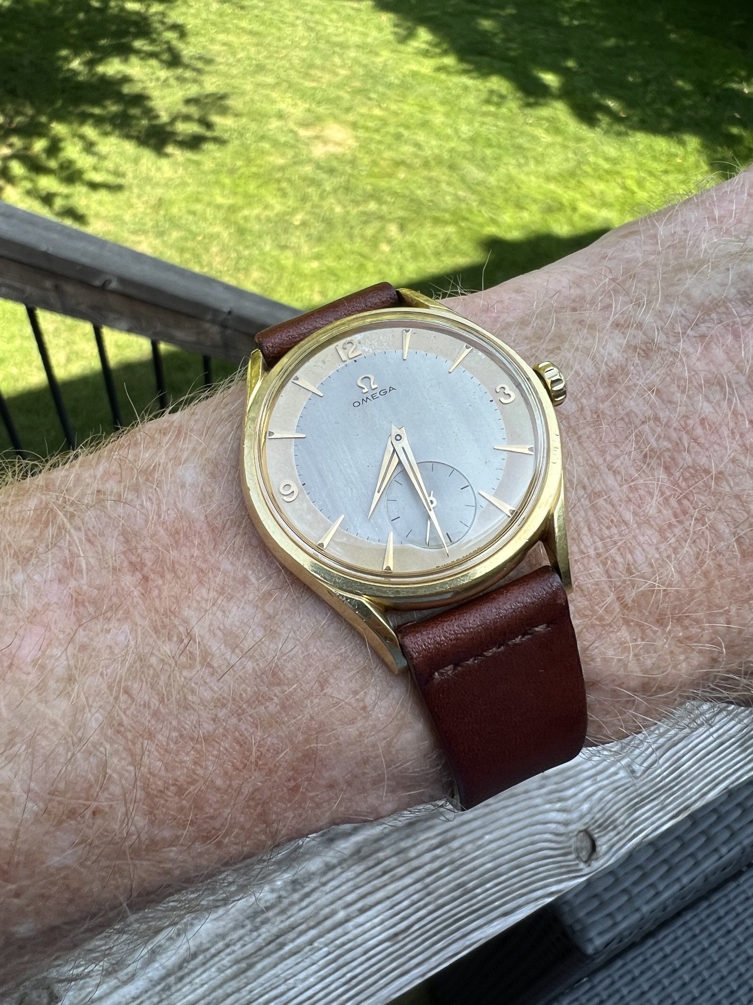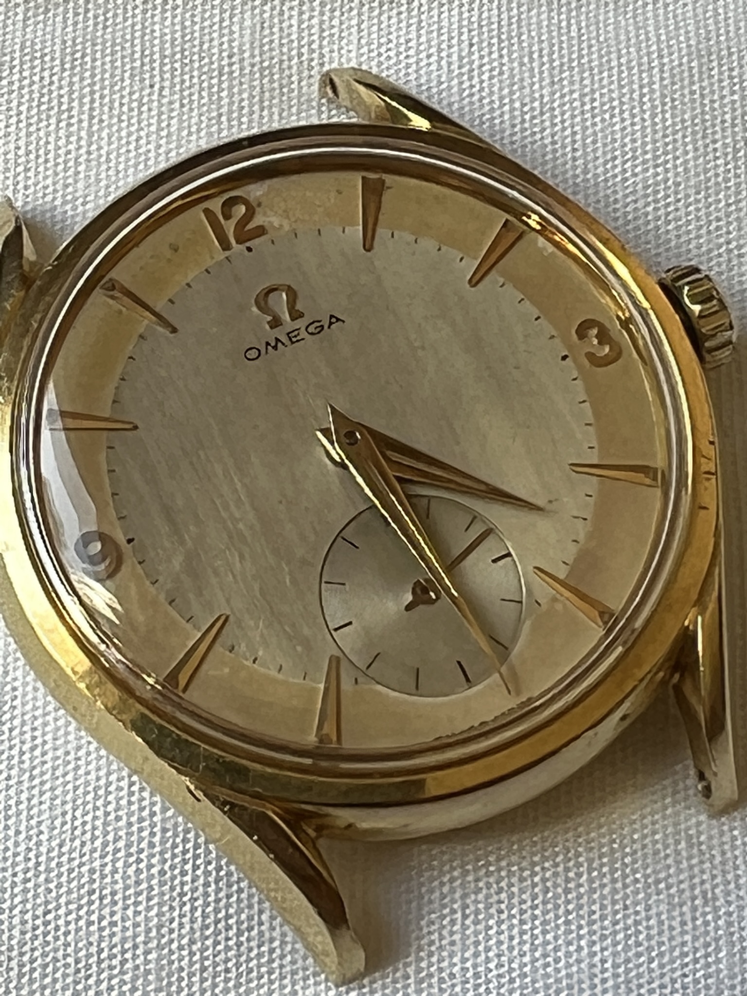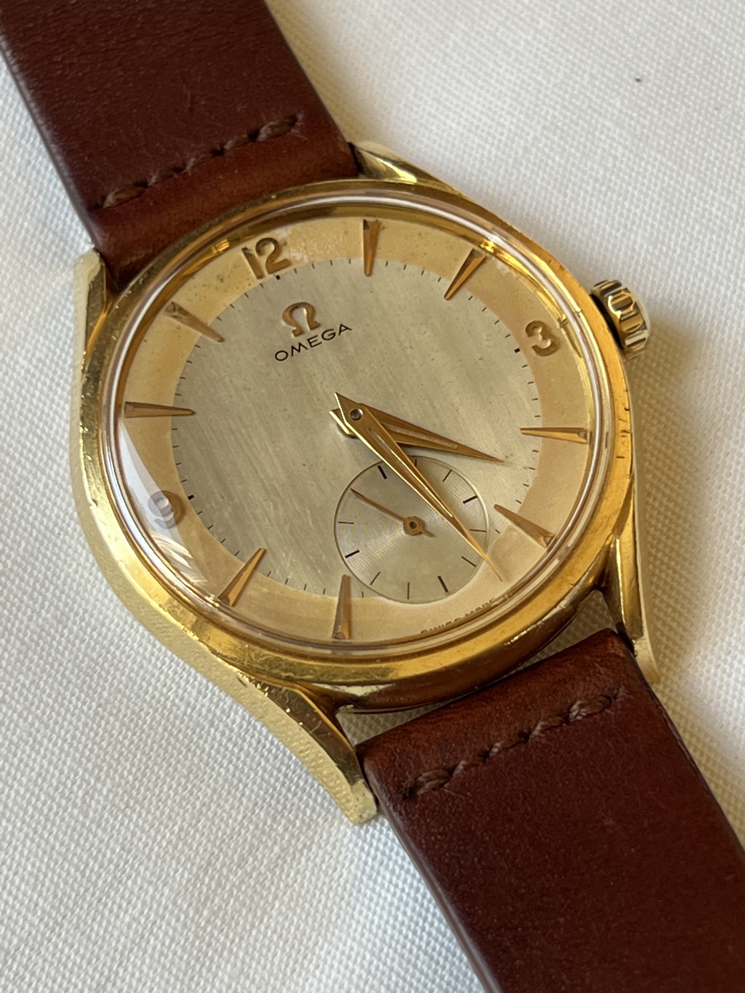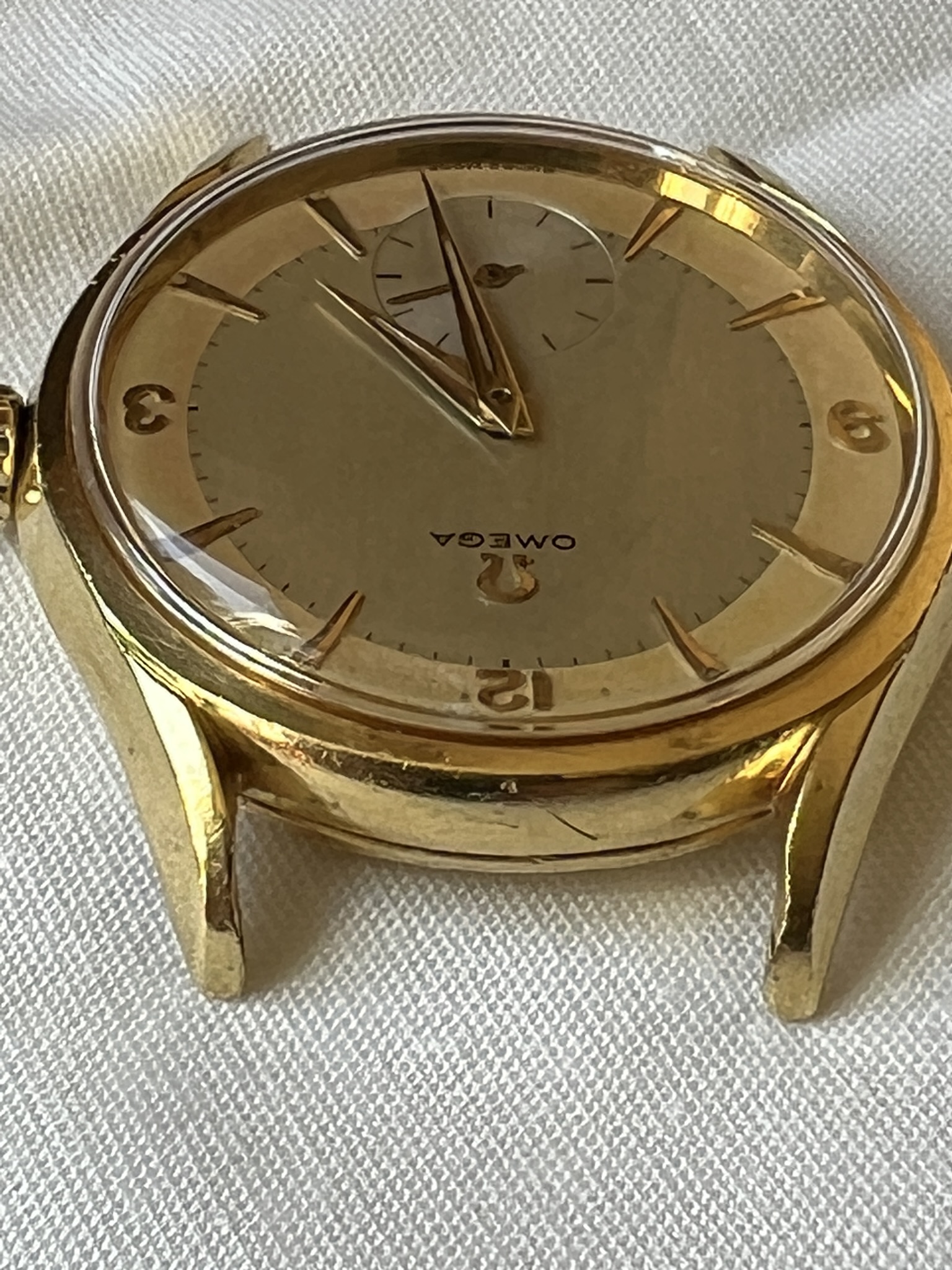 I had this one listed a while ago and thought I had it sold, but no dice. The watch dates from 1954 and is manual caliber 266. The case (model 2791) is solid 18k gold and is unpolished. The case back shows light marks, probably from having been worn on a bracelet at some point. The crown, dauphine hands, and two-tone dial are all original. The watch was serviced two years ago and is running great. Tough to get good pictures of this one - and as always, the macro photos drastically highlight the imperfections on the unpolished case - but it looks terrific on the wrist.